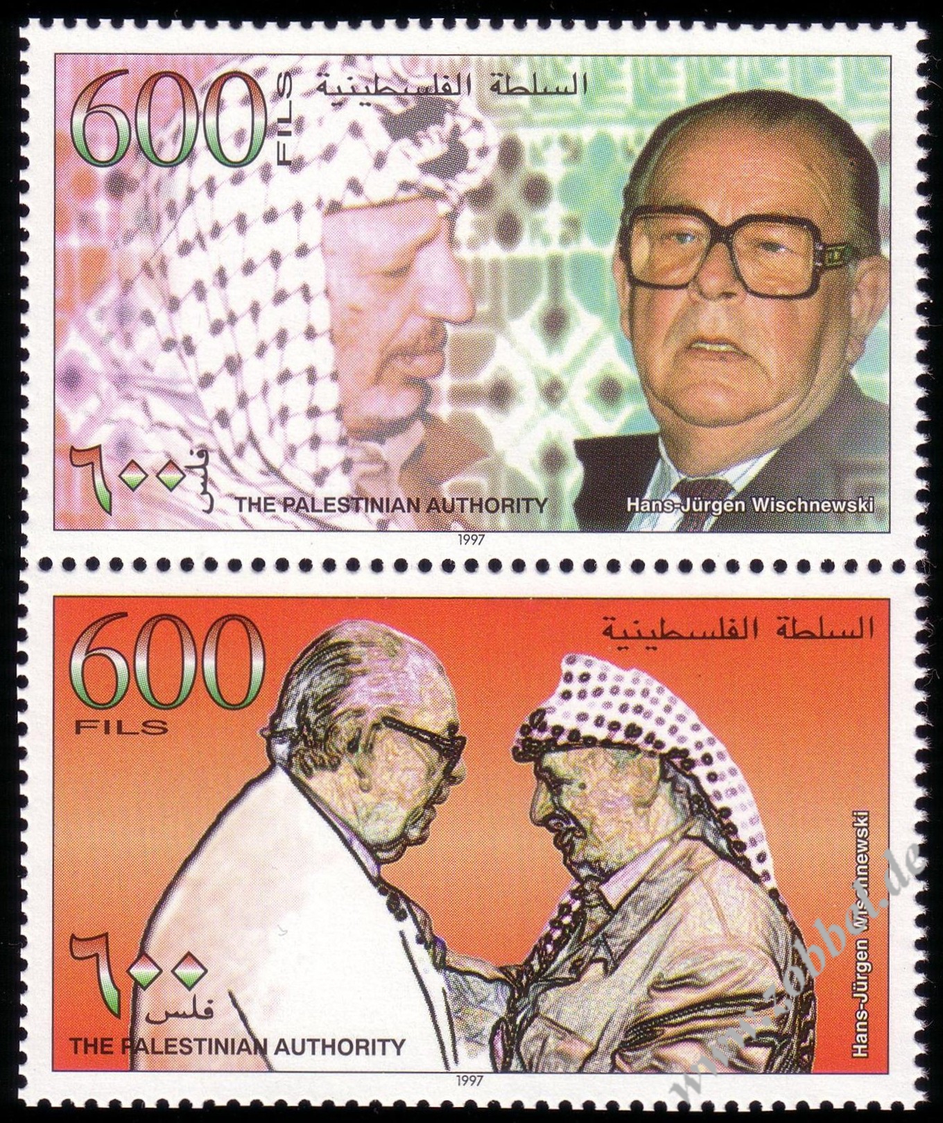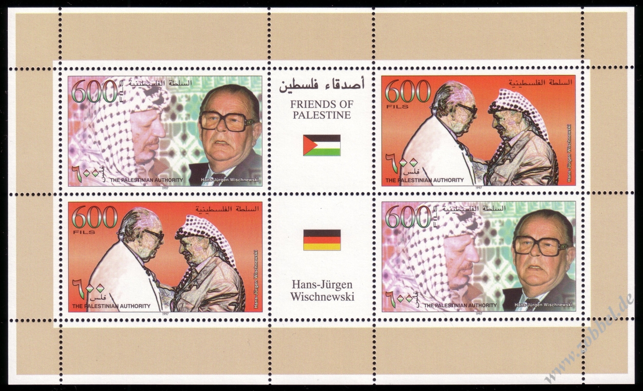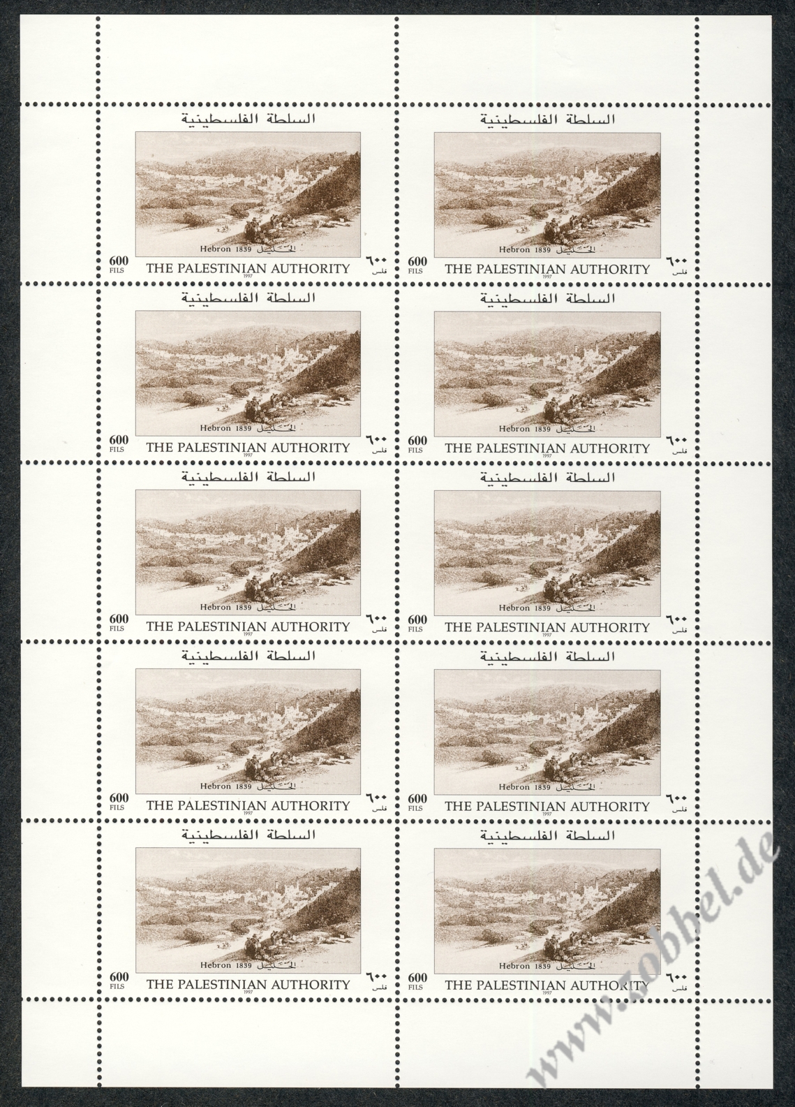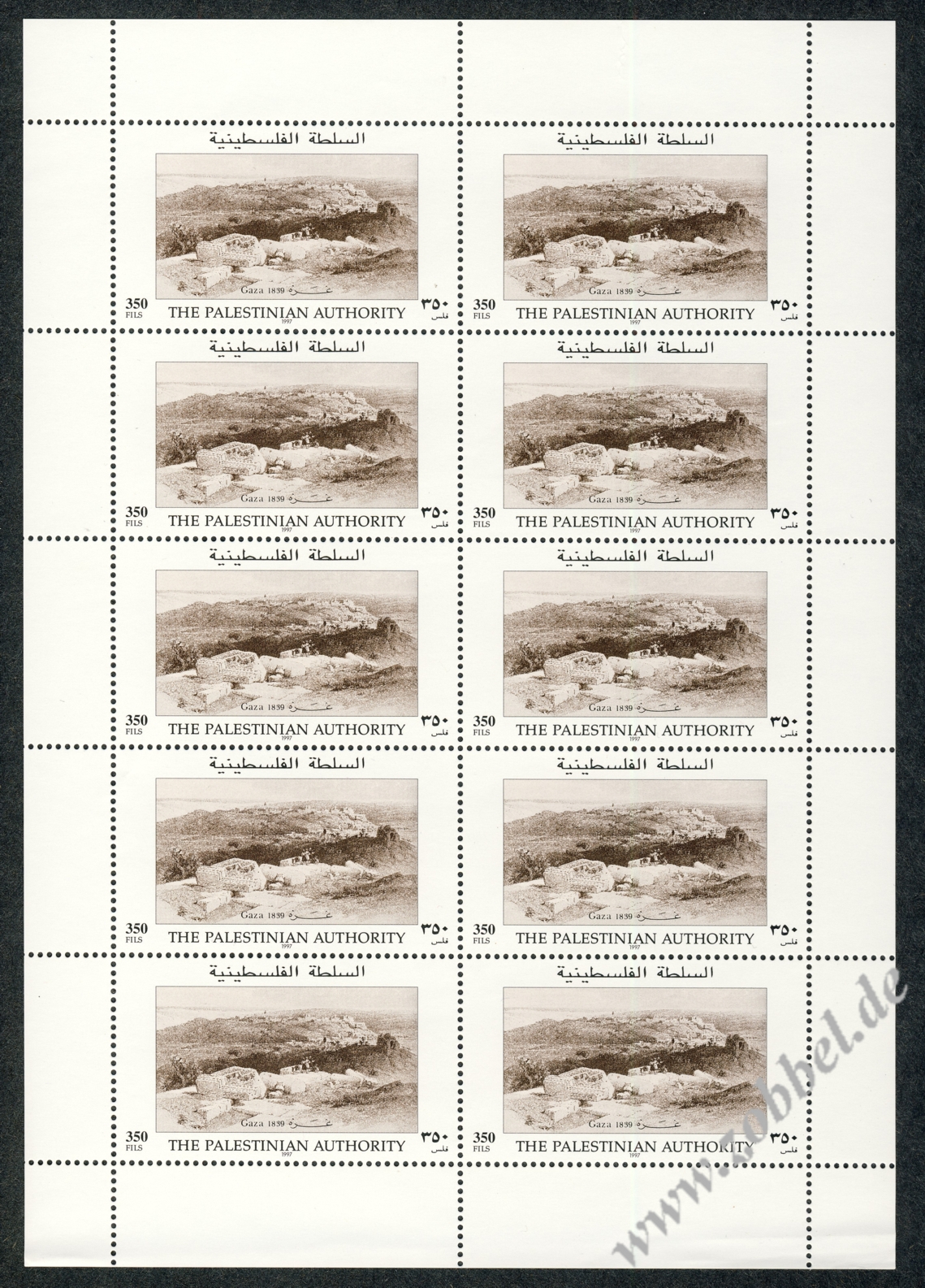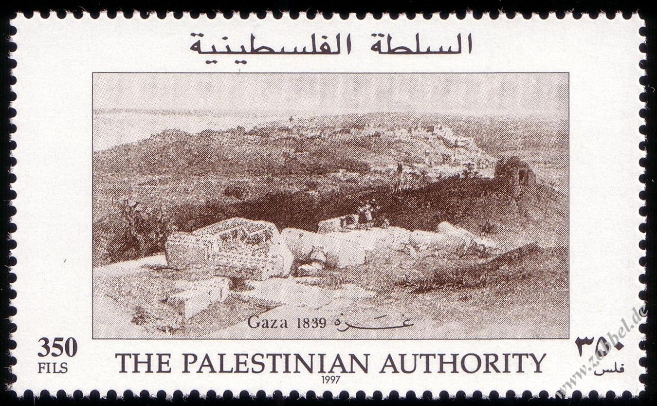 On 19.06.1997, Palestine issued a stamp series depicting historical vistas of the towns Gaza and Hebron, based on the Louis Haghe engravings of David Roberts' two pantings from his journey in 1839. The two stamps are denominated at 350 and 600 Fils and were printed by Bundesdruckerei GmbH Berlin in sheets of 10 (2x5). Total value: 950 Fils. Print run: unknown. Perforation: K 13.75:14.
