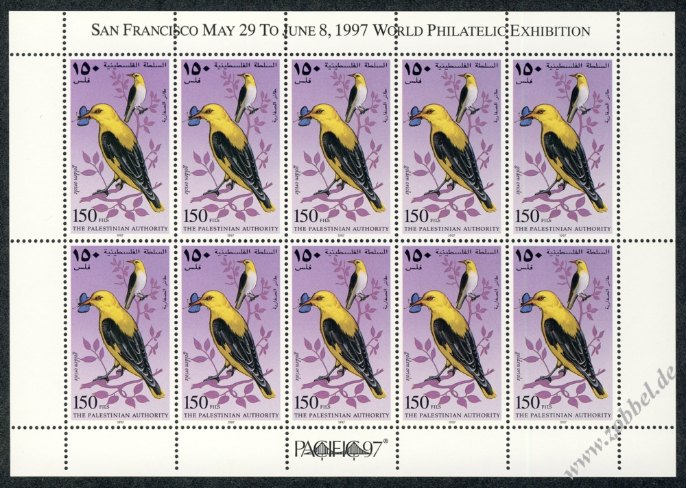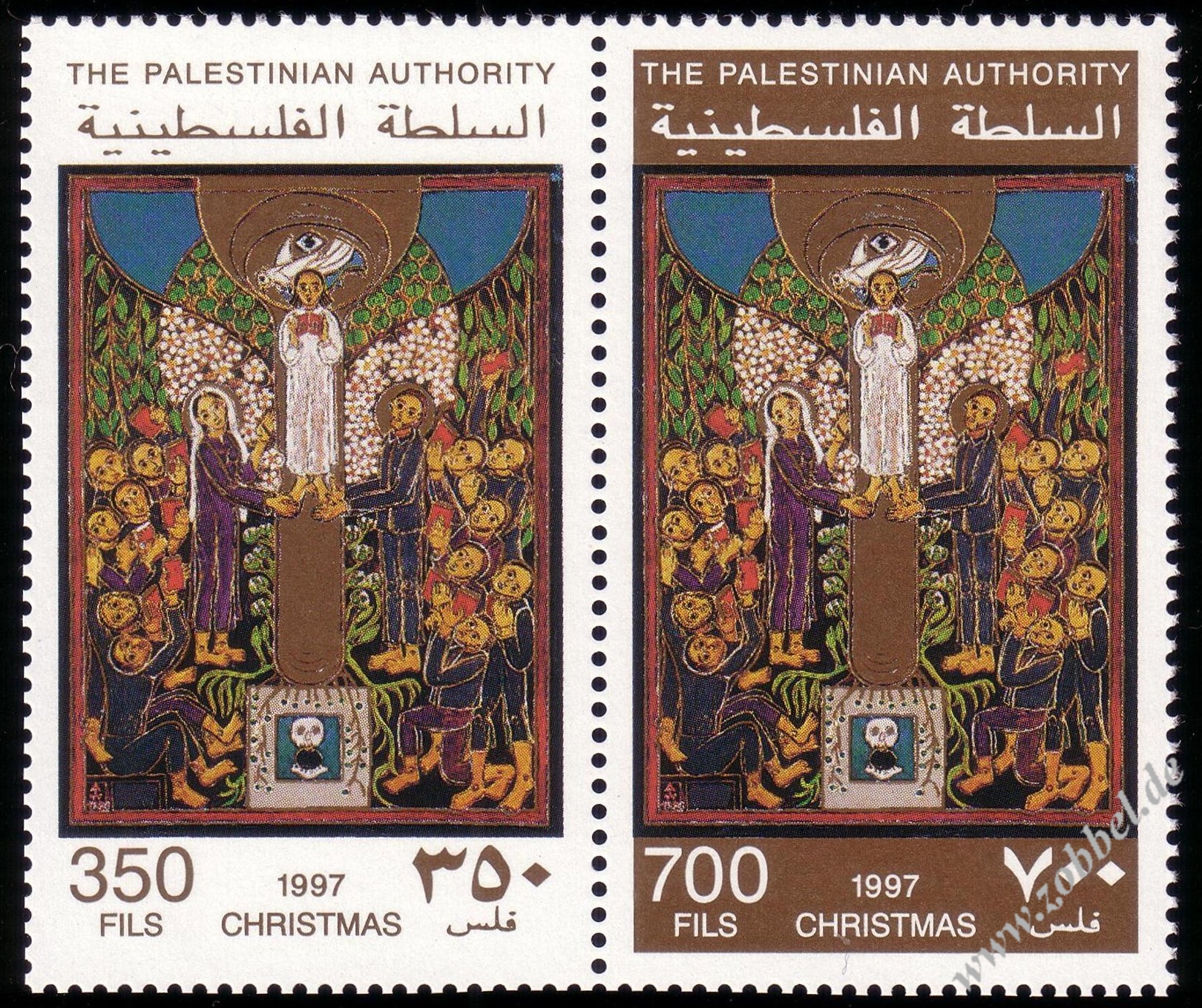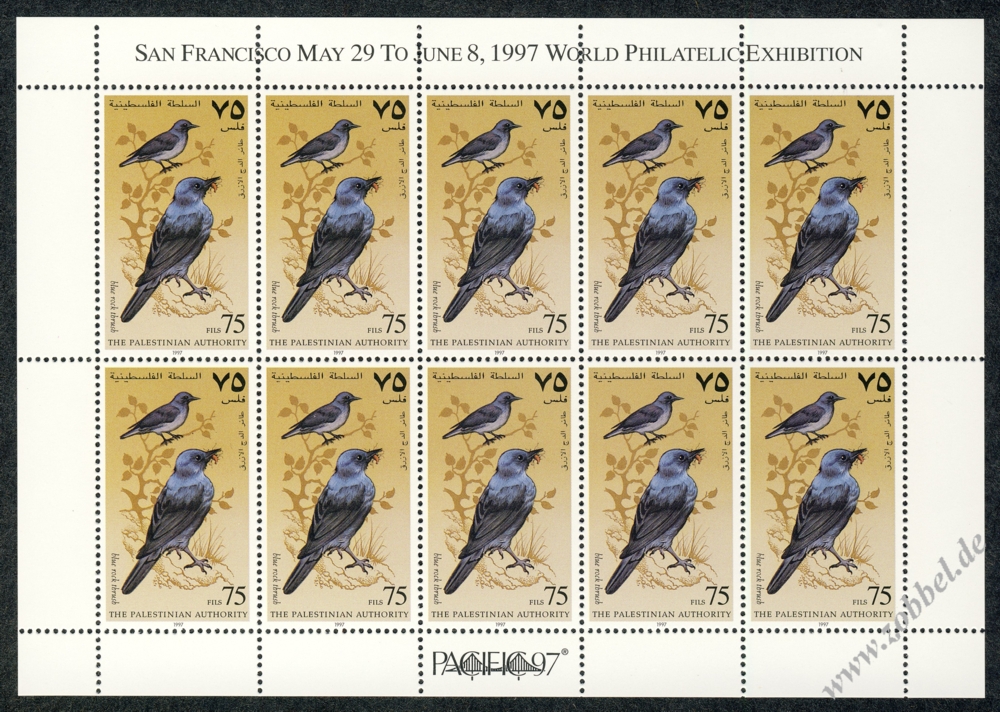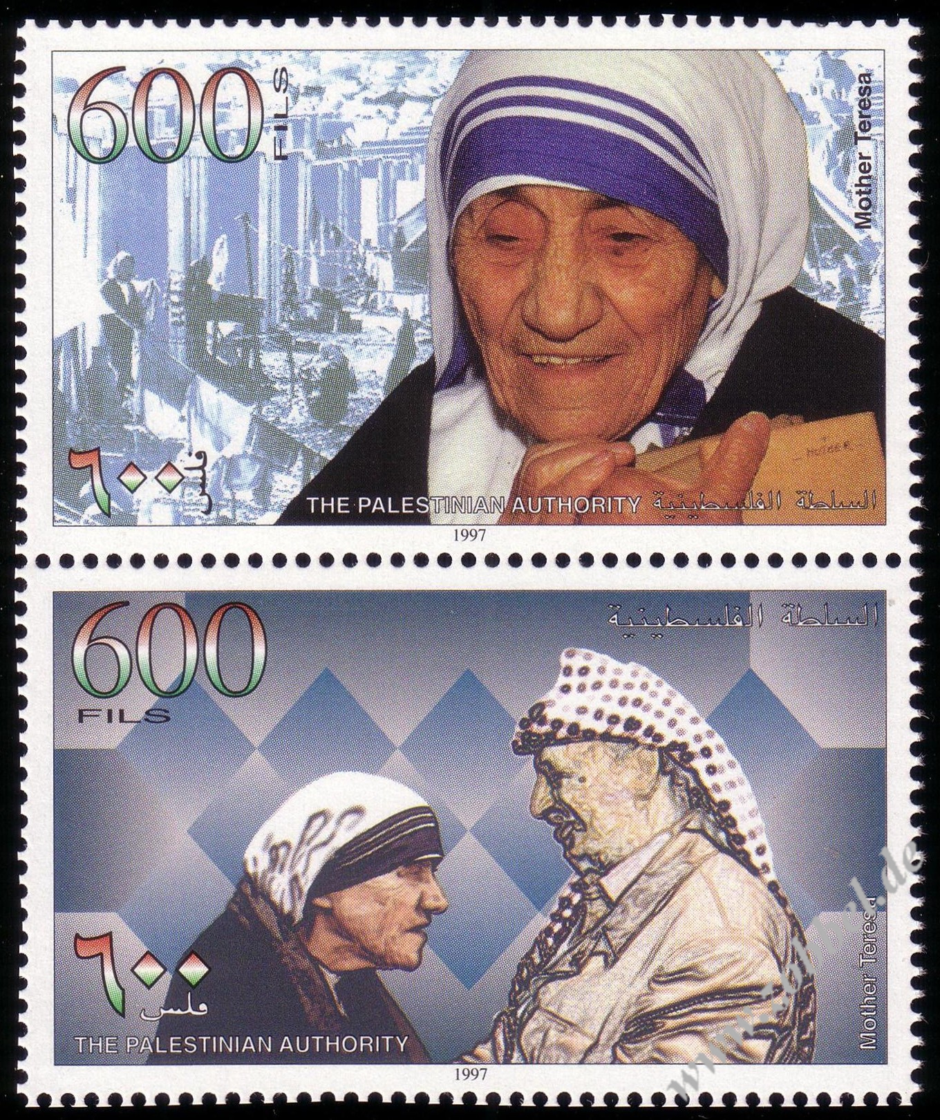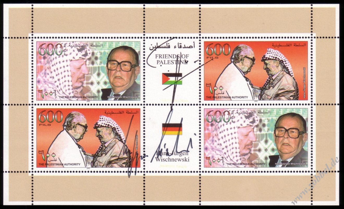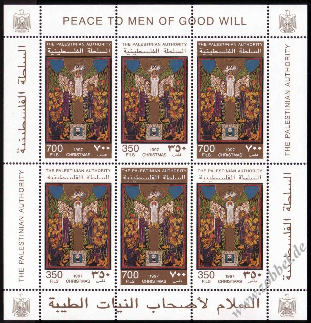 On 19.06.1997, Palestine issued a stamp series depicting historical vistas of the towns Gaza and Hebron, based on the Louis Haghe engravings of David Roberts' two pantings from his journey in 1839. The two stamps are denominated at 350 and 600 Fils and were printed by Bundesdruckerei GmbH Berlin in sheets of 10 (2x5). Total value: 950 Fils. Print run: unknown. Perforation: K 13.75:14.