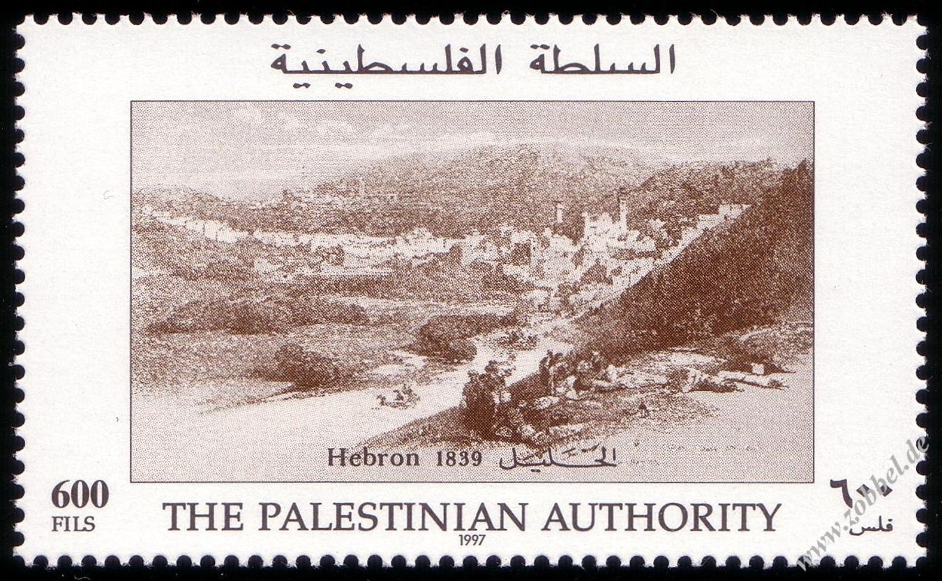 - Zobbel no. 73 (600f): "Hebron March 18th 1839" by David Roberts, RA (original painting: pencil and watercolour heightened with bodycolour, 320x490mm). Engraving by Louis Haghe, lithography, published in: 'David Roberts: The Holy Land, Syria, Idumea, Arabia, Egypt and Nubia,' vol.II, pl.55 (London: F.G. Moon, 1843).