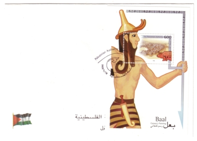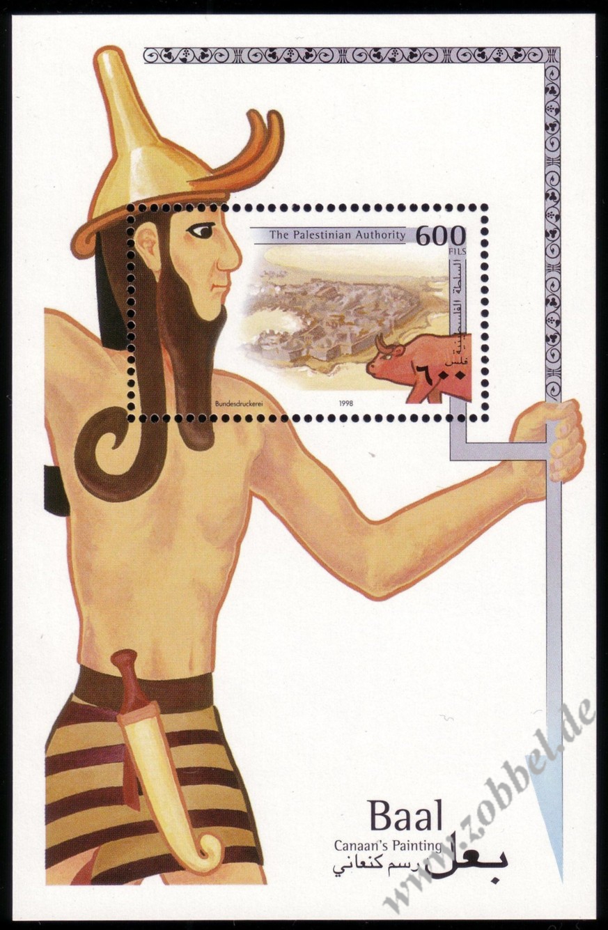 A block was issued on 15.06.1998 depicting a painting of the Canaanite god Baal, a bull and a Canaanite city.. It contains one stamp denominated at 600 Fils. The block was printed by Bundesdruckerei GmbH Berlin. Print run: unknown. Perforation: K 14.