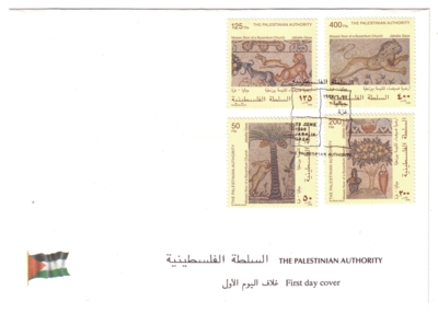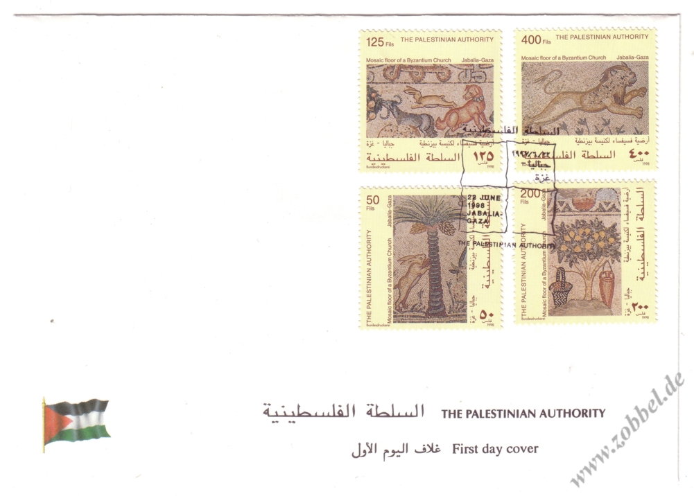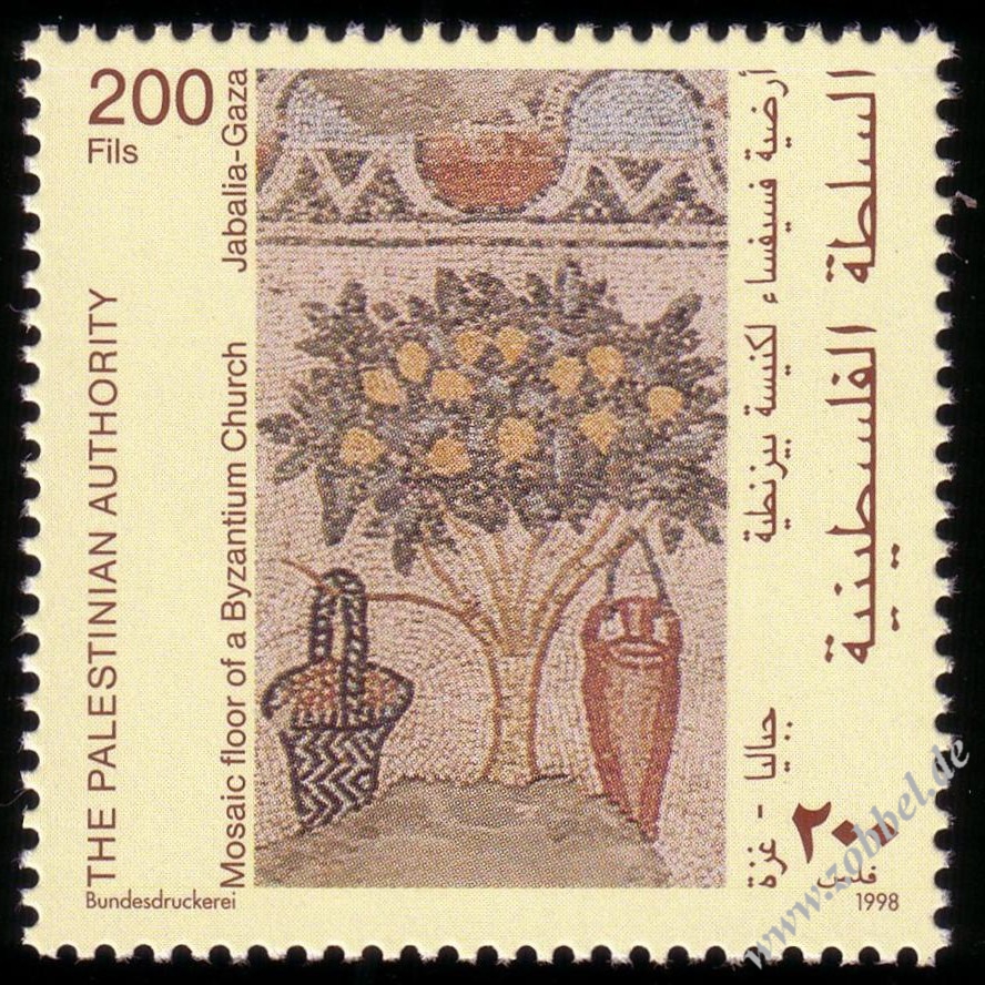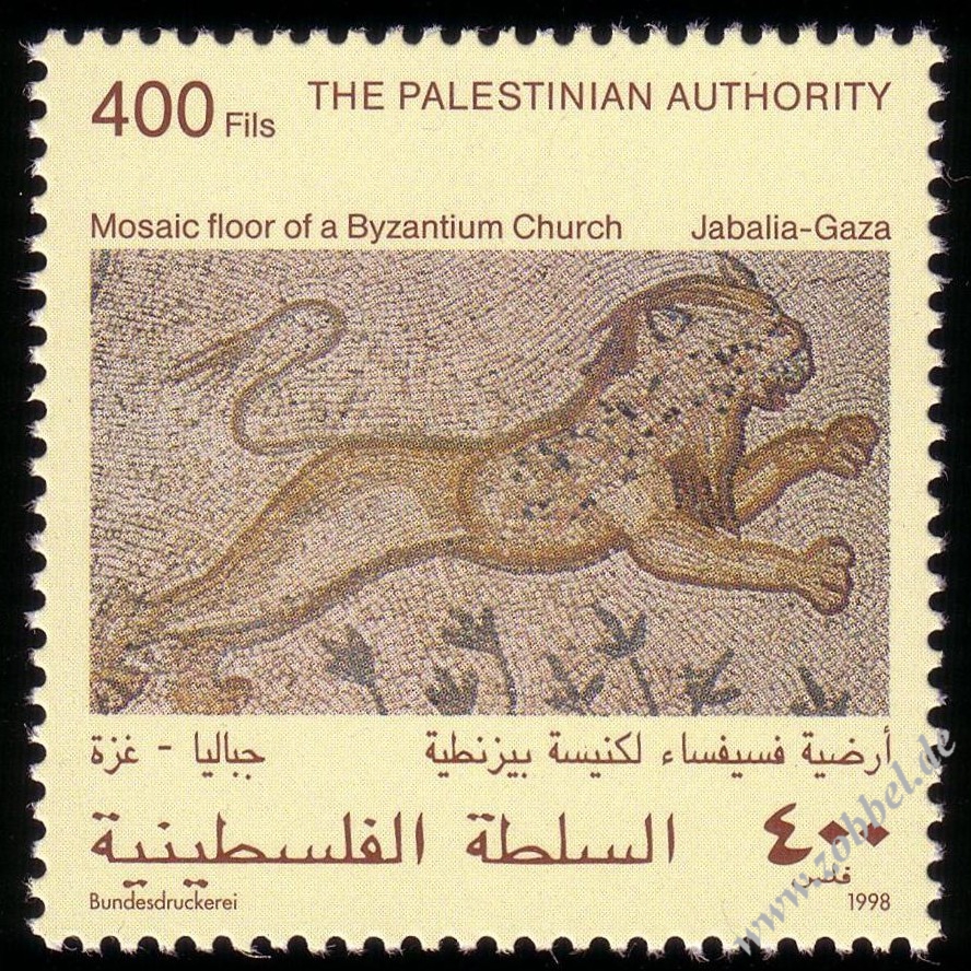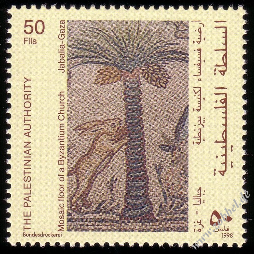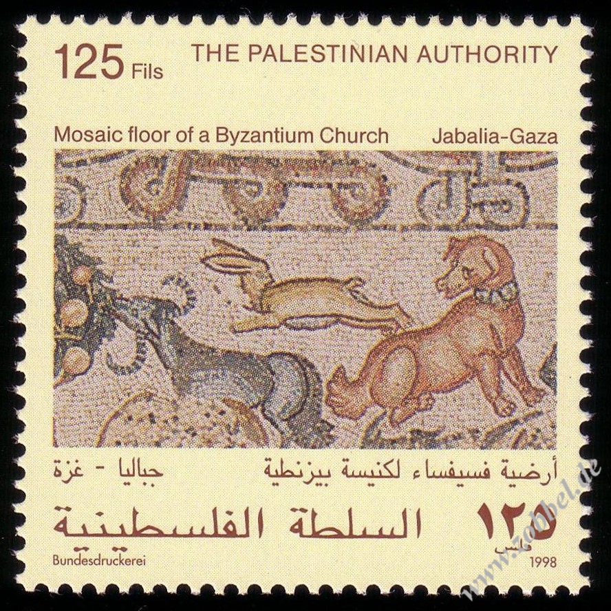 Palestine issued a stamp series on 22.06.1998 depicting scenes from a 6th century floor mosaic in the Byzantine church of St. Hilarion's monastery (Tel Umm el-'Amr, near Jabalia). The four stamps are denominated at 50, 125, 200, and 400 Fils and were printed by Bundesdruckerei GmbH Berlin in sheets of 10. Total value: 775 Fils. Print run: unknown. Perforation: K 13.75.