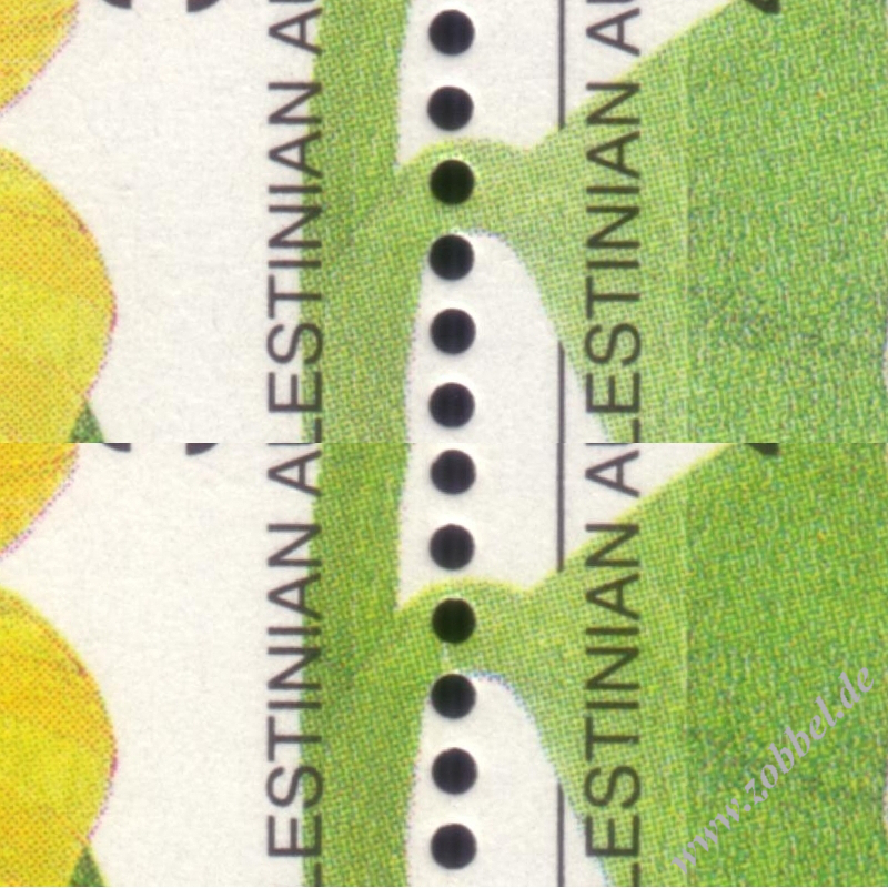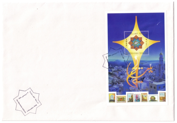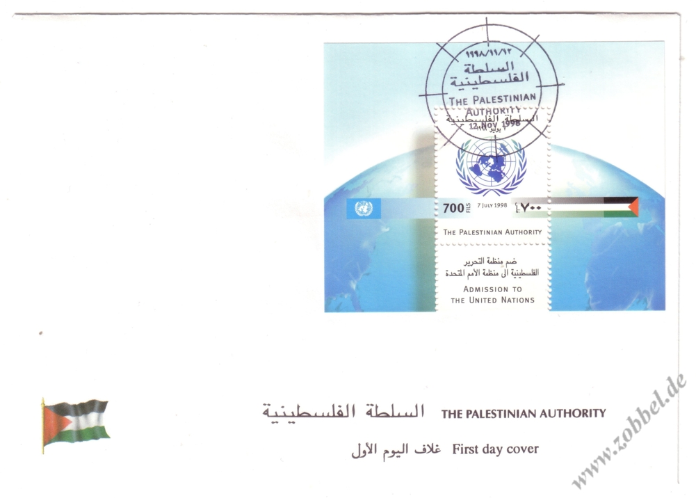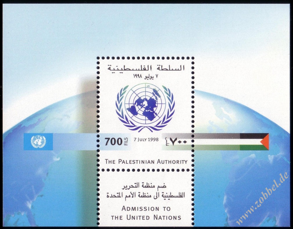 A block was issued on 12.11.1998 commemorating the admission of Palestine to the United Nations (referring to the broading of rights of the observer status of Palestine according to resolution A/RES/52/250 of 7.07.1998). It contains one stamp denominated at 700 Fils. The block was printed by Bundesdruckerei GmbH Berlin. Print run: unknown. Perforation: K 14. External Links: