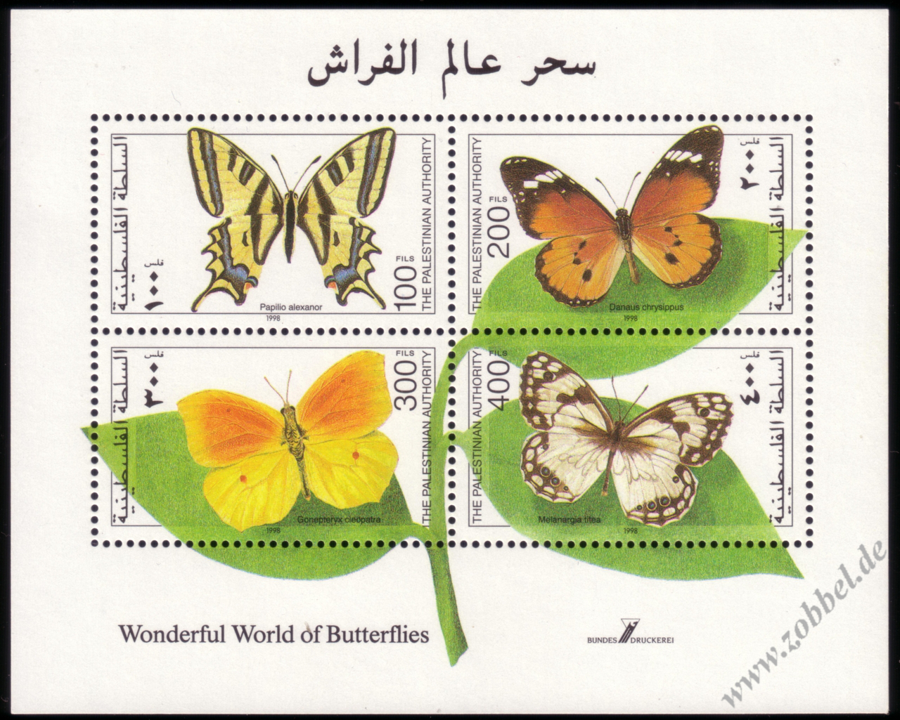 A block was issued on 3.12.1998 under the title "Wonderful World Of Butterflies" depicting four butterflies native to Palestine: