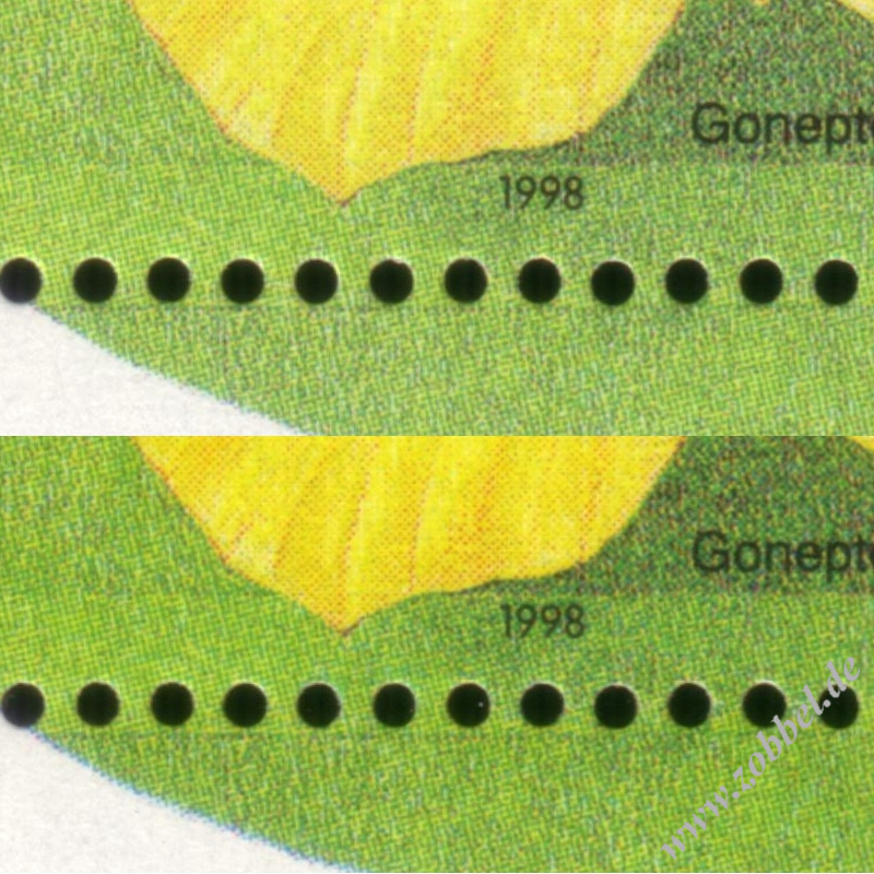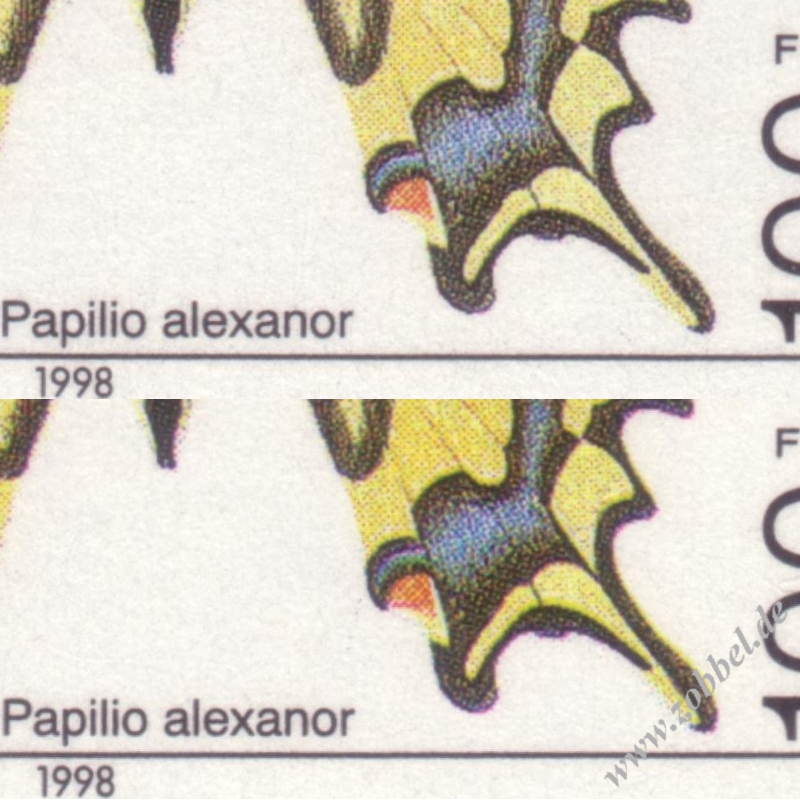 This block is reported with changes in colour saturation incidental to the printing process. The illustrations shown below (scanned in one go) were selected from a run of 100 blocks (one whole package) to show the two extreme ends of the variations found. The variation is markedly less visible than with the 1996 Elections block.