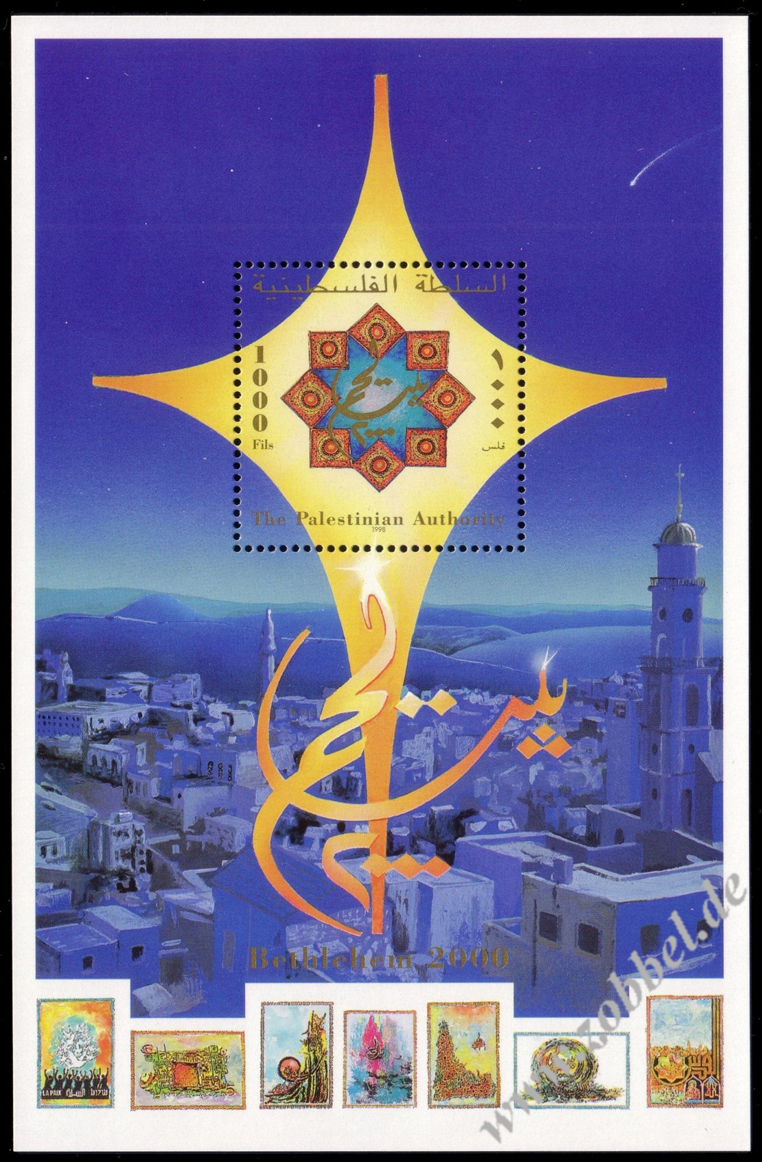 The 1998 Christmas block was issued on 3.12.1998 commemorating also the start of the "Bethlehem 2000" projects. "Bethelehem 2000" refers to a broader campaign to prepare for the 2000th anniversary celebrations, but also to the specific UN and World Bank development projects (see links below). The block contains one stamp denominated at 1,000 Fils and was printed by Bundesdruckerei GmbH Berlin. Print run: unknown. Perforation: K 13.75.
