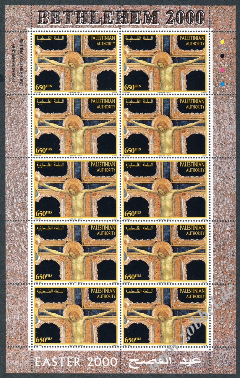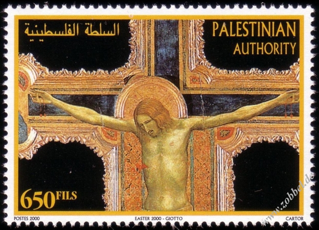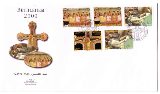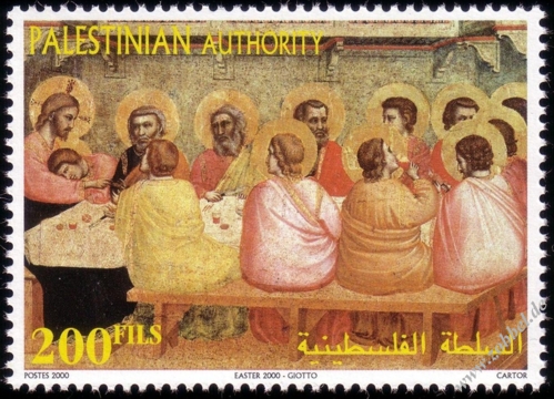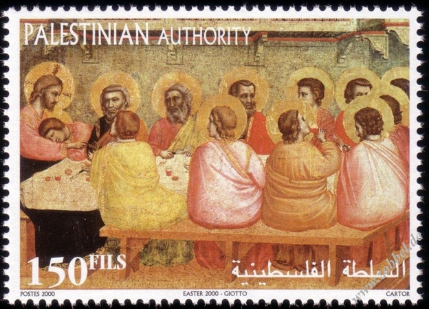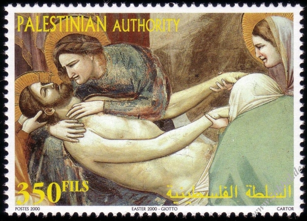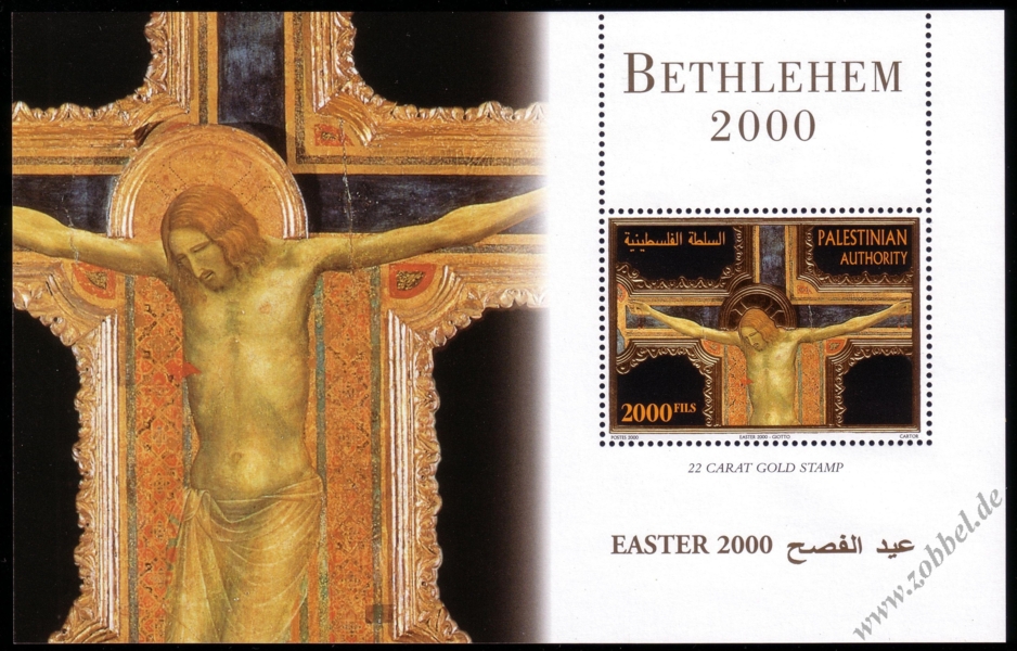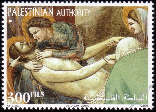 Palestine issued a stamp series on 23.04.2000 commemorating Easter as well as the celebrations "Bethlehem 2000": the five stamps (denominations: 150, 200, 300, 350, and 650 Fils) and the block (2,000 Fils) depict three more Giotto works. The stamps were printed by Cartor Securty Printing, La Loupe (France) in sheets of 10 (2x5). Total value: 3,750 Fils. Print run: unknown. Perforation: K 13.25