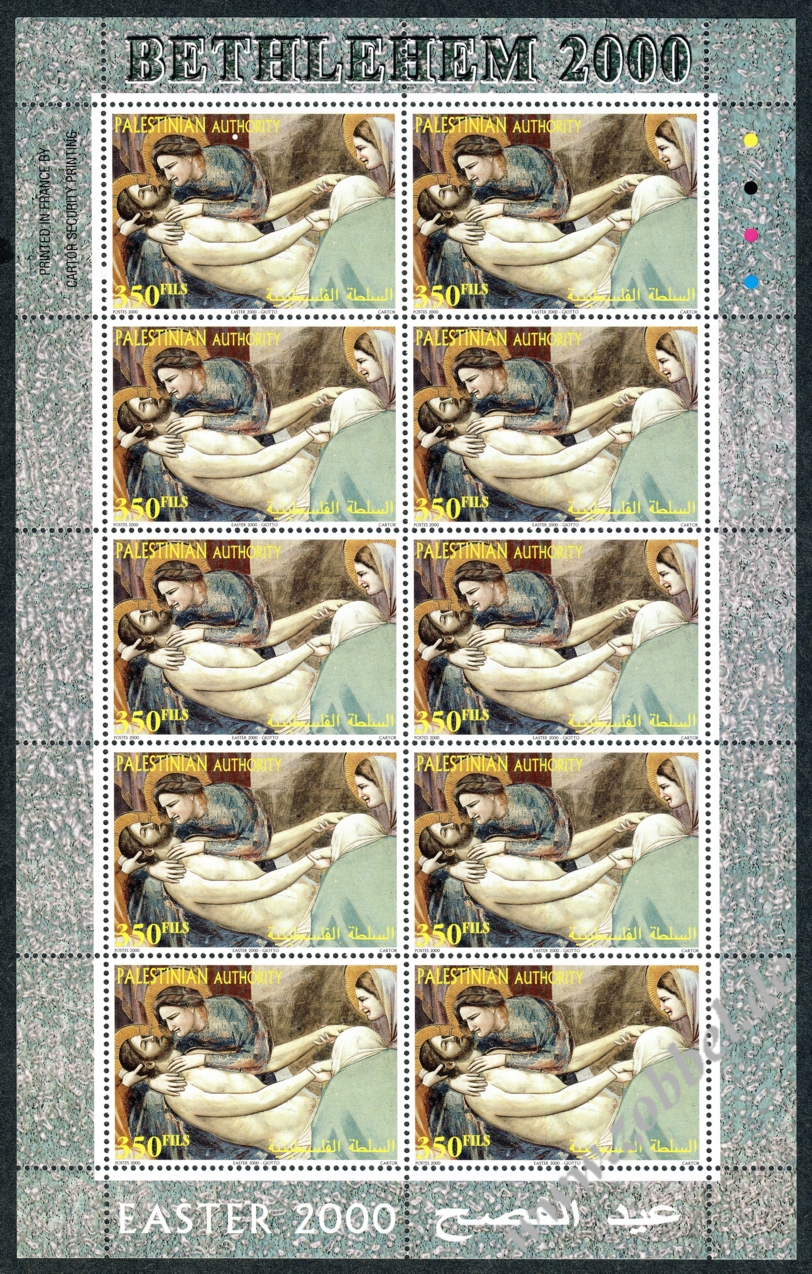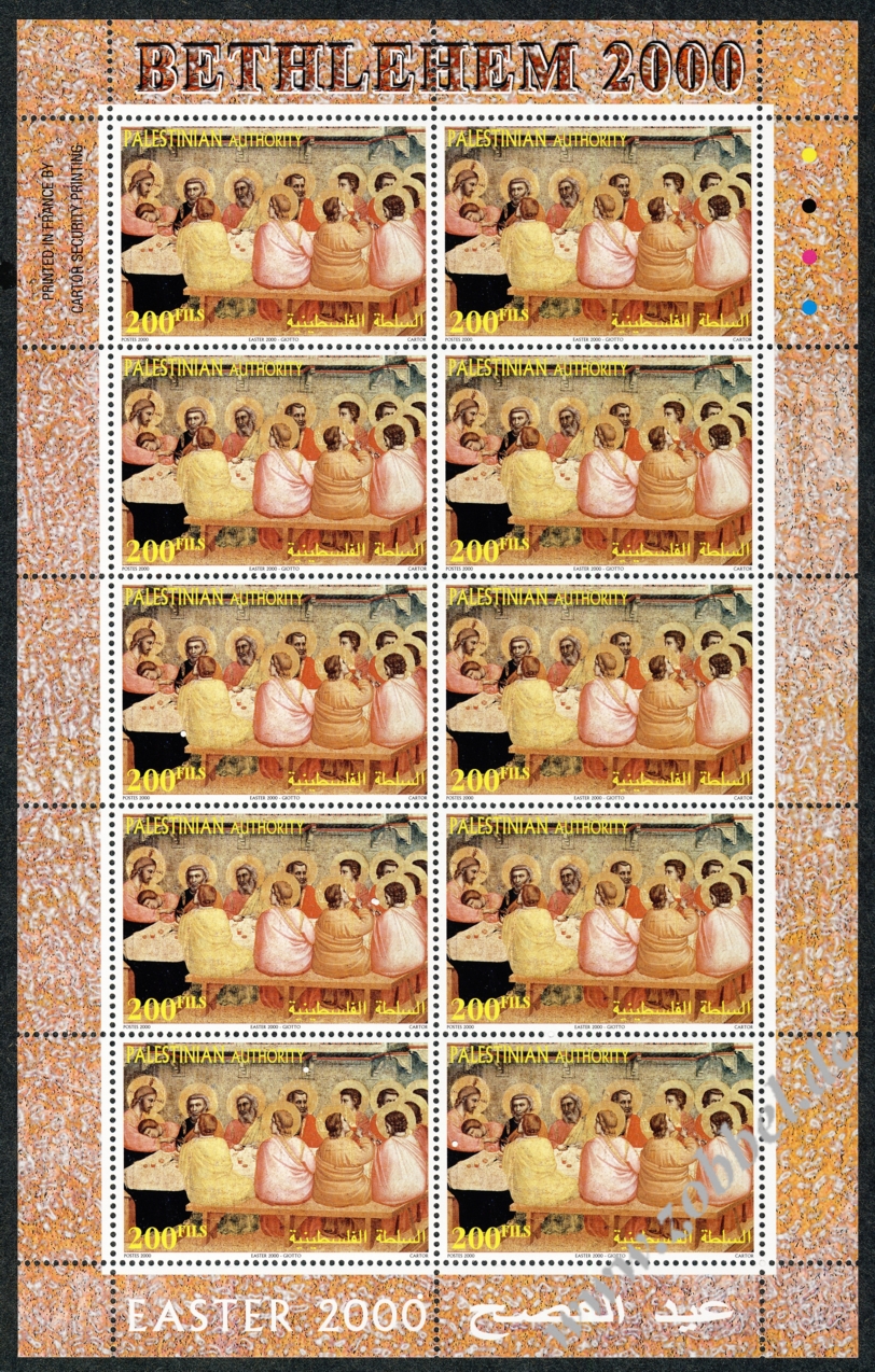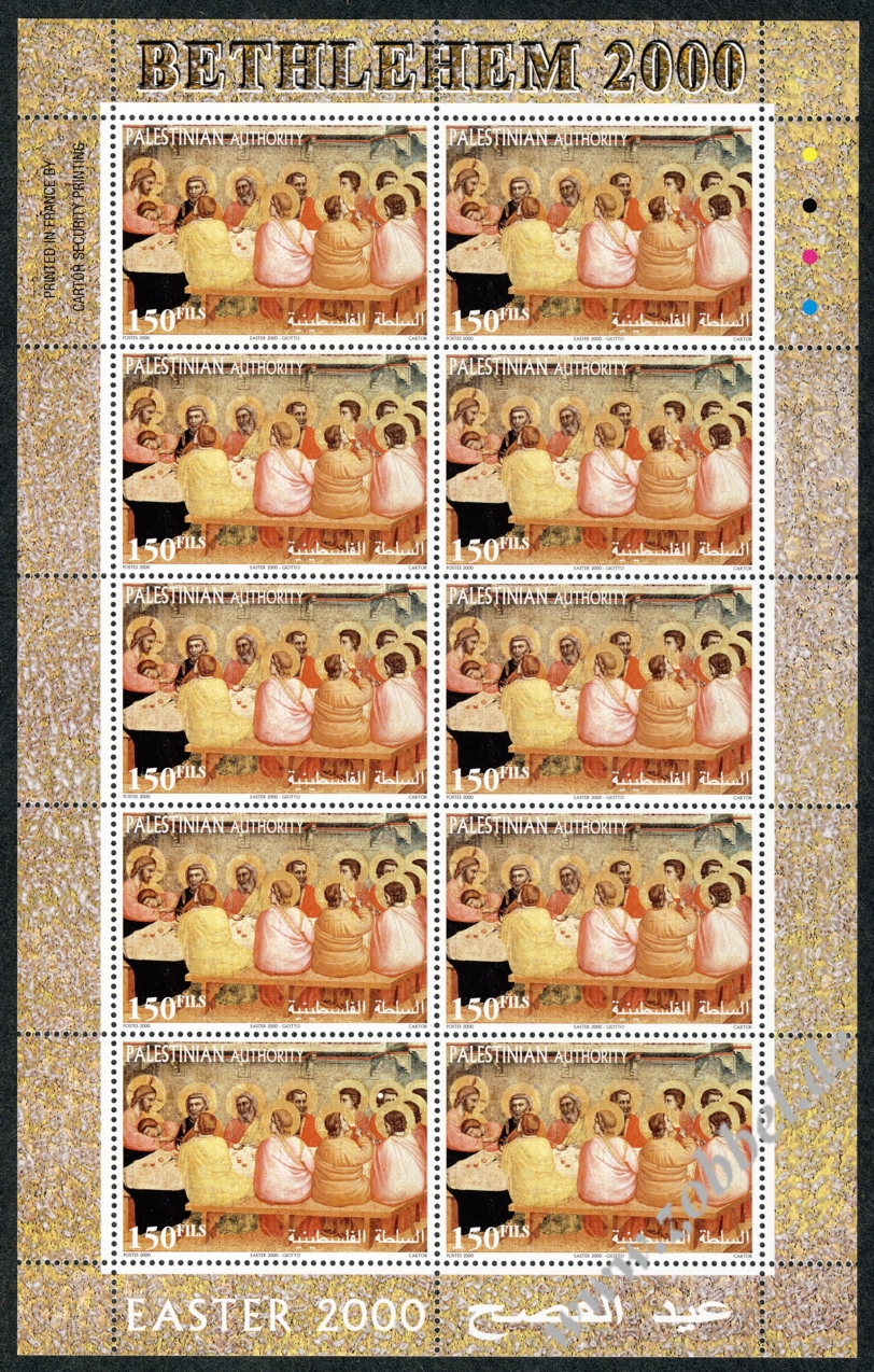 Palestine issued a stamp series on 23.04.2000 commemorating Easter as well as the celebrations "Bethlehem 2000": the five stamps (denominations: 150, 200, 300, 350, and 650 Fils) and the block (2,000 Fils) depict three more Giotto works. The stamps were printed by Cartor Securty Printing, La Loupe (France) in sheets of 10 (2x5). Total value: 3,750 Fils. Print run: unknown. Perforation: K 13.25
