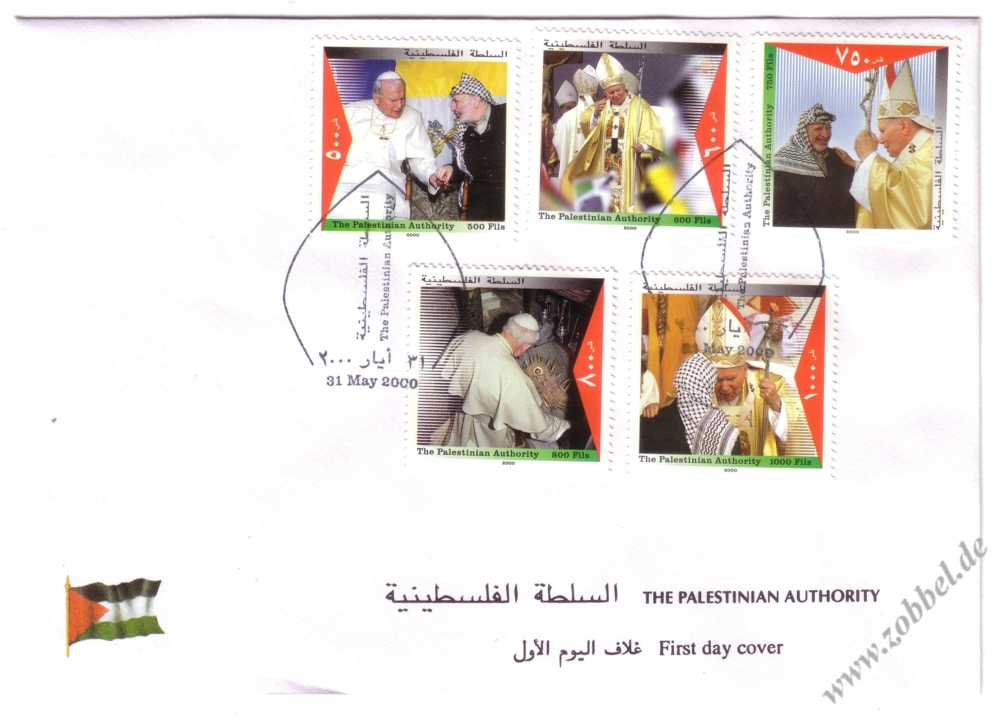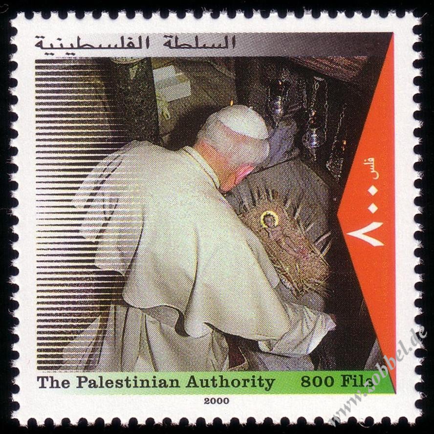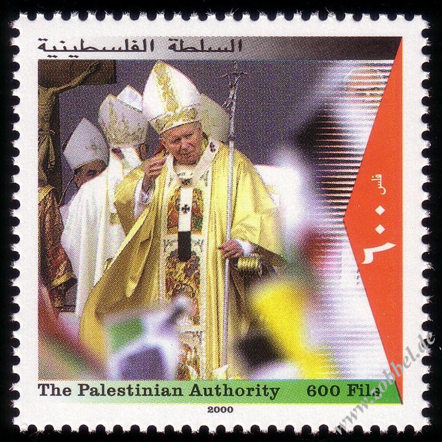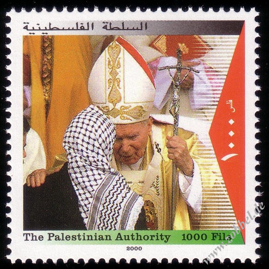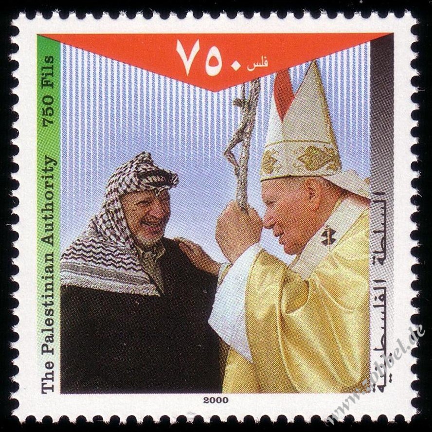 On 31.05.2000 Palestine issued a series of stamps commemorating the "Pilgrimage to the Holy Land" (20–26.03.2000) of Pope John Paul II. to Jordan, Palestine, and Israel. The five stamps, denominated at 500, 600, 750, 800, and 1,000 Fils (total value: 3,650 Fils) depict the Pope meeting President Arafat (500, 750, and 1,000 Fils), the Pope holding mass (600 Fils), and contemplating in the Grotto of the Nativity in Bethlehem.