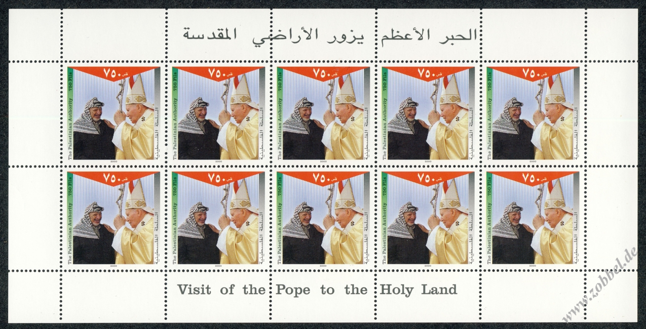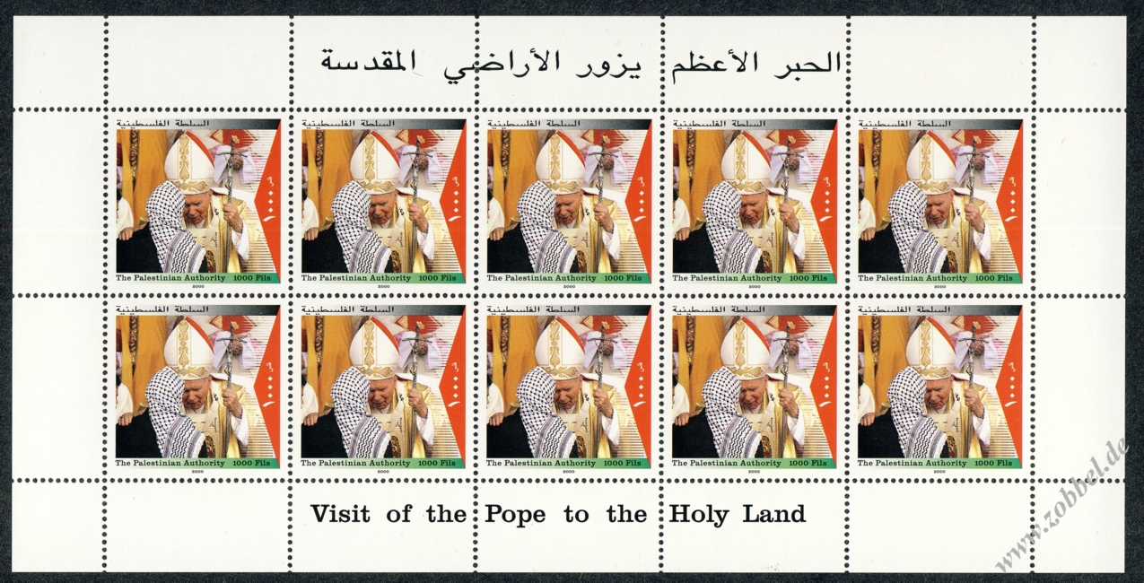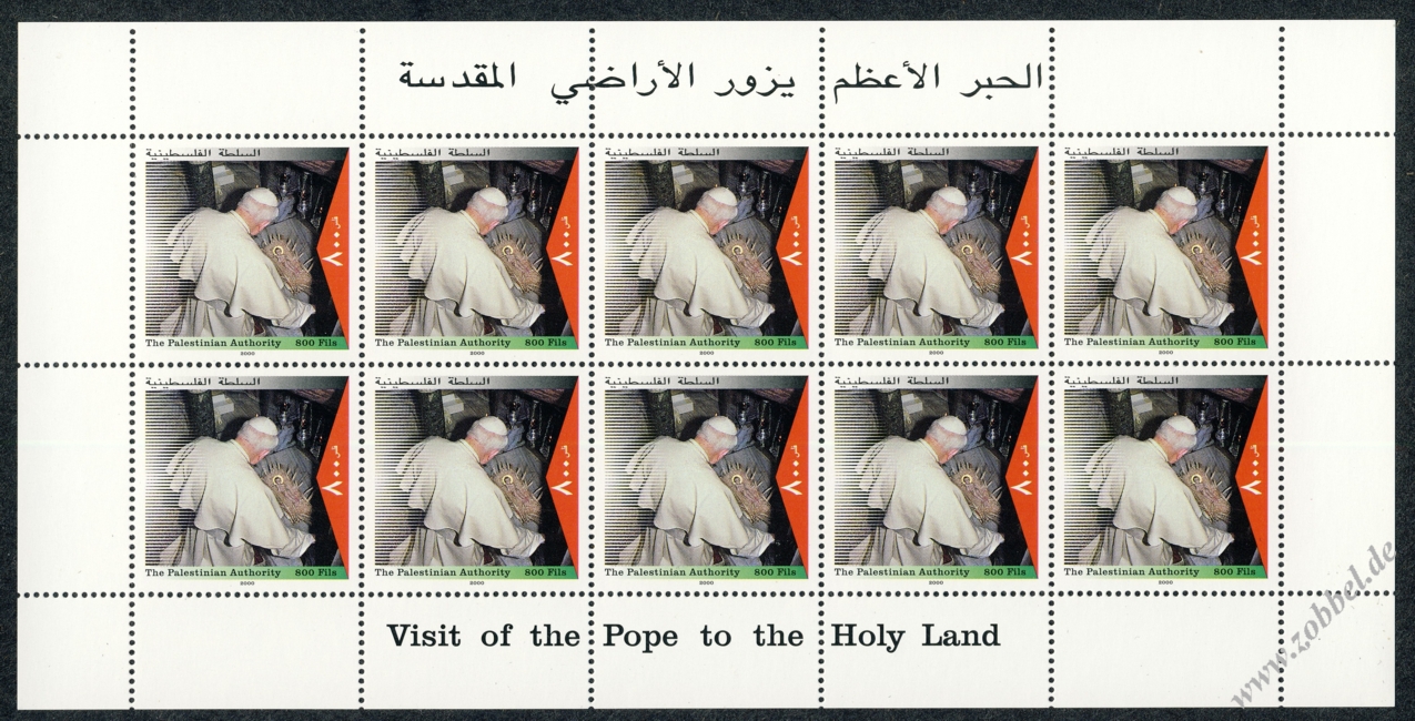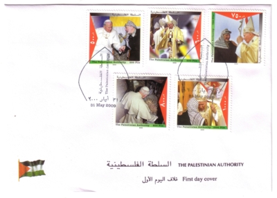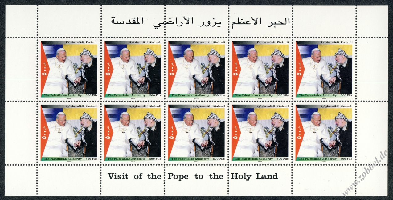 On 31.05.2000 Palestine issued a series of stamps commemorating the "Pilgrimage to the Holy Land" (20–26.03.2000) of Pope John Paul II. to Jordan, Palestine, and Israel. The five stamps, denominated at 500, 600, 750, 800, and 1,000 Fils (total value: 3,650 Fils) depict the Pope meeting President Arafat (500, 750, and 1,000 Fils), the Pope holding mass (600 Fils), and contemplating in the Grotto of the Nativity in Bethlehem.