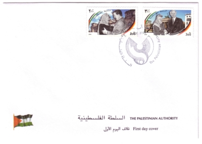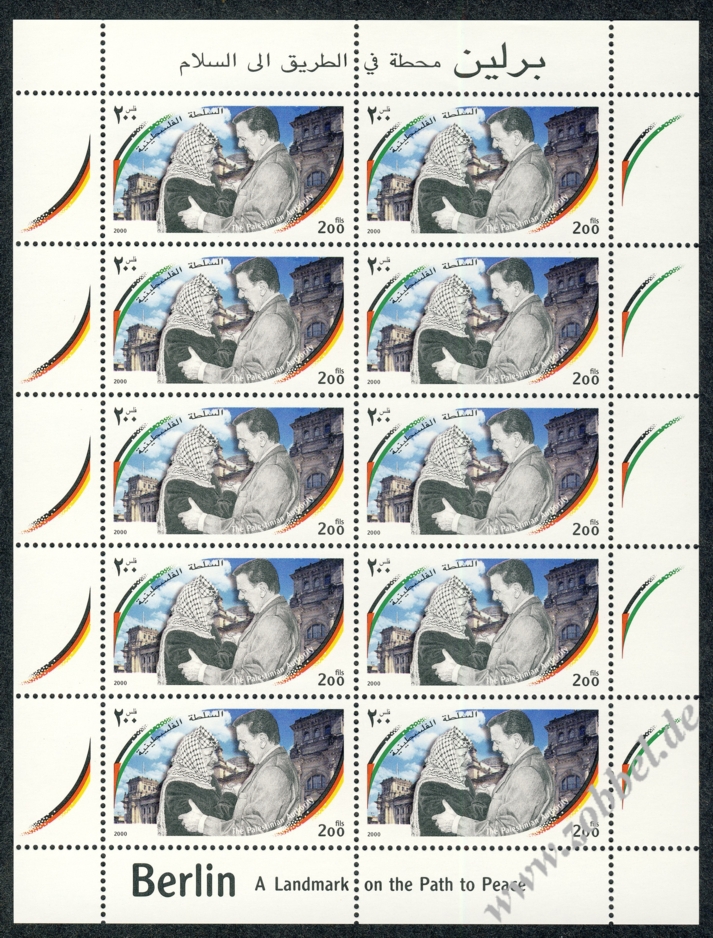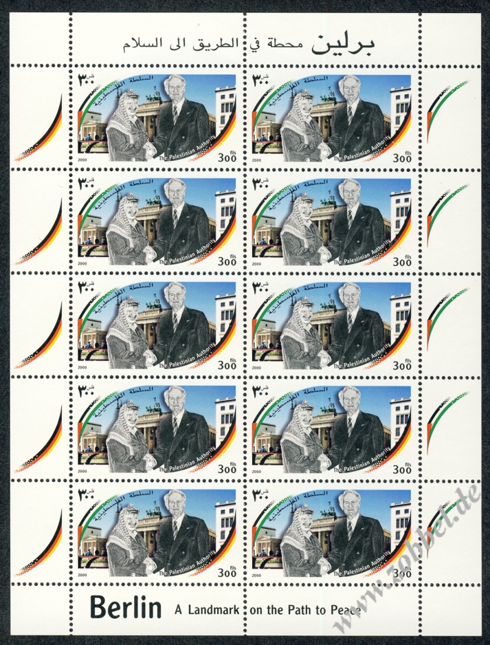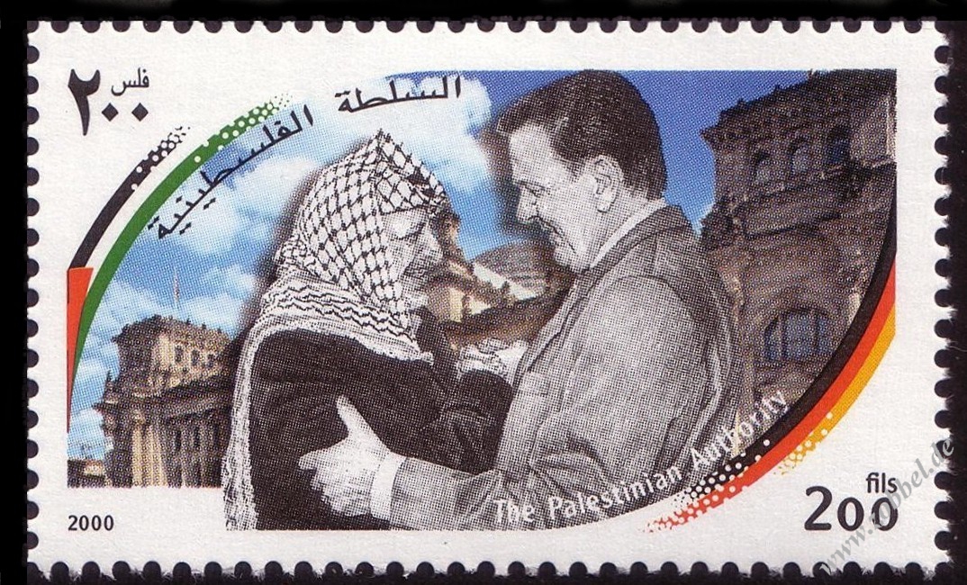A series of two stamps was issued on 21.08.2000 commemorating the state visit of President Yasir Arafat to Germany, the stamps depict Arafat meeting Chancellor Gerhard Schröder (*1944) and Federal President Johannes Rau (1931–2006) and are headed "Berlin – A Landmark on the Path to Peace". The two stamps are denominated at 200 and 300 Fils, respectively, the total value is 500 Fils. They were printed by Bundesdruckerei GmbH Berlin in sheets of 10 (2x5). Print run: unknown. Perforation: K 14.
