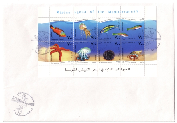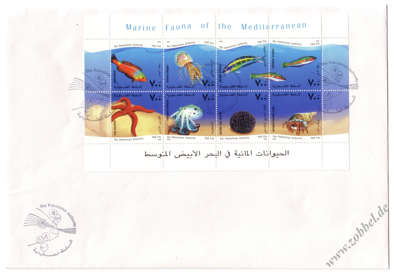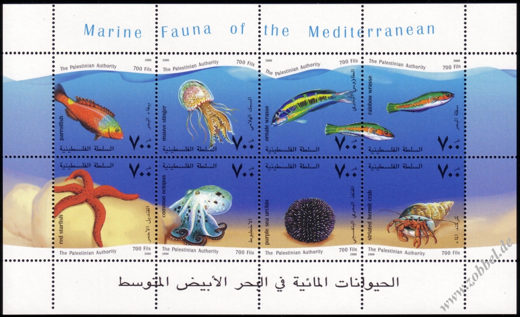 A sheetlet was issued on 8.11.2000 depicting animals living in the Mediterranean. The eight stamps, all denominated at 700 Fils, were printed together se-tenant (4x2) in one sheetlet sized 174.7x105.8mm, with a total value 5,600 Fils. The sheetlet, Zobbel ZdKb 8, was printed by Bundesdruckerei GmbH Berlin. Print run: unknown. Perforation: K 13.75.