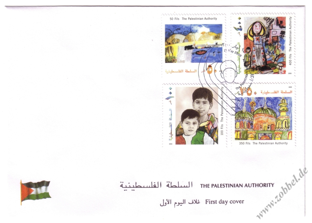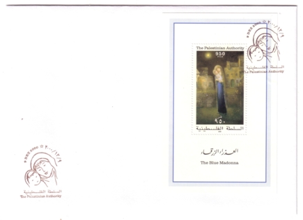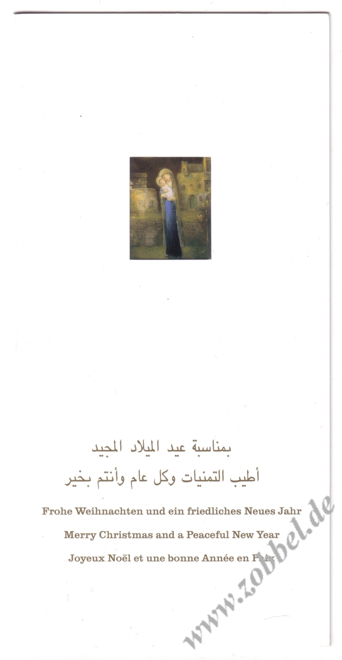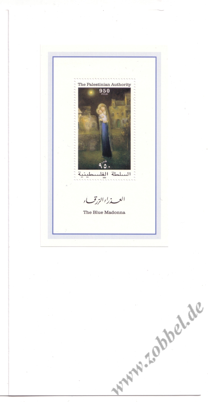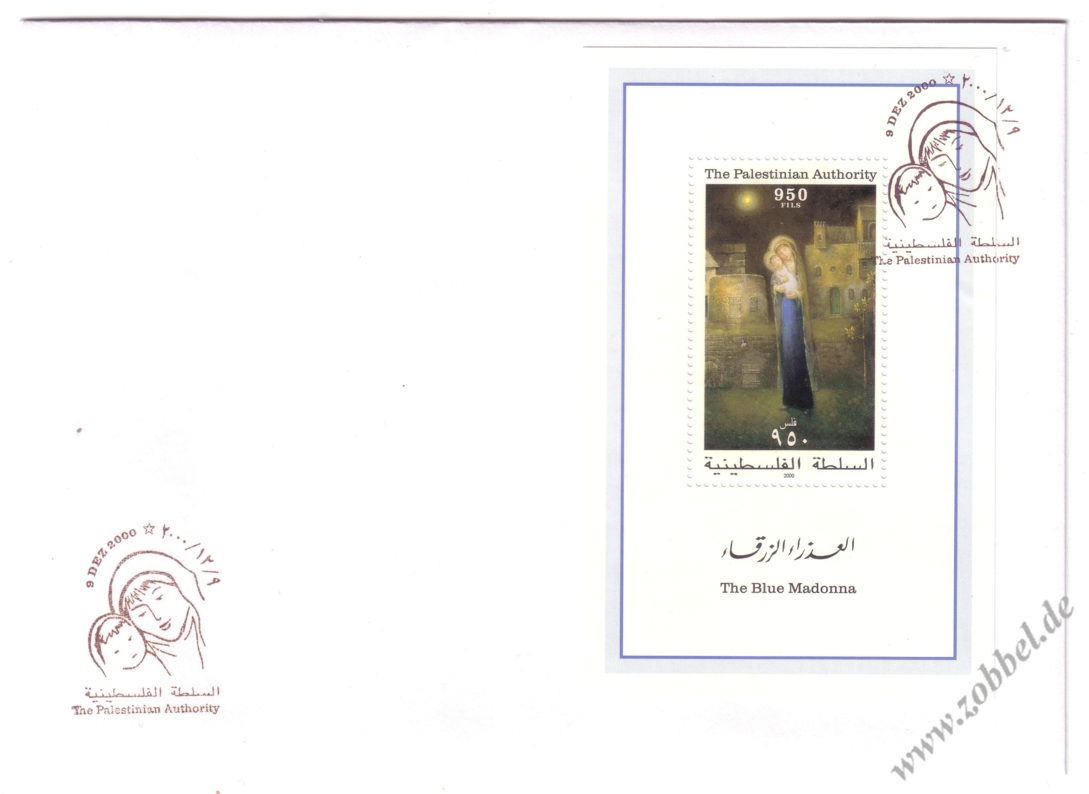 A block was issued on 9.12.2000 on the occasion of Christmas depicting a detail from the painting " Additionally, Bundesdruckerei GmbH Berlin produced a folder for Chistmas 2000 (sized 105x210mm, pictured below), with Zobbel Bl. 16 point-glued into it. A part of the cover is cut out to make part of the stamp visible. The folder is known with (sent by the embassy as Christmas/New Year's greetings card) or without (sold by the stamp trade) the signature of Palestine's ambassador to Germany, Abdallah Frangi. Hazimeh designed or had his paintings used for several further postage stamps and blocks of Palestine: 50 Years Arab League 1995, Art of Peace 2001, Peace for Bethlehem 2001, Maria with her Child 2002, Worship of the Virgin Mary 2005, and 60 Years Arab League 2005.
