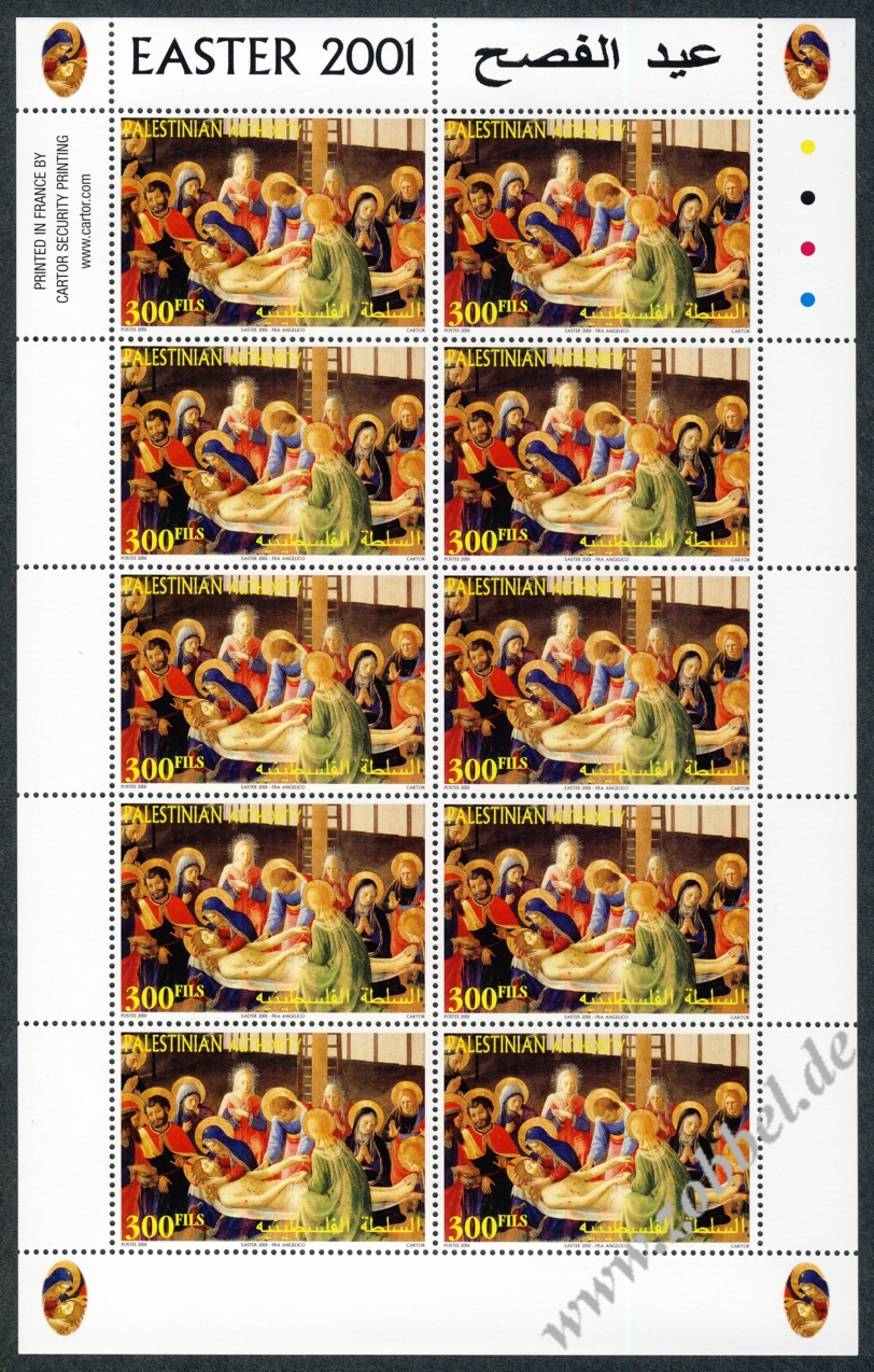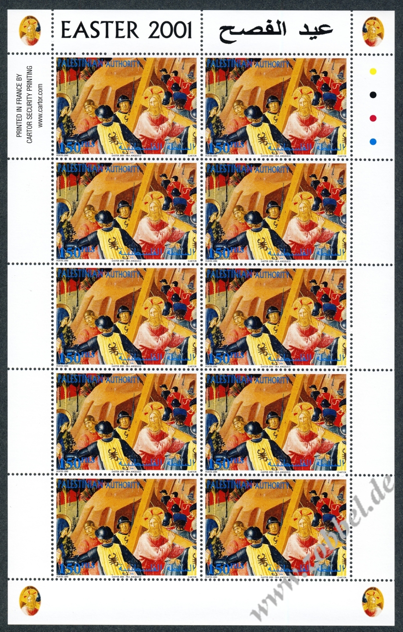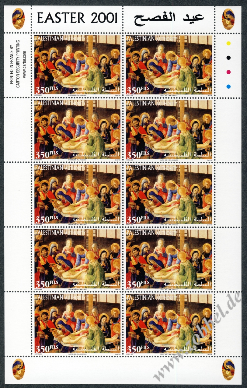 Palestine issued a stamp series on 15.04.2001 celebrating Easter: the six stamps (denominations: 150, 200, 300, and 350 Fils) and a block (2,000 Fils) depict three renaissance artworks. The stamps were printed by Cartor Securty Printing, La Loupe (France) in sheets of 10 (2x5), the block contains one single stamp. Total value: 3,000 Fils. Print run: unknown. Perforation: K 13.25.