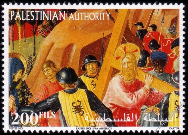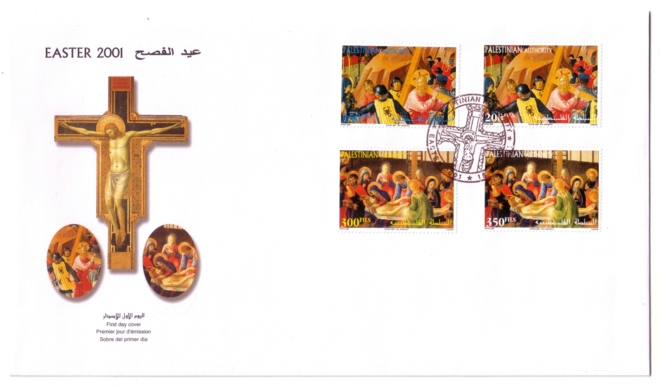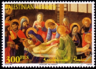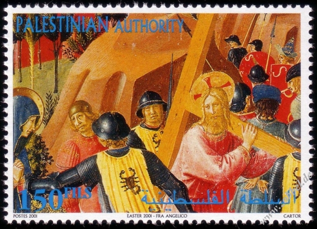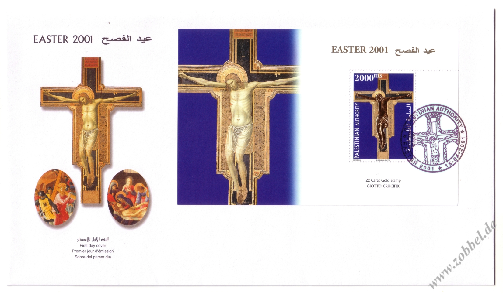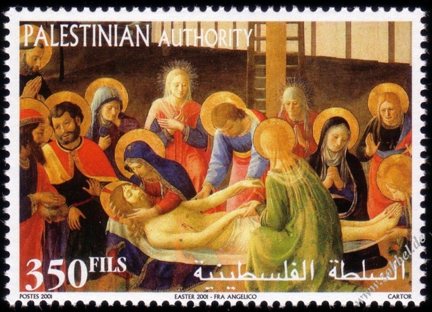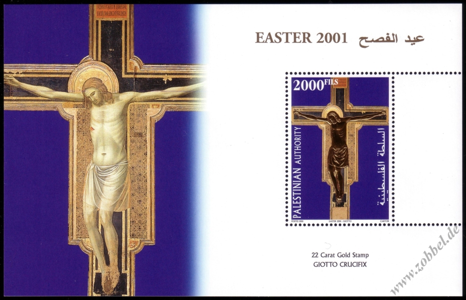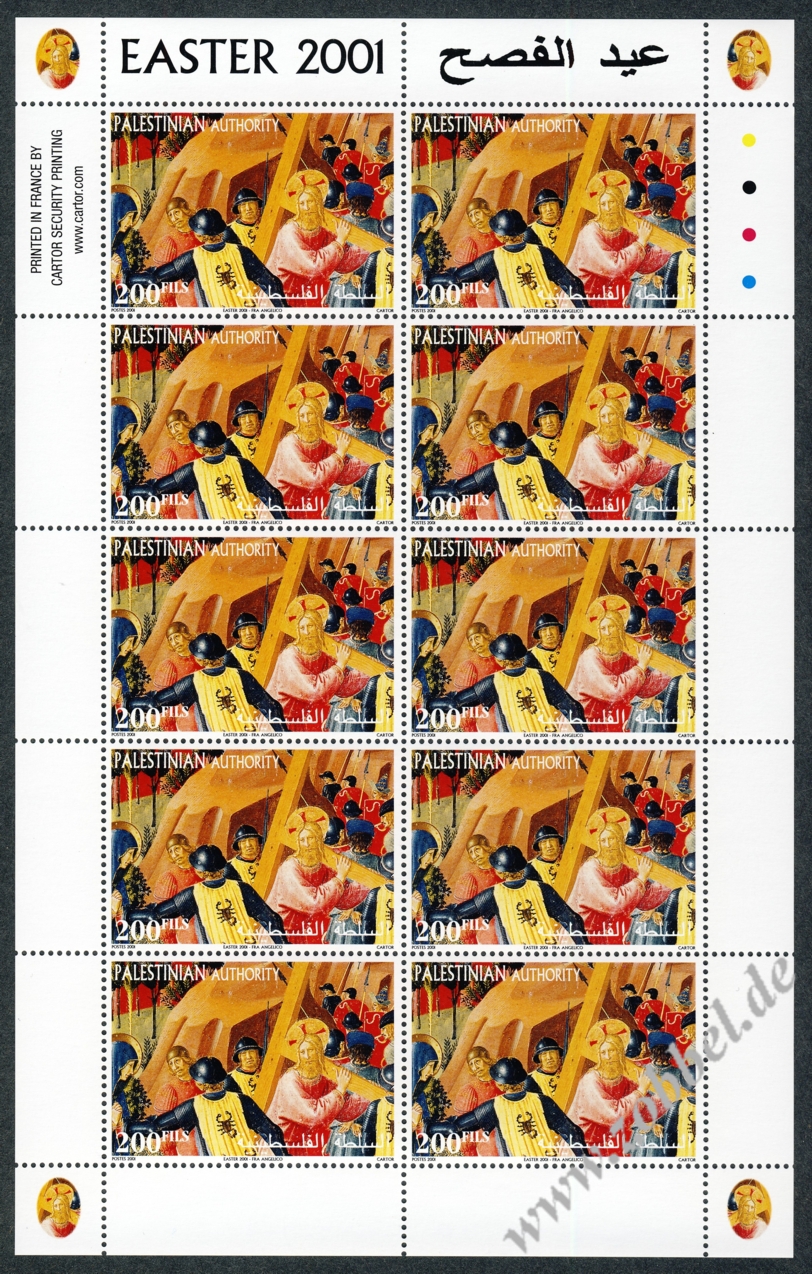 Palestine issued a stamp series on 15.04.2001 celebrating Easter: the six stamps (denominations: 150, 200, 300, and 350 Fils) and a block (2,000 Fils) depict three renaissance artworks. The stamps were printed by Cartor Securty Printing, La Loupe (France) in sheets of 10 (2x5), the block contains one single stamp. Total value: 3,000 Fils. Print run: unknown. Perforation: K 13.25.