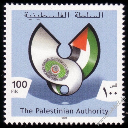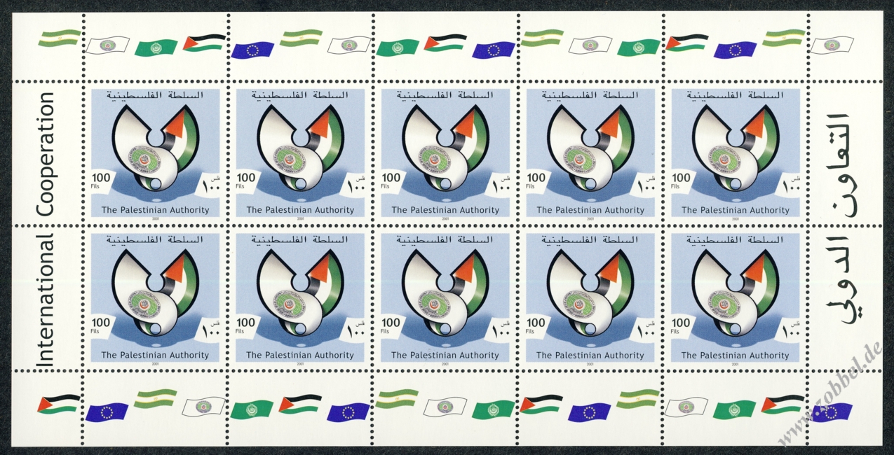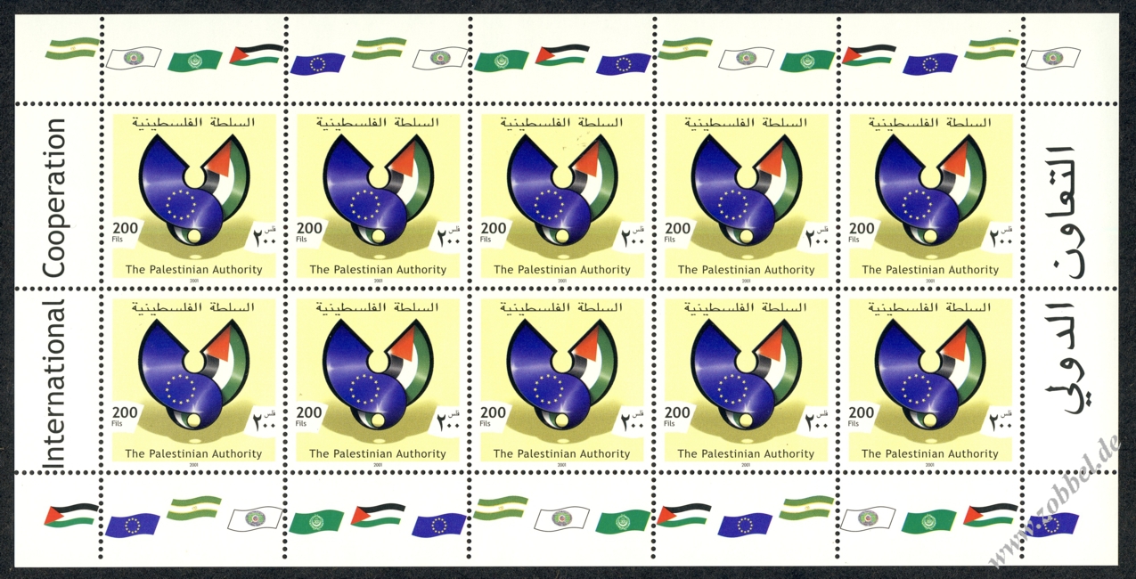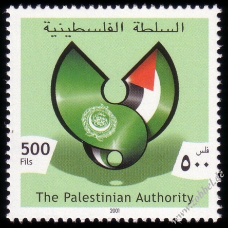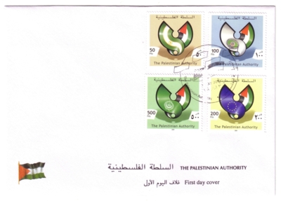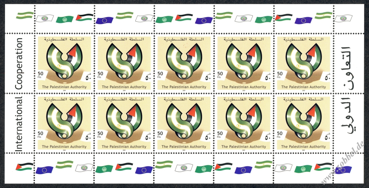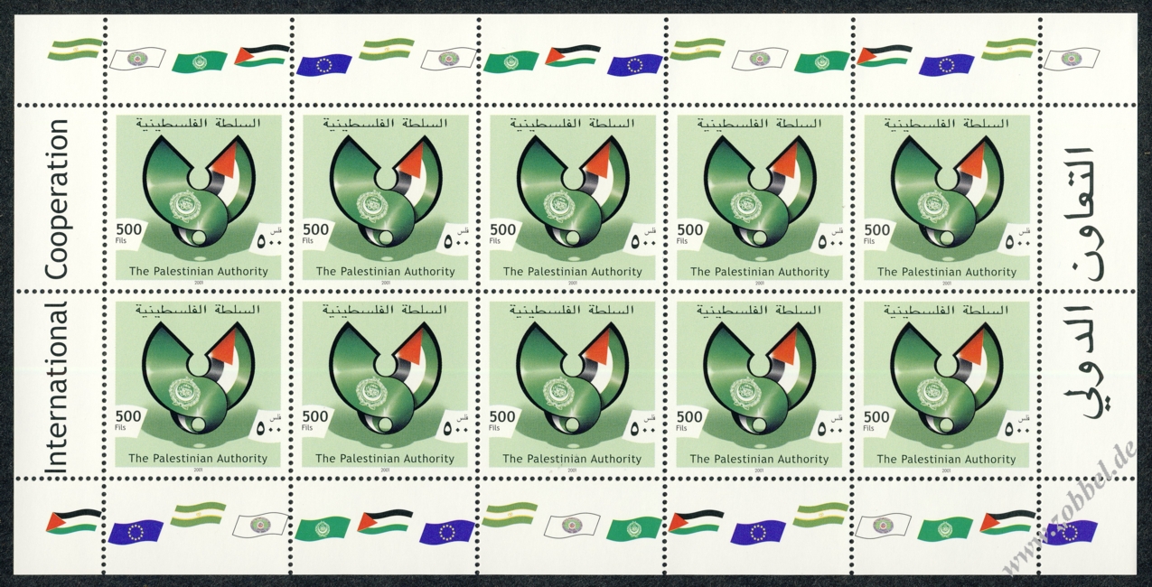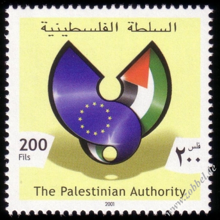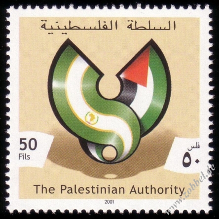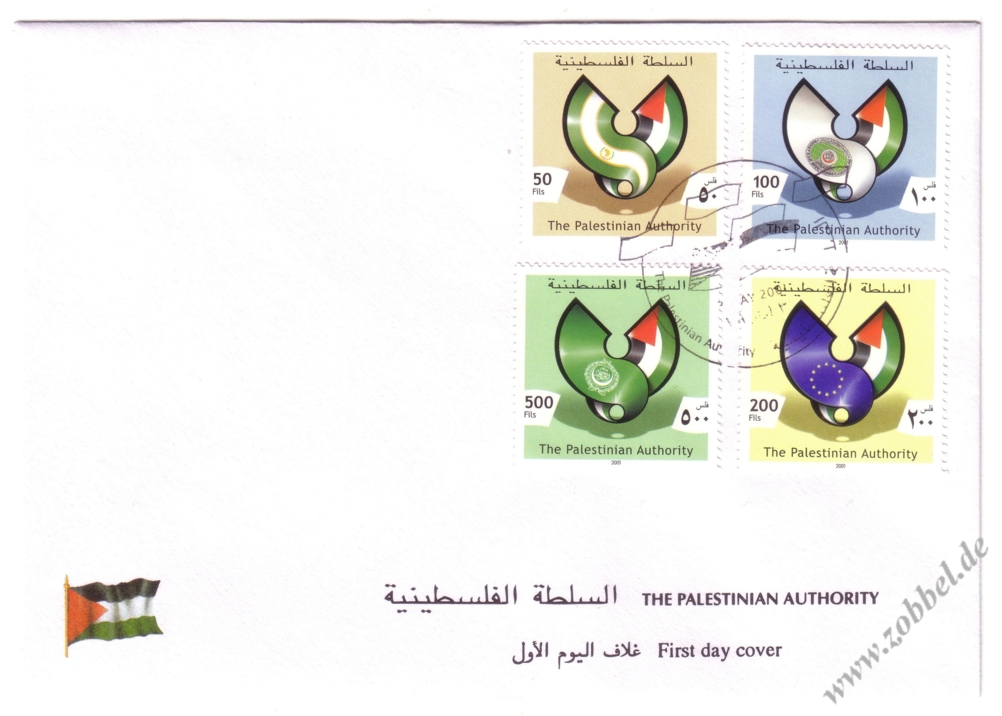 A series of stamps was issued on 3.05.2001 honourinmg four international organisations (African Union, Organisation of Islamic Cooperation, European Union, and Arab League) depicting the flags of the respective organisation and Palestine intertwining. The four stamps have a total value of 850 Fils (denomnated at 50, 100, 200, and 500 Fils) and were printed by Bundesdruckerei GmbH Berlin in sheets of 10 (5x2). Print run: unknown. Perforation: K 13.75.