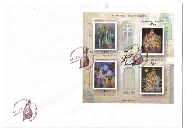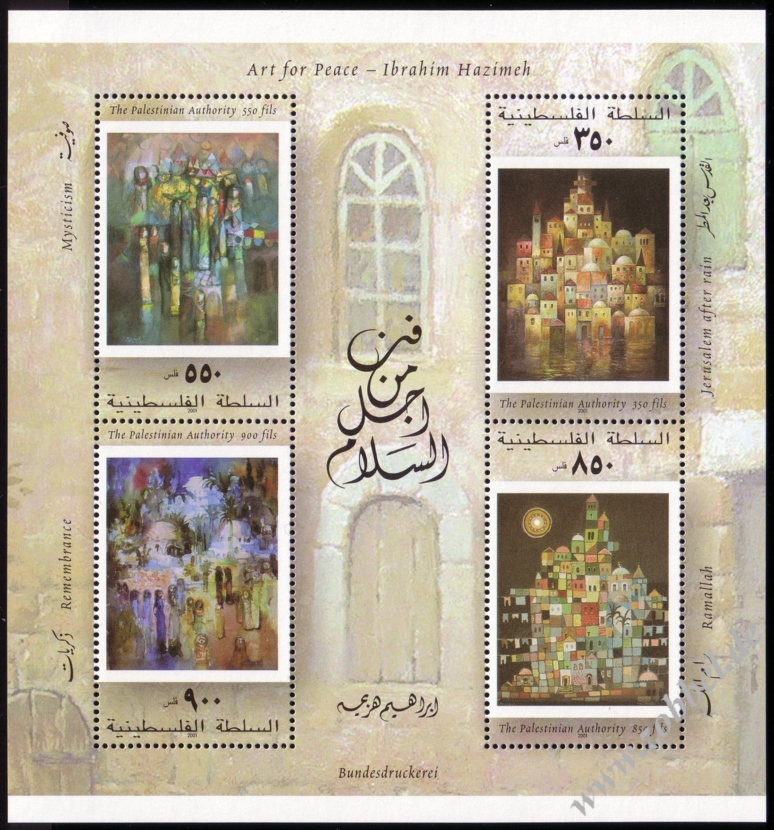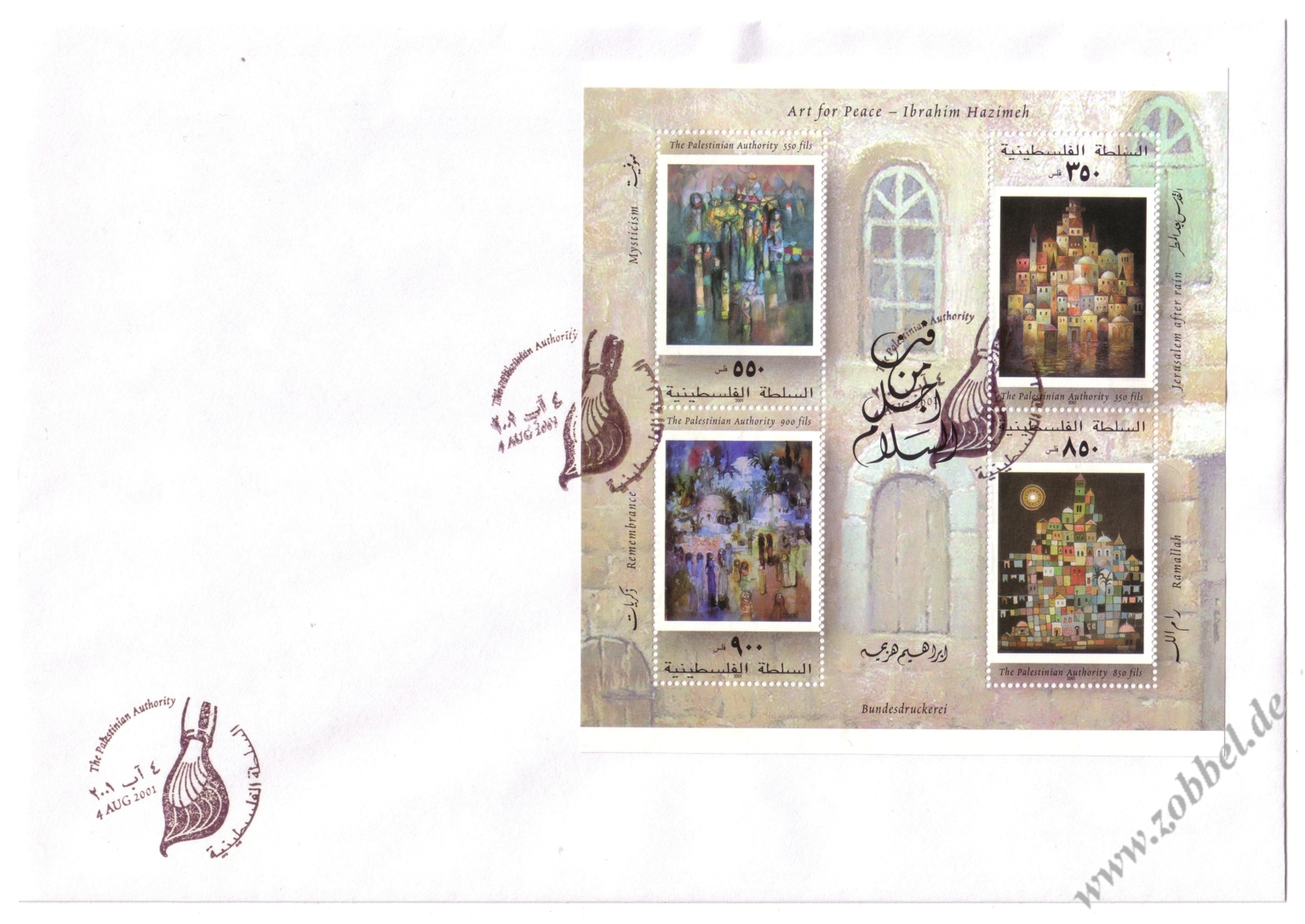 A block was issued on 4.08.2001 depicting four paintings by Palestinian artist Ibrahim Hazimeh (*1933) und the title "Art For Peace". The block contains four stamps denominated at 350, 550, 850, and 900 Fils (total value: 2,650 Fils) and was printed by Bundesdruckerei GmbH Berlin. Print run: unknown. Perforation: K 14:13.75.