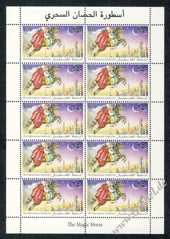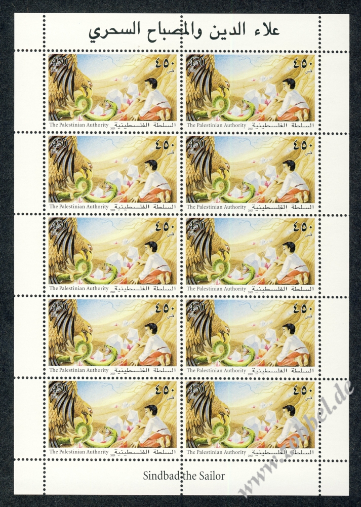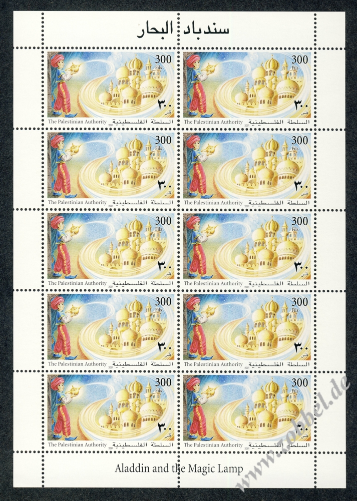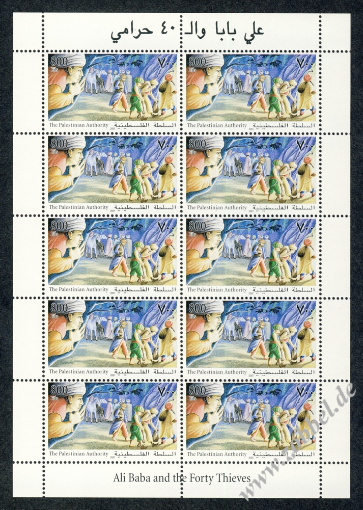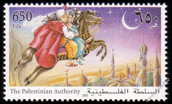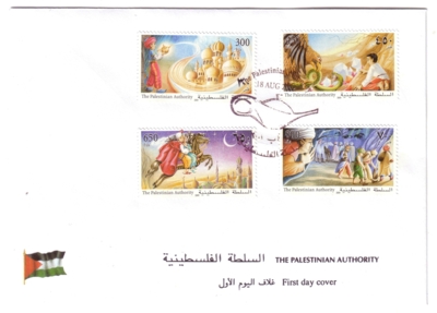 A series of four stamps was issued on 18.08.2001 depicting scenes from four famous Arab fairy tales from or associated with "One Thousand and One Nights" (كتاب ألف ليلة وليلة). The stamps are denominated at 300, 450, 650, and 800 Fils with a total value of 2,200 Fils. They were printed by Bundesdruckerei GmbH Berlin in sheets of 10 (2x5). Print run: unknown. Perforation: K 14.