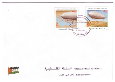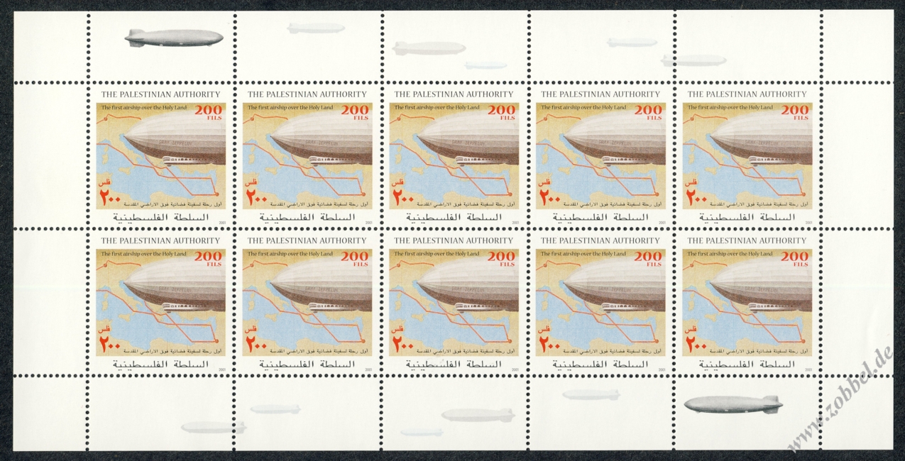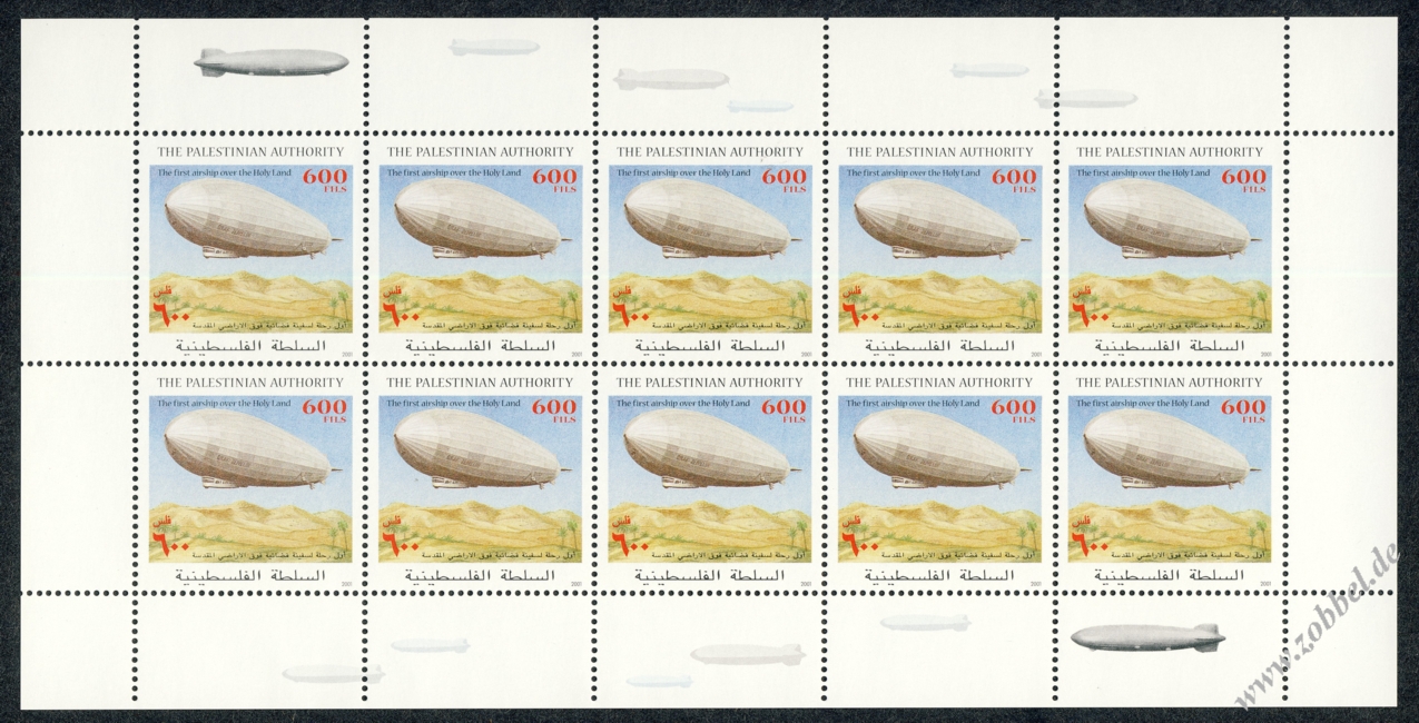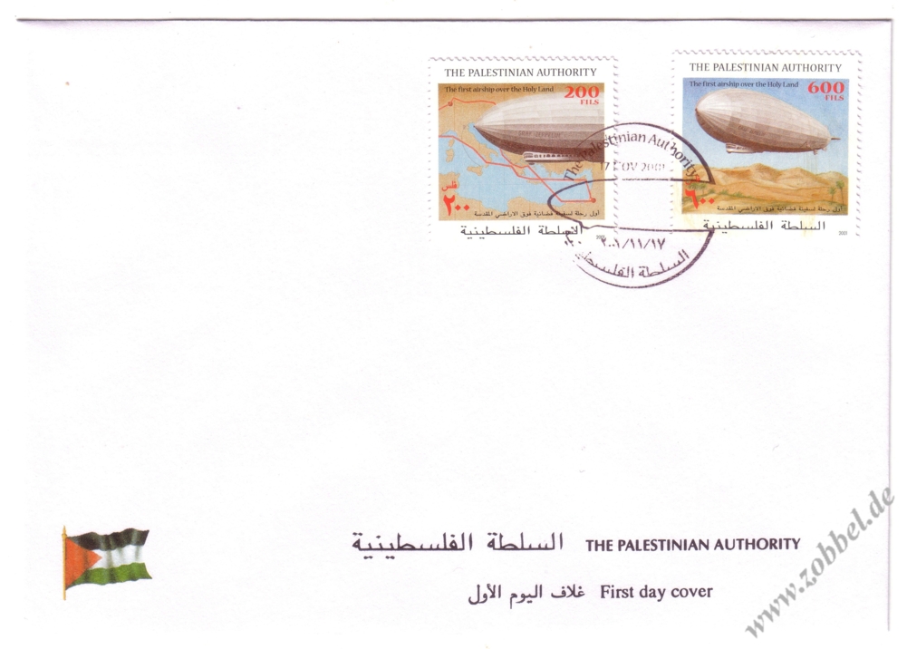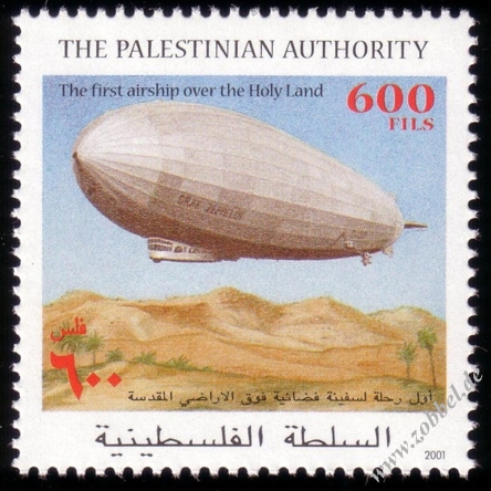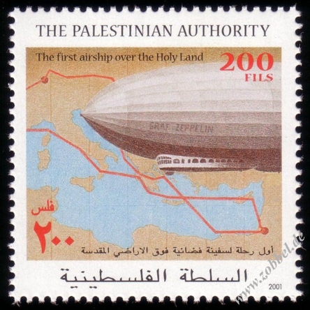 A series of stamps was issued on 17.11.2001 commemorating "The First Airship over the Holy Land": the "Orient Flight" (Orientfahrt) of German airship Zeppelin LZ-127 took place between 25. and 28.03.1929 and Palestine (Haifa, Jerusalem, Jordan Valley, Lake Kinnereth) was overflown in nighttime on 26.03.1929. LZ-127 visited Palestine for a second time on its "Egpyt Flight" (Ägyptenfahrt, 9–13.04.1931) during which Gaza and Jerusalem were overflown in daytime on 11.04.1931. The two stamps with a total value of 800 Fils (200, and 600 Fils) were printed by Bundesdruckerei GmbH Berlin in sheets of 10 (5x2). Print run: unknown. Perforation: K 13.75.