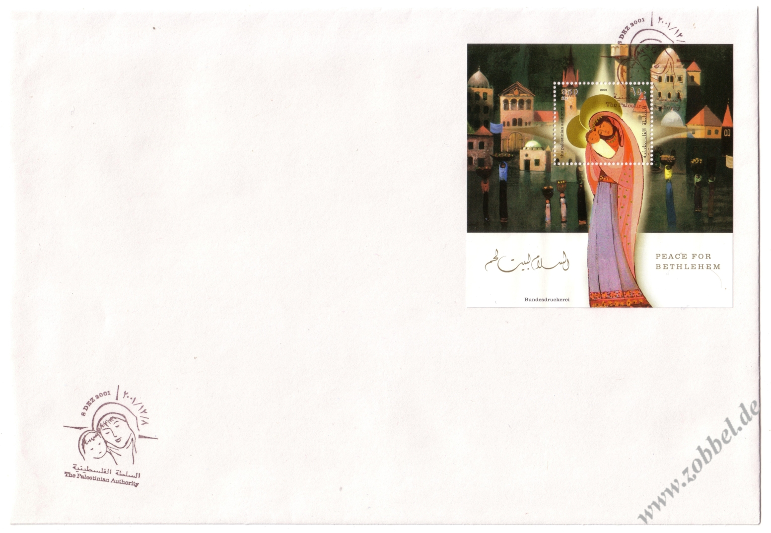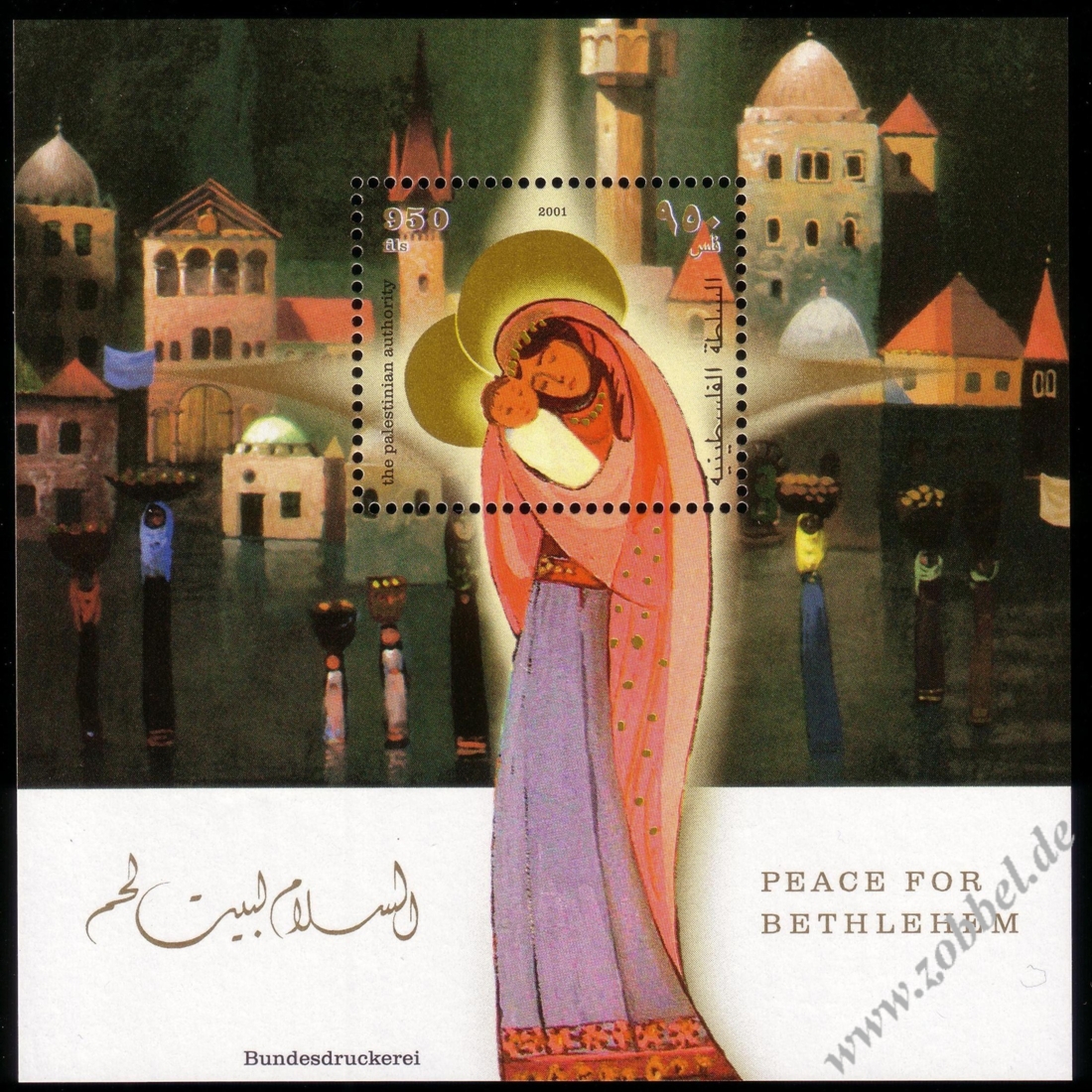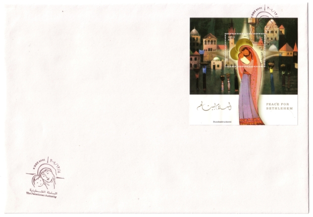 A block was issued on 8.12.2001 the occasion of Christams depicting a painting (unknown title) by Palestinian artist Ibrahim Hazimeh (*1933). The block contains one stamp denominated at 950 Fils and was printed by Bundesdruckerei GmbH Berlin. Print run: unknown. Perforation: K 14:13.75. Hazimeh designed or had his paintings used for several further postage stamps and blocks of Palestine: 50 Years Arab League 1995, The Blue Madonna 2000, Art of Peace 2001, Maria with her Child 2002, Worship of the Virgin Mary 2005, and 60 Years Arab League 2005.