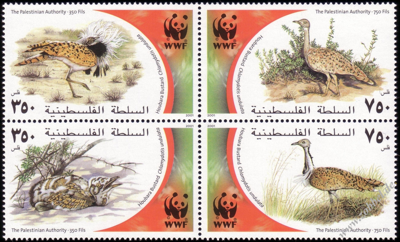 WWF: Houbara Bustard 2001A sheetlet of stamps (Zobbel ZdKb 9) was issued on 24.11.2001 depicting the Houbara Bustard (Chlamydotis undulata, German: Kragentrappe). The stamps are part of the "WWF Conservation Stamp Collection": the design uses drawings from photographs provided by World Wide Fund for Nature (WWF) and shows the WWF logo. Depicted are: The sheetlet, Zobbel ZdKb 9, contains eight stamps: two blocks-of-four printed se-tenant in the follwing order: Zobbel nos. 192 / 194 // 193 / 195 // 192 / 194 // 193 / 195.
