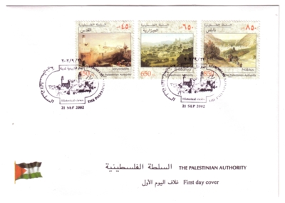 An official FDCs was issued, bearing a special oval postmark (depicting Jerusalem) dated 21.09.2002. A further series of historical town vistas was issued in 1997: Gaza and Hebron (Zobbel nos. 72–73).
