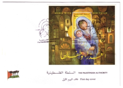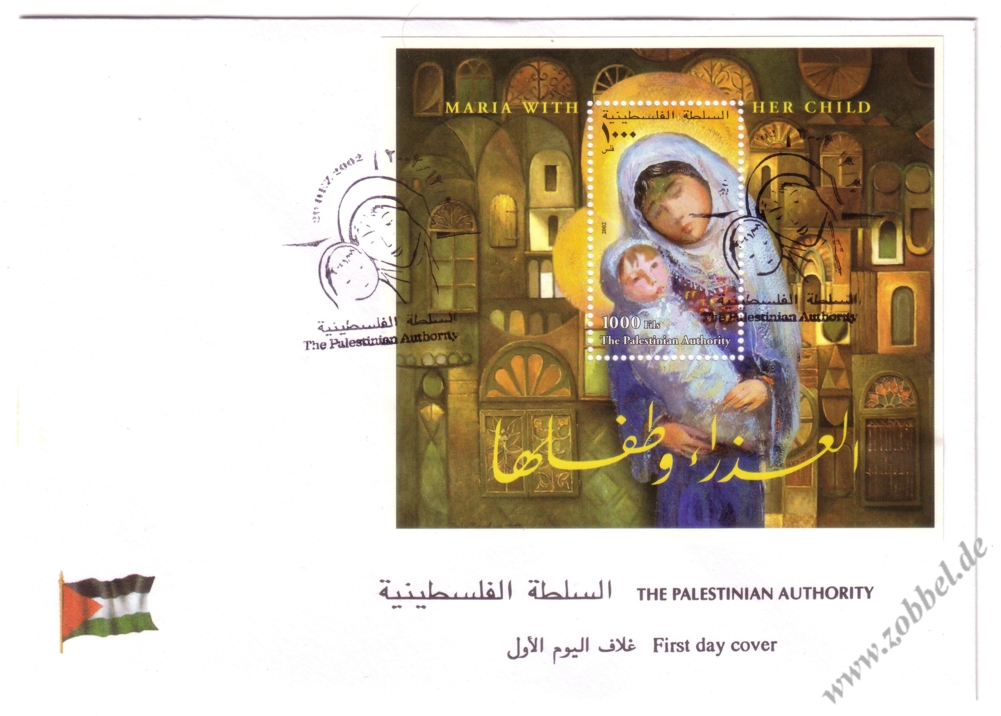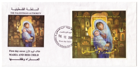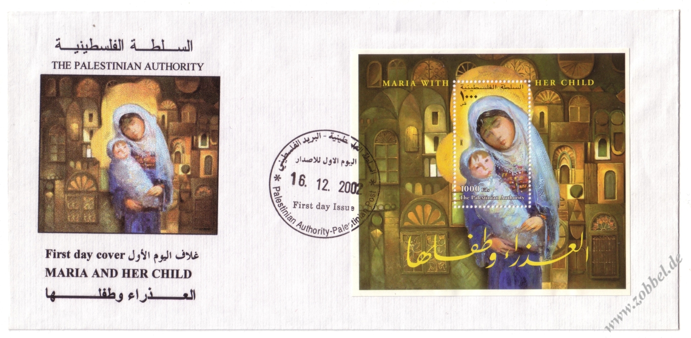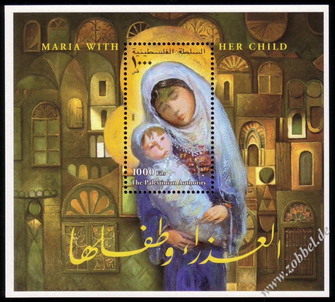 Christmas 2002: Maria with her ChildA block was issued in December (16 or 20.12.2002) on the occasion of Christmas depicting the painting Maria with her Child (Die Madonna mit ihrem Kind, 2002?) by Palestinian artist Ibrahim Hazimeh (*1933). The block contains one stamp denominated at 1,000 Fils and was printed by Bundesdruckerei GmbH Berlin. Print run: unknown. Perforation: K 14:13.75.