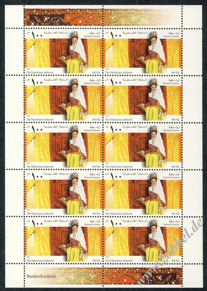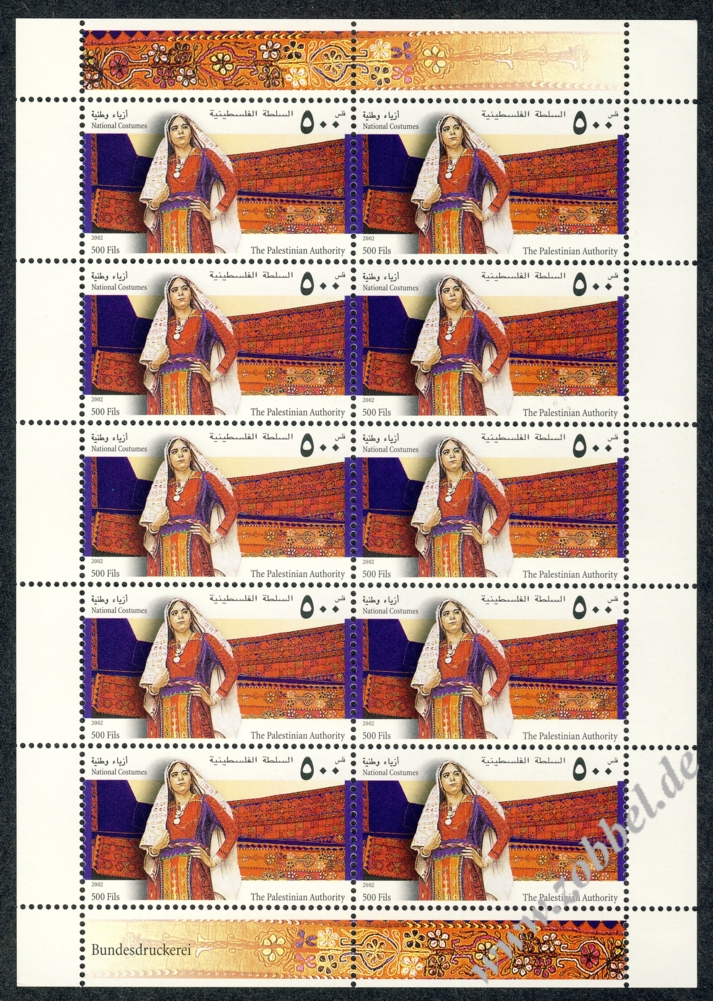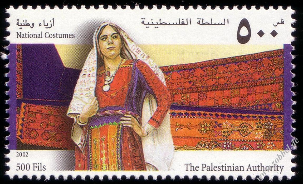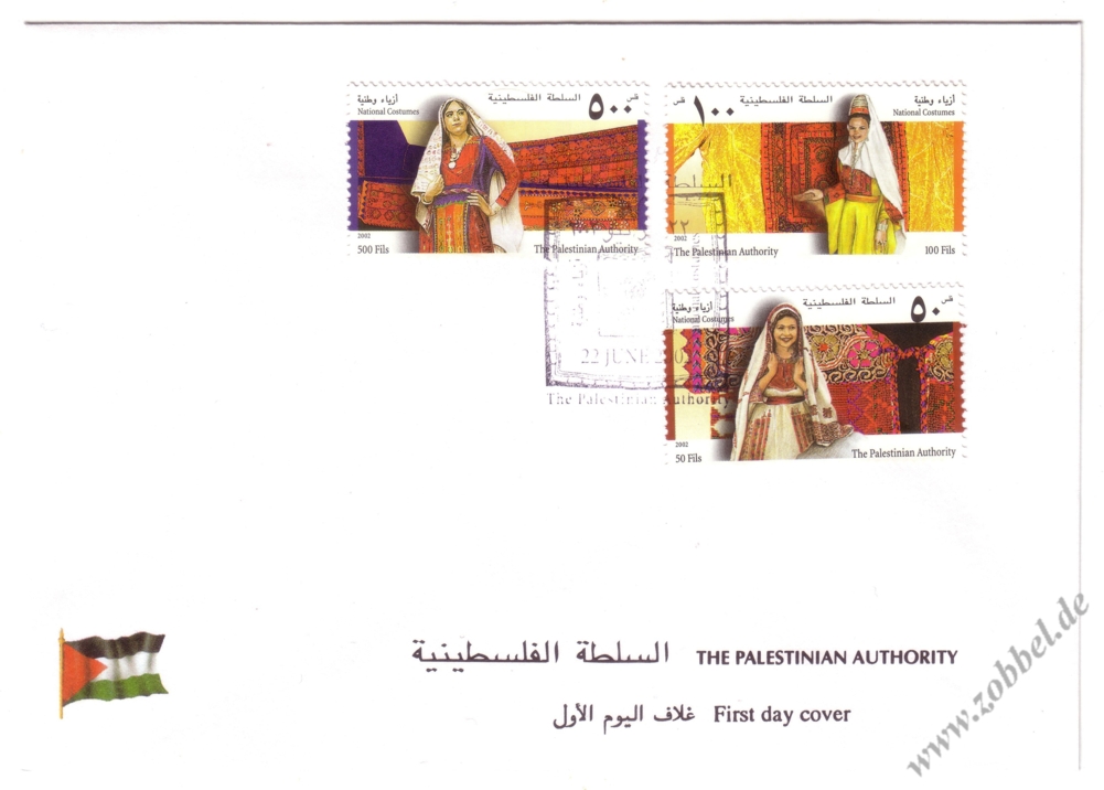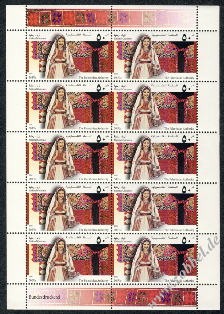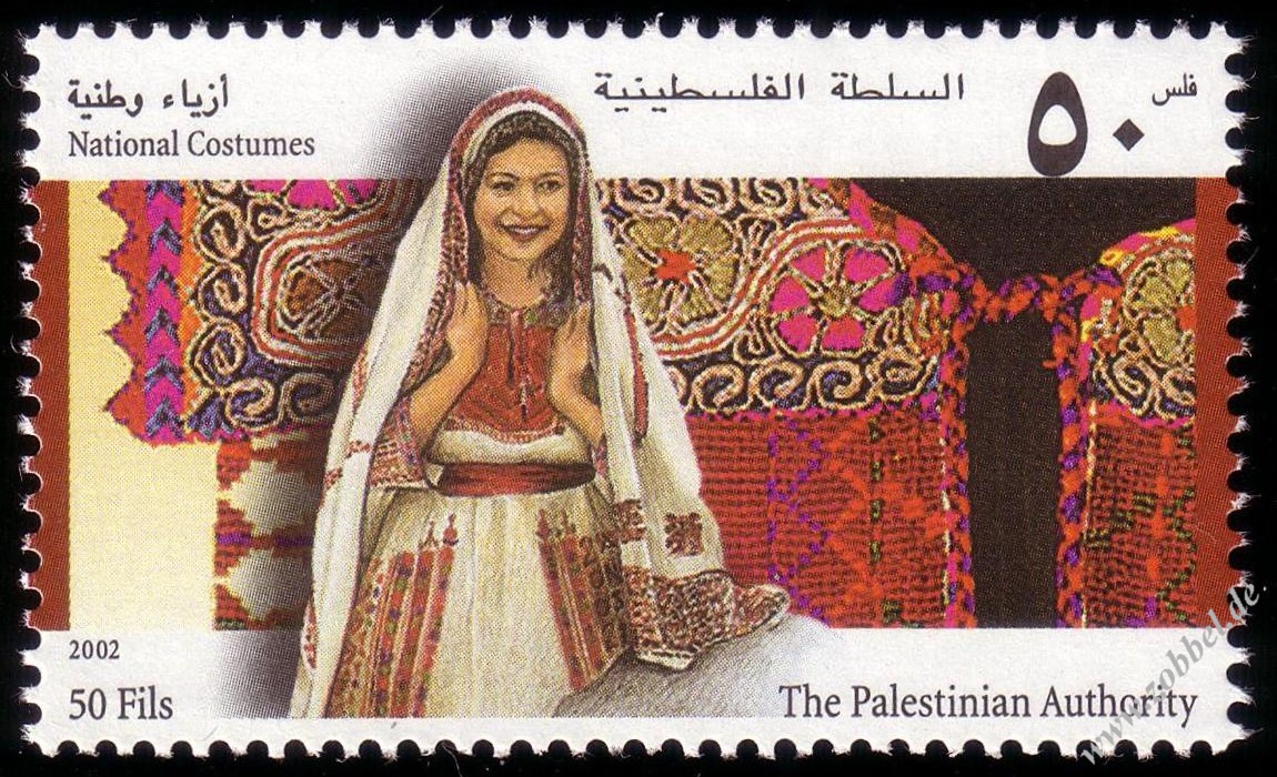 National Costumes 2002A series of four stamps was issued on 22.06.2002 depicting three traditional women's dresses under the title "National Costumes". The stamps are denominated at 50, 100, and 500 Fils with a total value of 650 Fils. They were printed by Bundesdruckerei GmbH Berlin in sheets of 10 (2x5). Print run: unknown. Perforation: K 14.