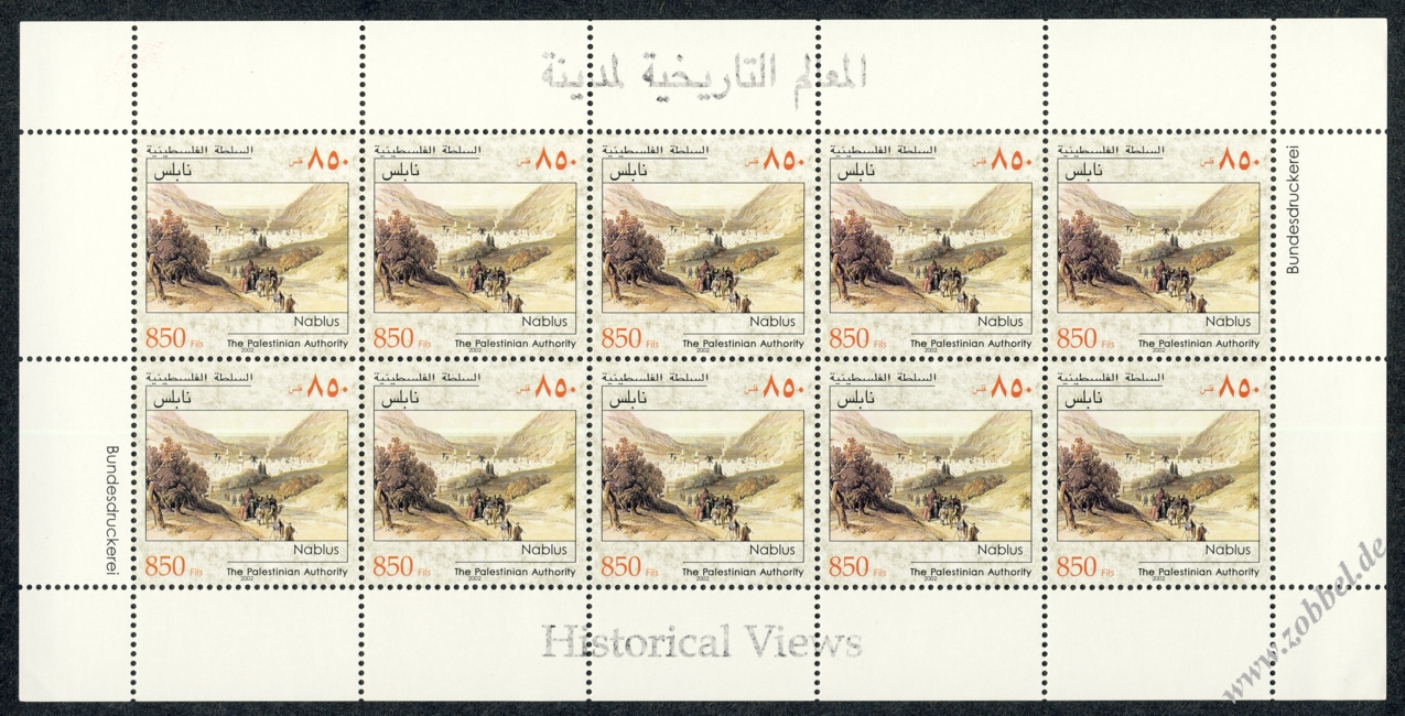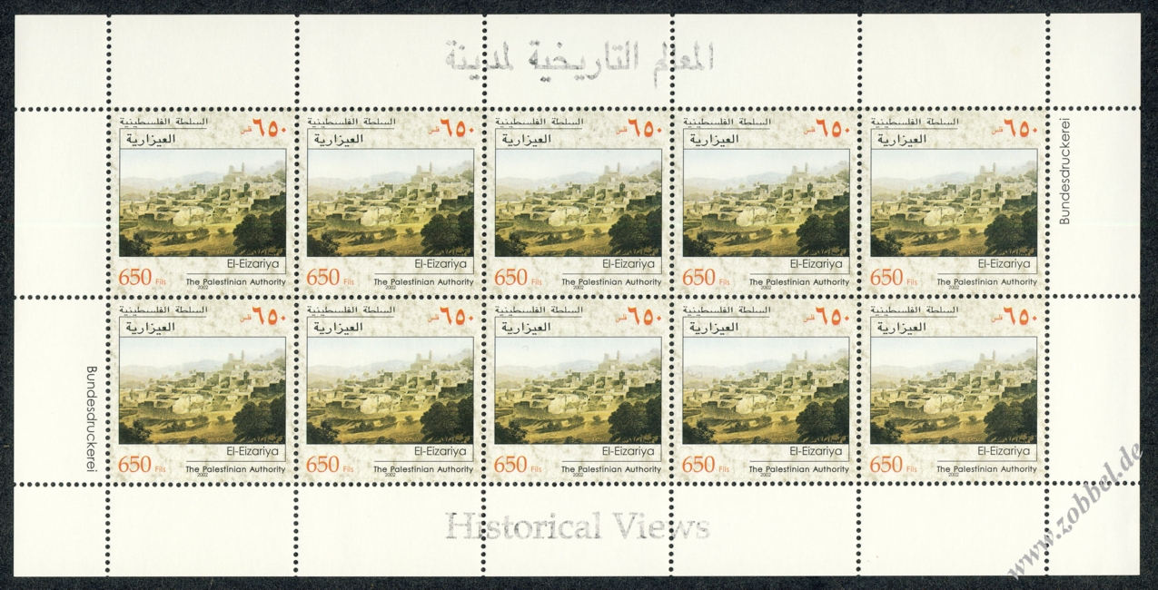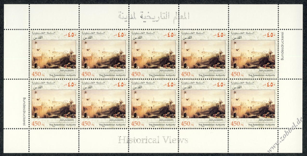On 21.09.2002 Palestine issued a stamp series depicting historical vistas of the towns Jerusalem (Pool of Bethesda), al-Aizarya (Bethany), and Nablus, based on the Louis Haghe engravings of David Roberts' paintings from his journey in 1839. The three stamps are denominated at 450, 650, and 850 Fils and were printed by Bundesdruckerei GmbH Berlin in sheets of 10 (5x2). Total value: 1,950 Fils. Print run: unknown. Perforation: K 13.75.