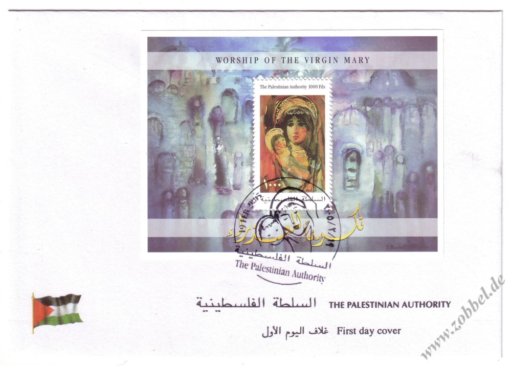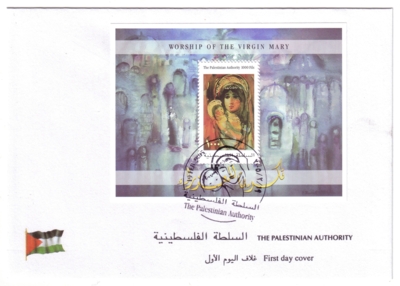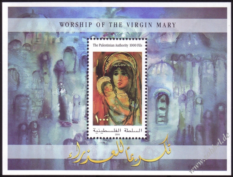 Christmas 2004: Worship of the Virgin Mary 2005A block was issued on 16.02.2005 for Christmas 2004, depicting the painting Madonna 4: Hommage to Maria (Huldigung für Maria, 2004?) by Palestinian artist Ibrahim Hazimeh (*1933). The backgrund of the block (outside the stamp) uses another, unknown, painting by Hazimeh. The block, entitled "Worship of the Virgin Mary" contains one stamp denominated at 1,000 Fils and was printed by Bundesdruckerei GmbH Berlin. Print run: unknown. Perforation: K 14.25:13.75. An official FDC was issued using the generic envelope with the block cancelled by a special first-day postmark dated 19.02.2005. Hazimeh designed or had his paintings used for several further postage stamps and blocks of Palestine: 50 Years Arab League 1995, The Blue Madonna 2000, Art of Peace 2001, Peace for Bethlehem 2001, Maria with her Child 2002, and 60 Years Arab League 2005.