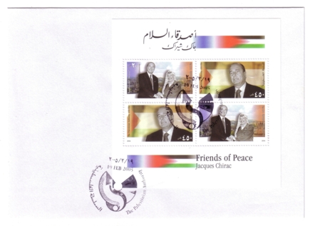 Similar to the series "Friends of Palestine" issued in 1997, Palestine issued on 19.02.2005 a pair of stamps commemorating French president Jacques Chirac (*1932, in office: 1995–2007): one stamp is a portrait, the other depicts Chirac meeting President Arafat. The stamps are denominated at 200 and 450 Fils and printed se-tenant by Bundesdruckerei GmbH Berlin in a block with total value: 1,300 Fils in this order: Zobbel nos. 218 / 219 // 219 / 218. Print run: unknown. Perforation: K 13.75:14.