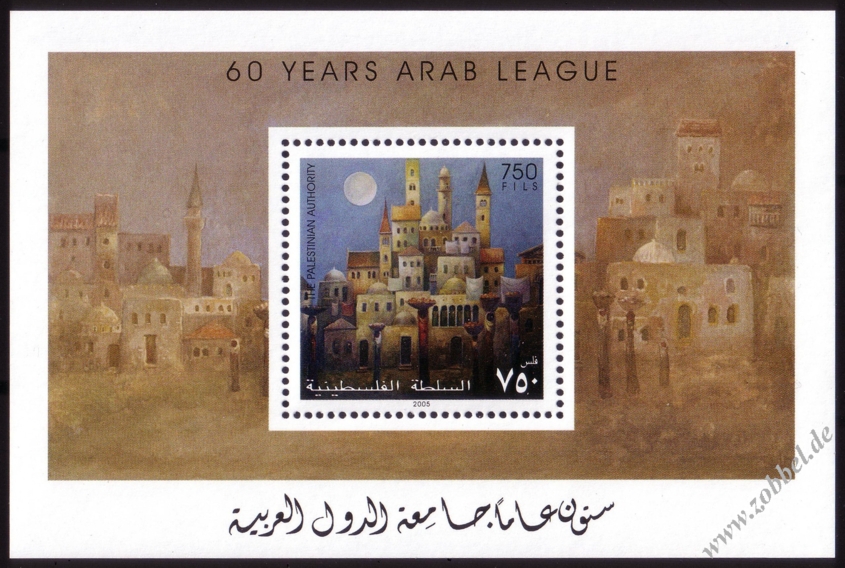 On the occasion of "60 Years Arab League" a block containing one stamp at 750 Fils was issued in Summer 2005. The design is similar to Zobbel Bl. 2 issued in 1995 on the occasion of 50 Years Arab League. The block was the last one printed by Bundesdruckerei GmbH Berlin for Palestine. Print-run is unknown. Perforation: K 13.75. The motif used for the stamp is the painting "Palestine – Land of my Dreams" (1987). In the background (ie. on the block outside the stamp) a different painting is used. Hazimeh designed or had his paintings used for several further postage stamps and blocks of Palestine: 50 Years Arab League 1995, The Blue Madonna 2000, Art of Peace 2001, Peace for Bethlehem 2001, Maria with her Child 2002, and Worship of the Virgin Mary 2005.