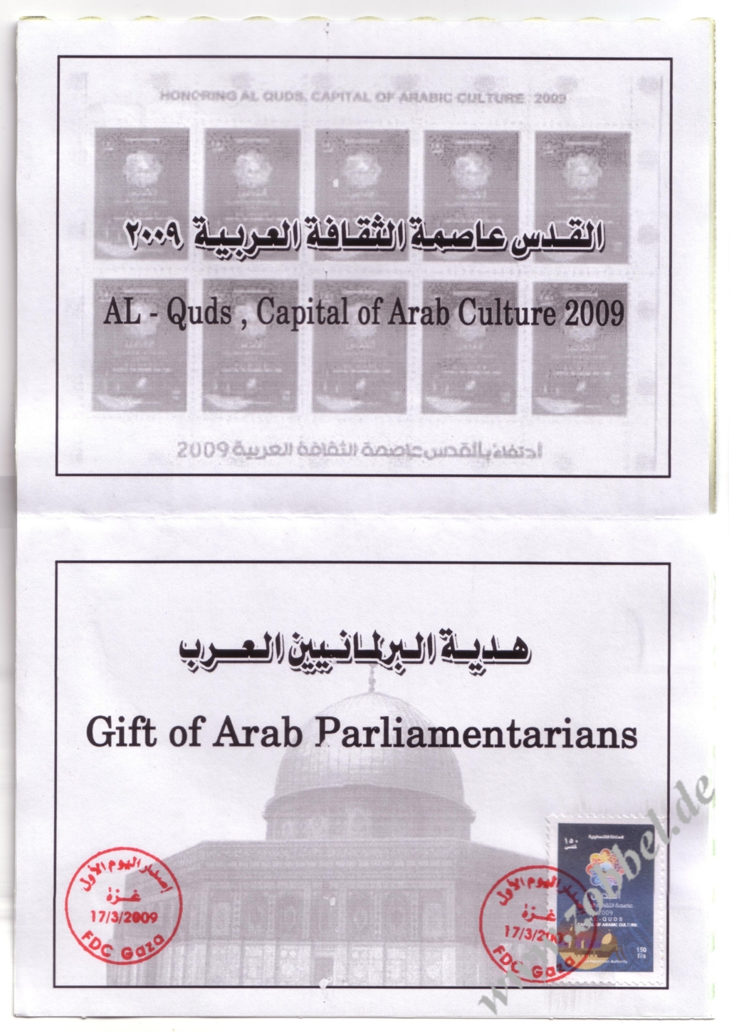 The 150f stamp (Zobbel g005) is used in 2010 on a special card, packaged in an elaborate presentation envelope, entitled "Gift of Arab Parlamentarians". The card shows the sheet of 10 in greyscale. One copy of the actual 150f stamps is cancelled by the same special FDC postmark, dated 17/03/2009, as used on the FDC for Zobbel Bl. g01. The official status of this envelope, said to exist in 150 copies only, is unclear.