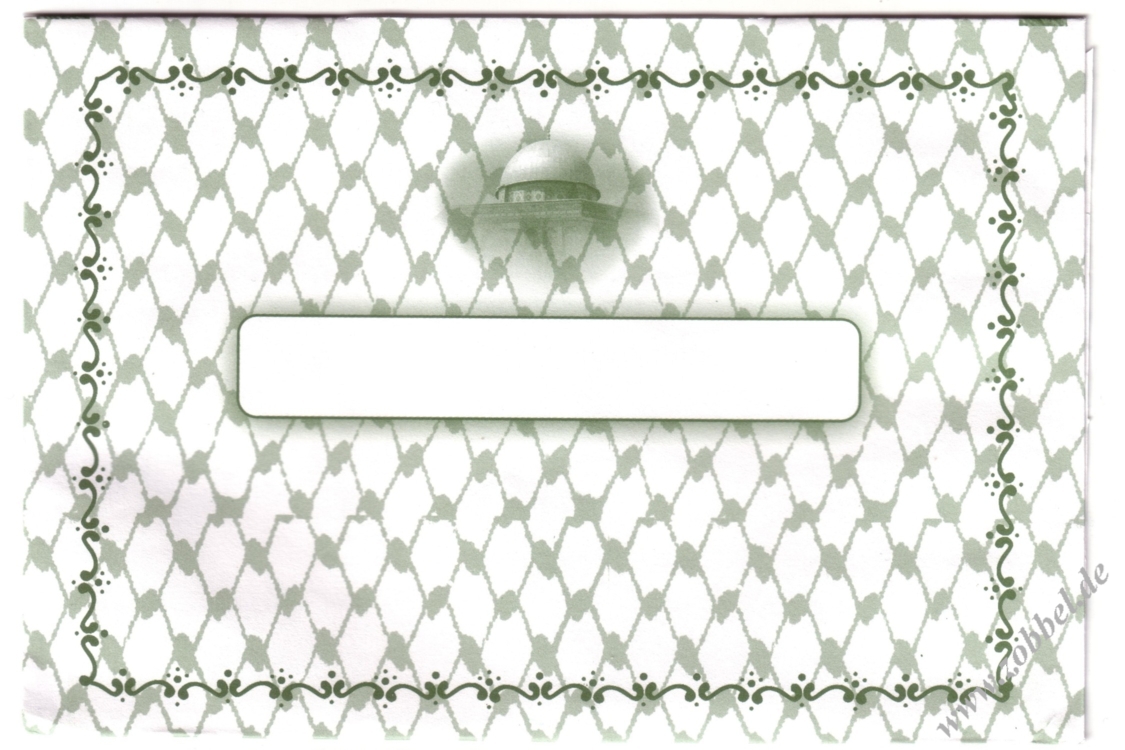 Unofficial FDCs do exist for Zobbel Bl. g01: the envelopes are imprinted on the left with the "Al-Quds 2009" logo and pictures of Al-Aqsa mosque and the Dome of the Rock. The block ist not used in its entirety. The cancellation is by a special FDC postmark inscribed "FDC Gaza / 17/03/2009". According to recent reports, these unofficial FDCs were created by a Jordanian dealer. The official status of the postmark is unclear.