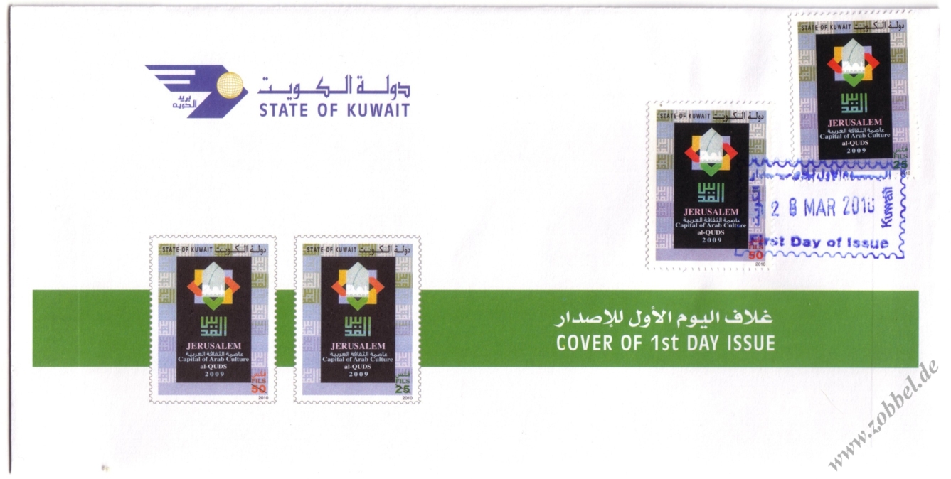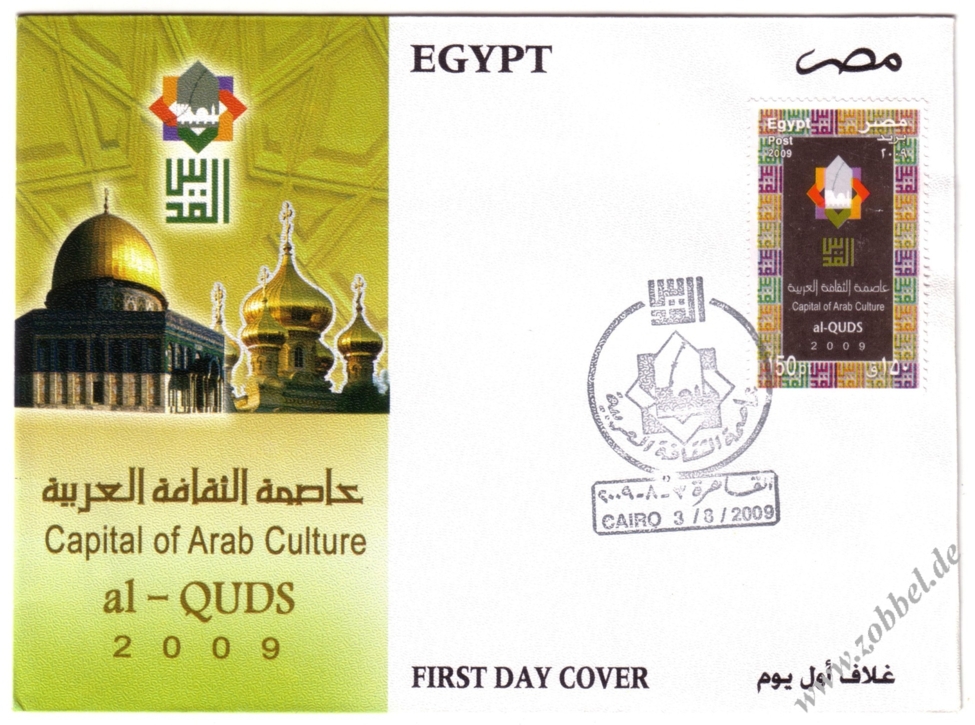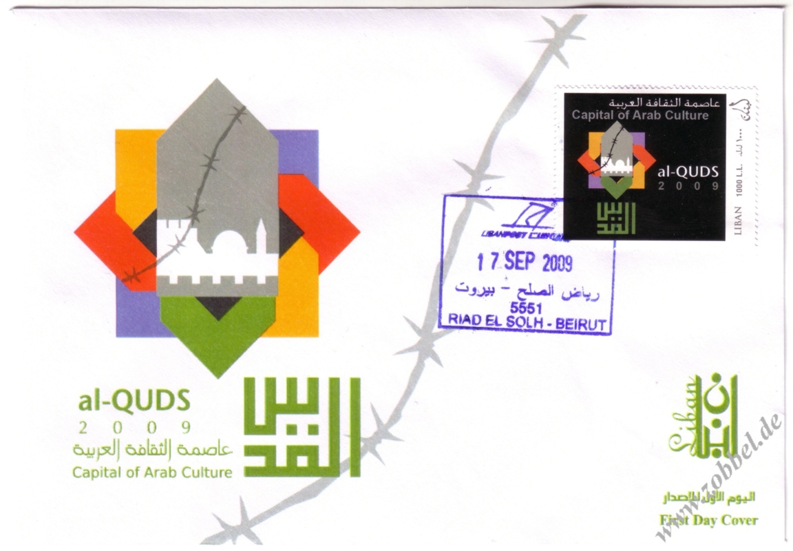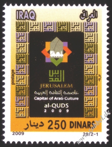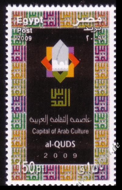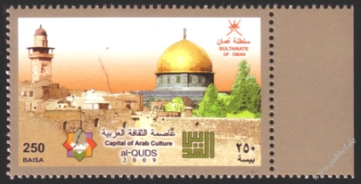 The Ministry of Telecommunications and Information Technology today announced the issue of postage stamps with the slogan "Al-Quds: Capital of Arabic Culture 2009". The stamps were printed in three values: 100 fils (green), 150 fils (blue), and 500 fils (red). These will be available in the next few days at all post offices in the Gaza Strip.