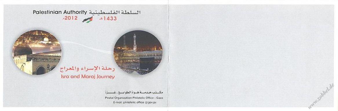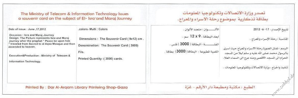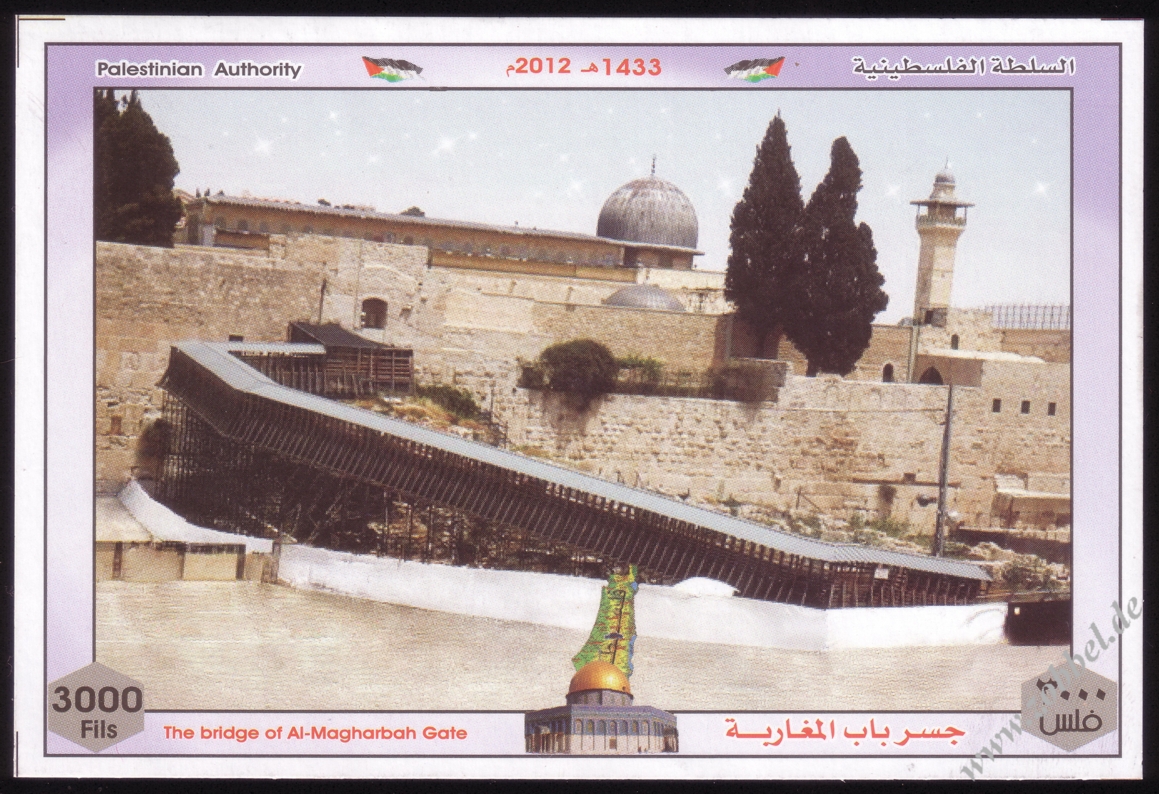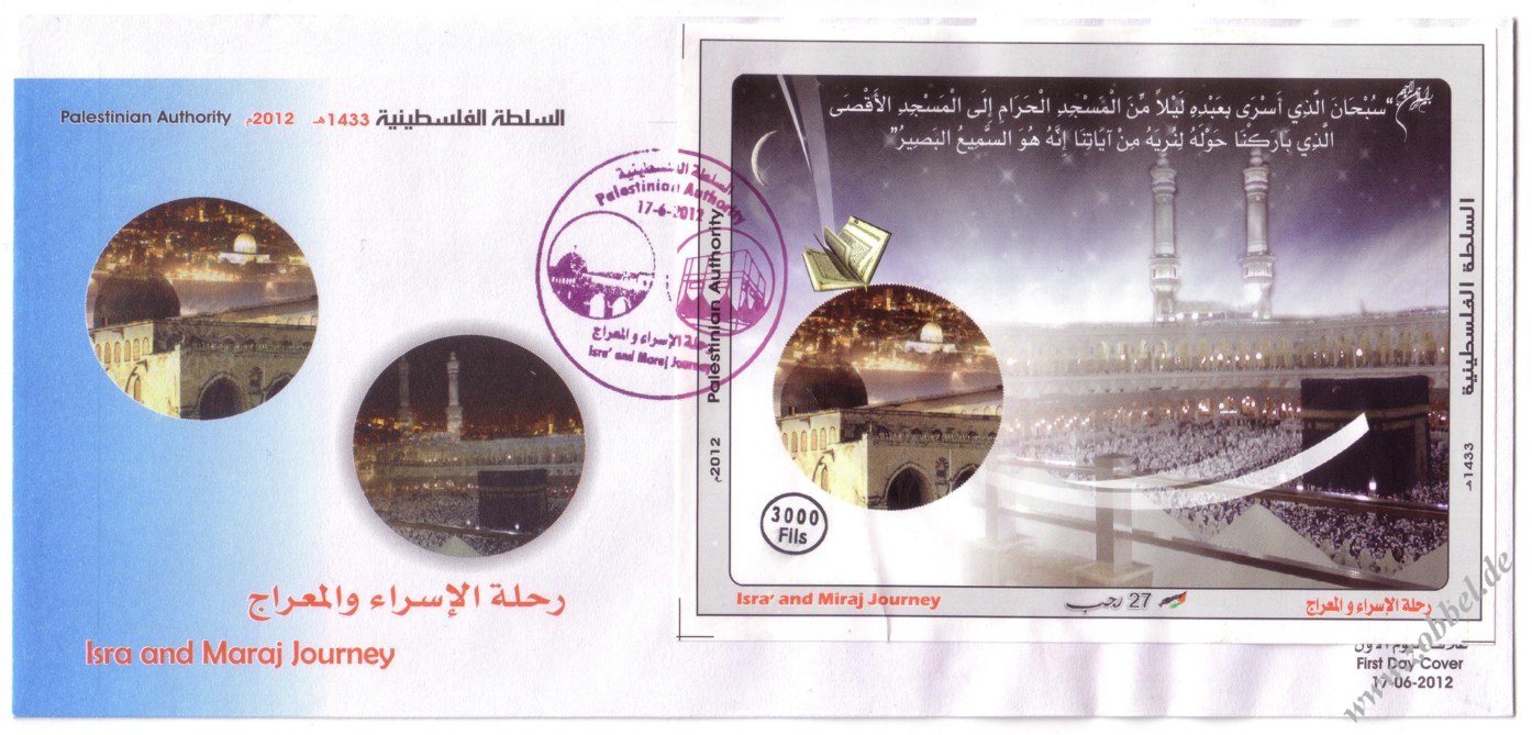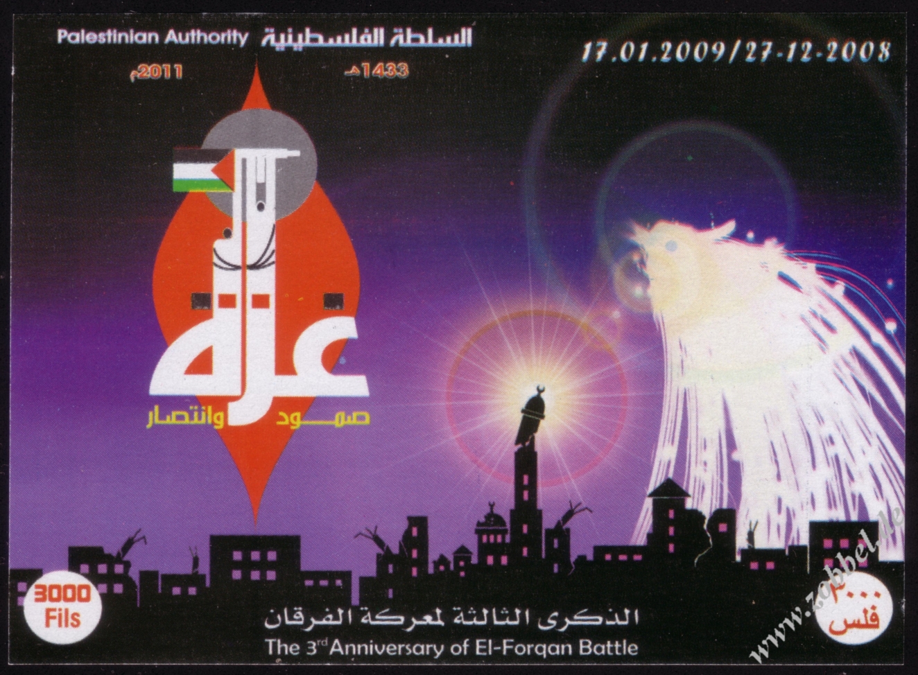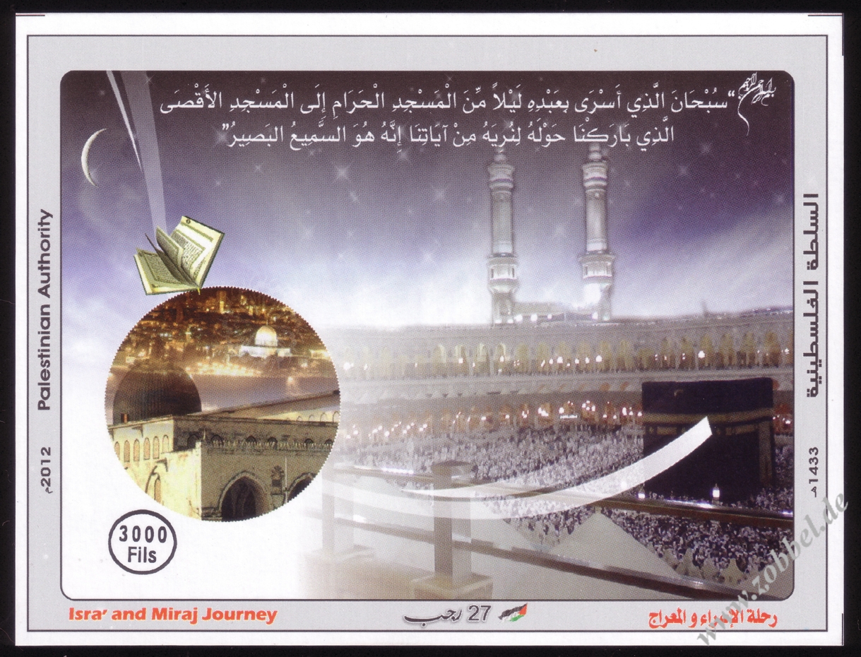 According to reports, the Hamas-controlled Ministry of Telecom & Information Technology in Gaza has issued on 24.12.2012 a stamp block under the slogan "Isra & Maraj Journey". The block is denominated for 3,000 Fils (print-run: 3,000).