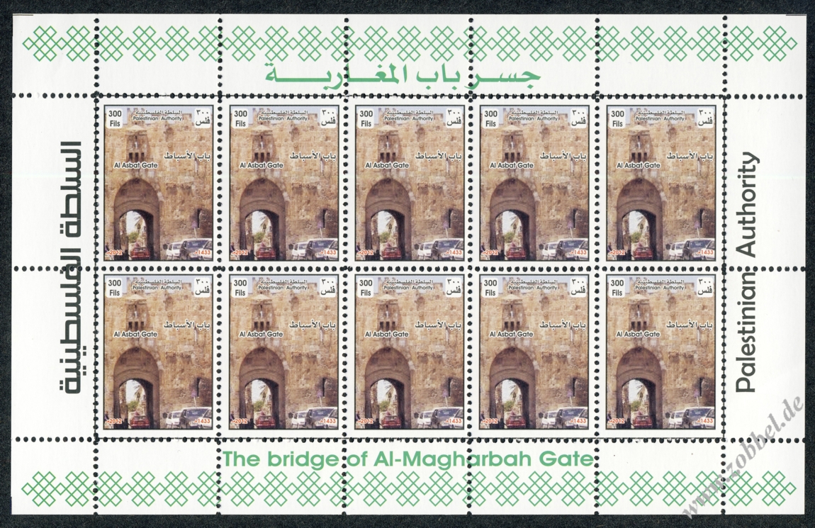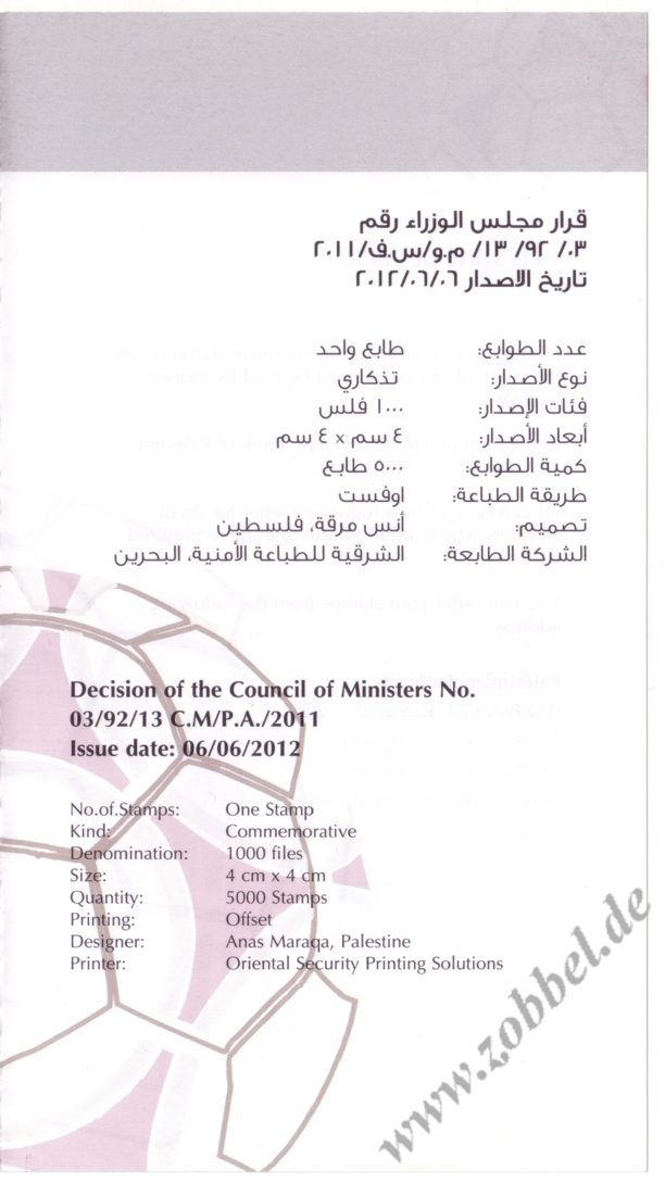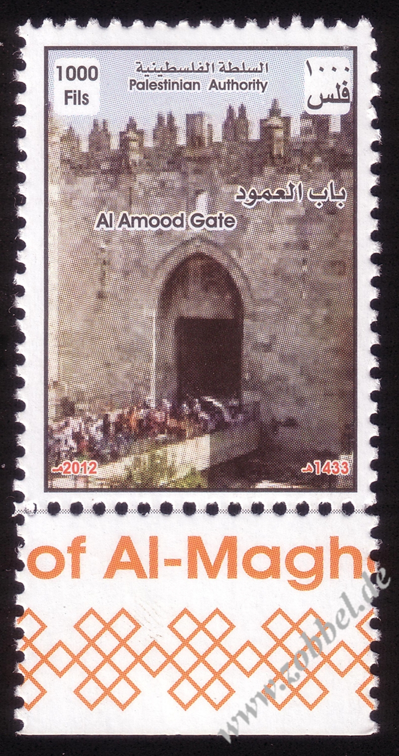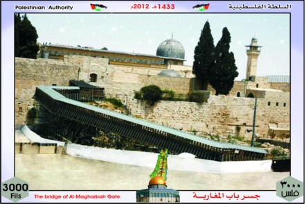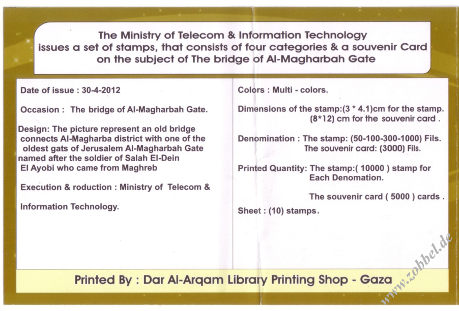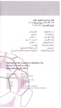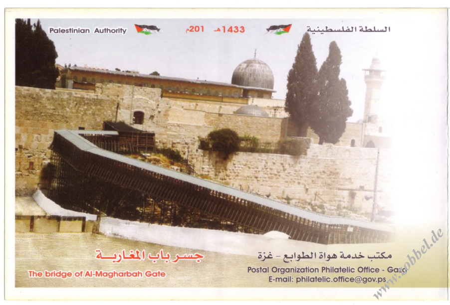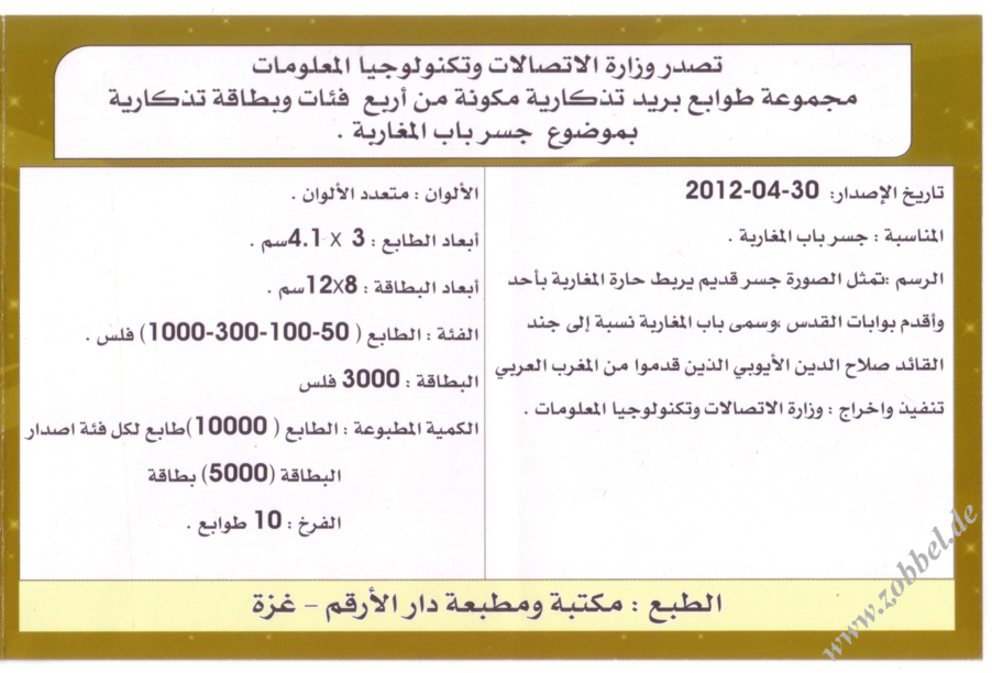 According to reports, the Hamas-controlled Ministry of Telecom & Information Technology in Gaza has issued on 24.12.2012 a stamp block under the slogan "Isra & Maraj Journey". The block is denominated for 3,000 Fils (print-run: 3,000).