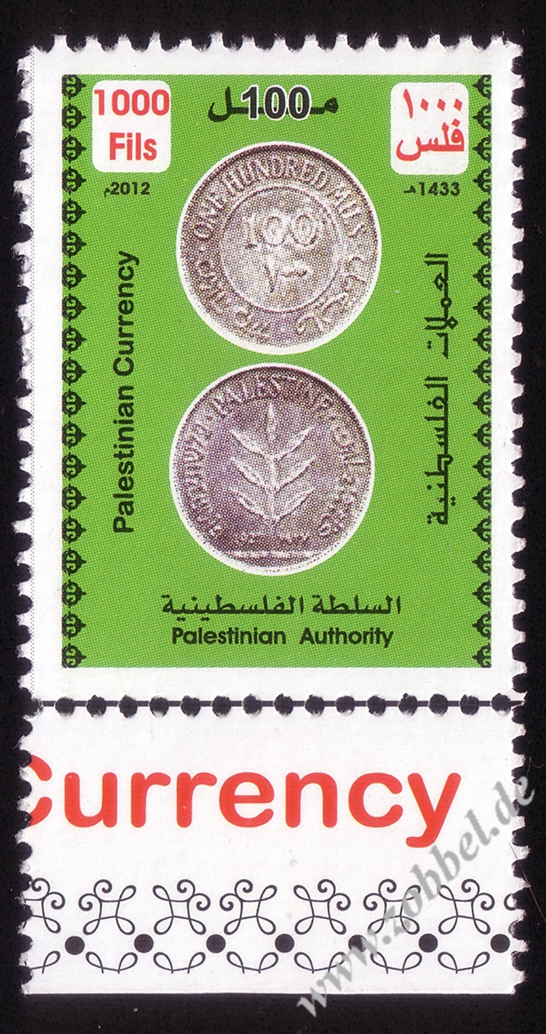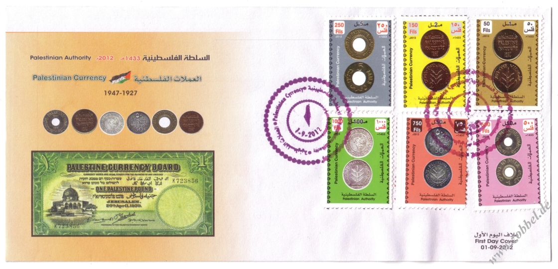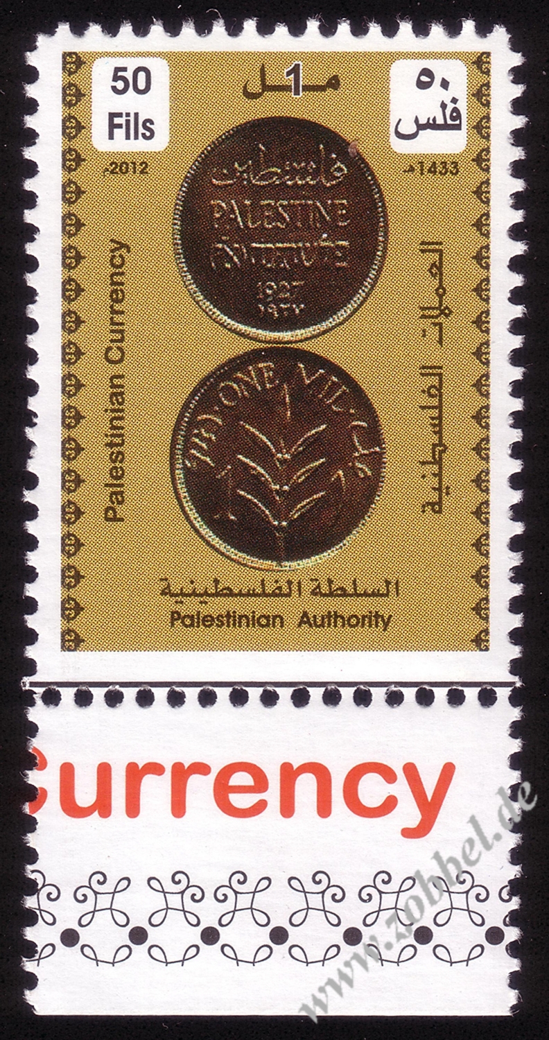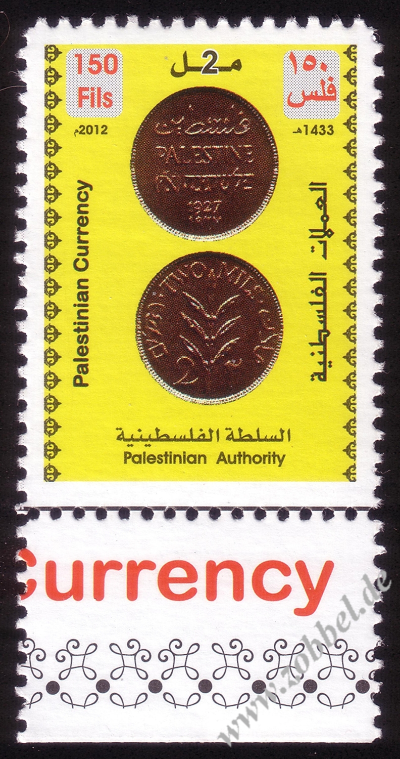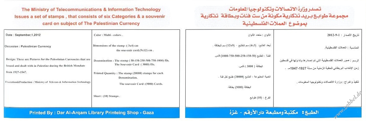 According to reports, the Hamas-controlled Ministry of Telecom & Information Technology in Gaza has issued on 24.12.2012 a series of stamps under the slogan "Palestinian Currency 1927–1947" containing six stamps at denominations of 50, 150, 250, 500, 750, and 1,000 Fils (print-run: 20,000), and a block of 3,000 Fils (print-run: 3,000).