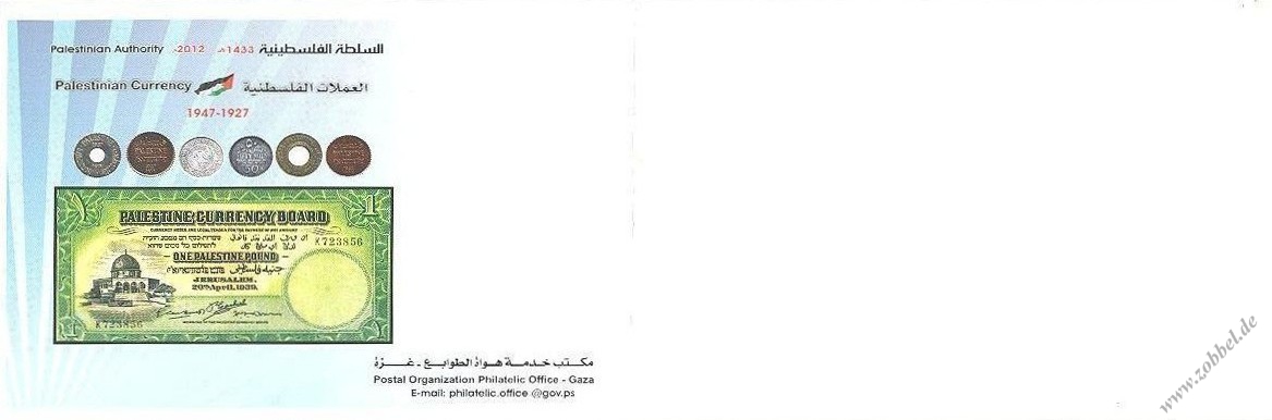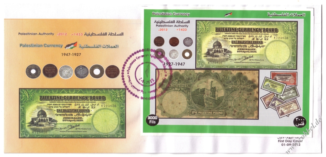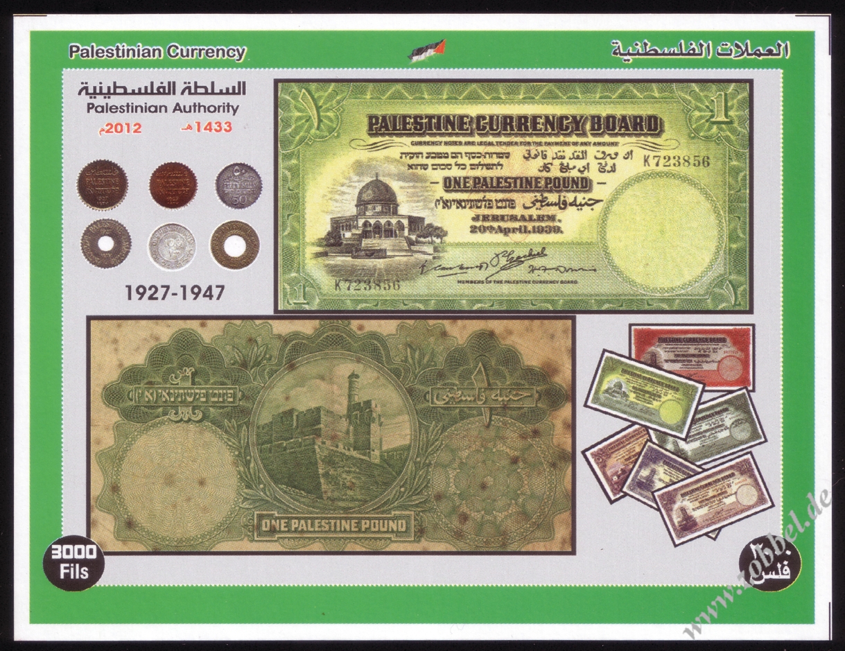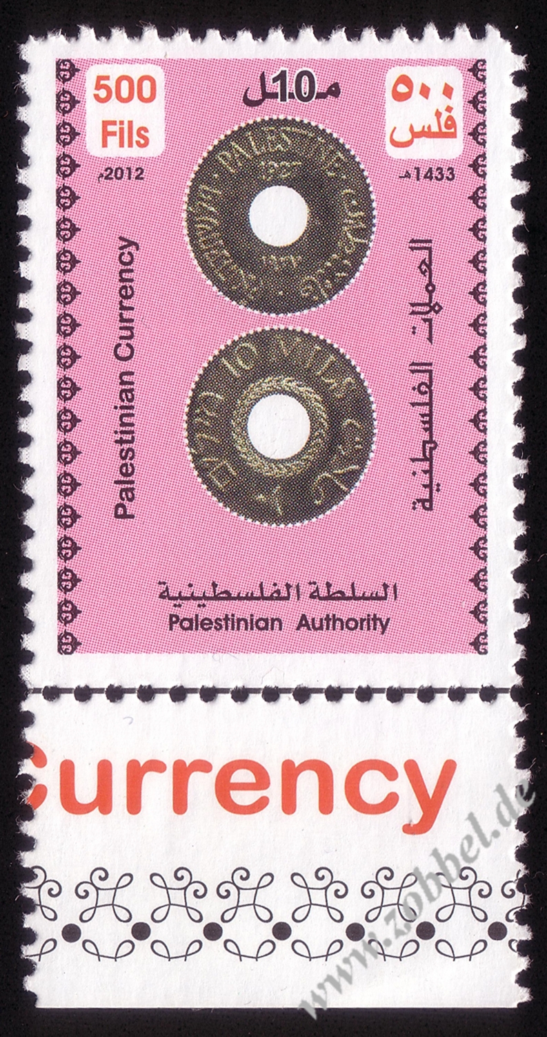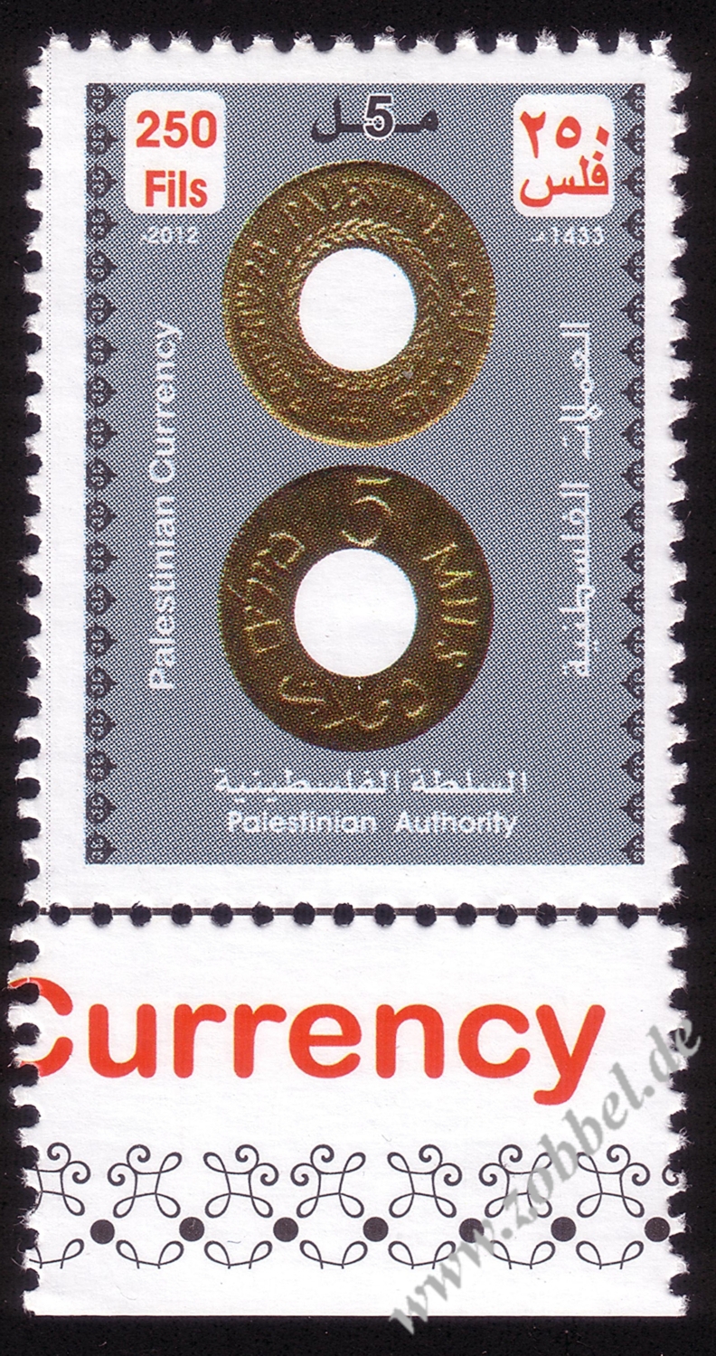 According to reports, the Hamas-controlled Ministry of Telecom & Information Technology in Gaza has issued on 24.12.2012 a series of stamps under the slogan "Palestinian Currency 1927–1947" containing six stamps at denominations of 50, 150, 250, 500, 750, and 1,000 Fils (print-run: 20,000), and a block of 3,000 Fils (print-run: 3,000).