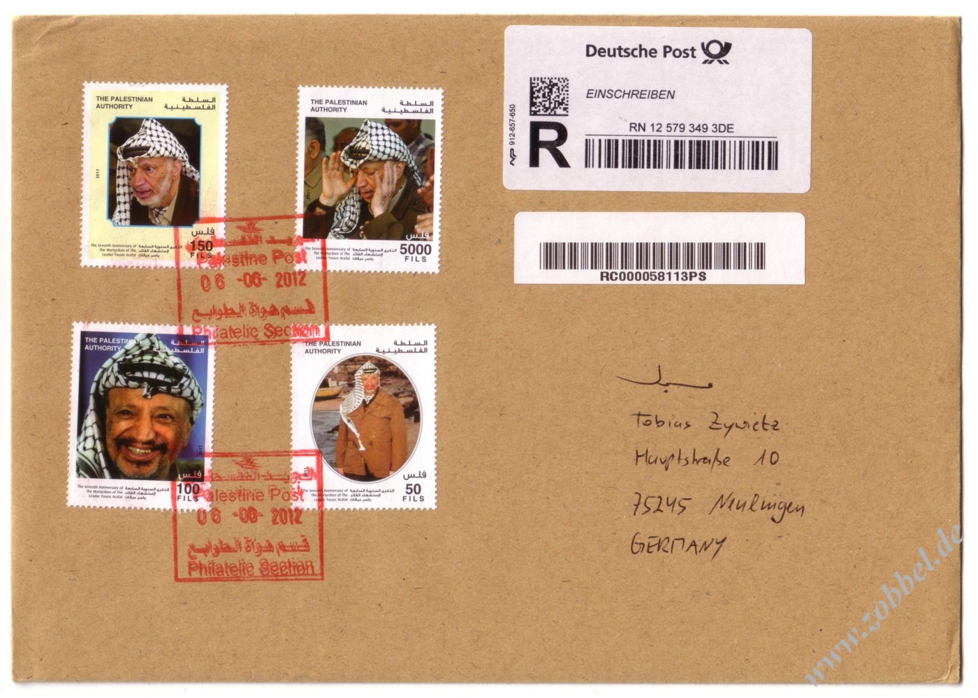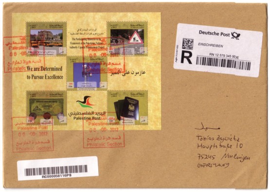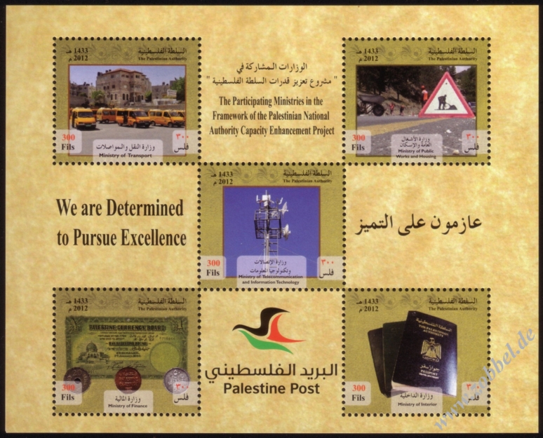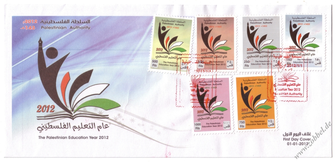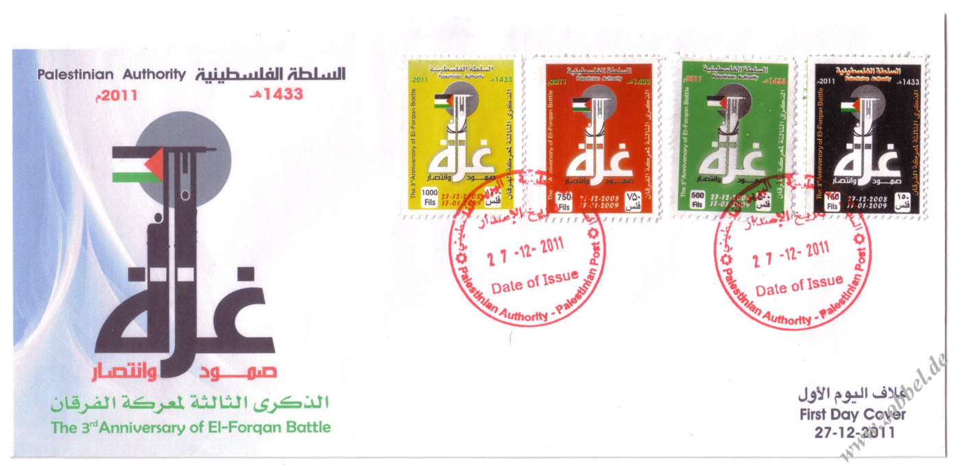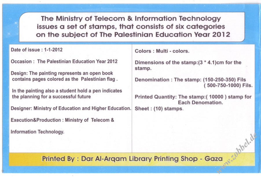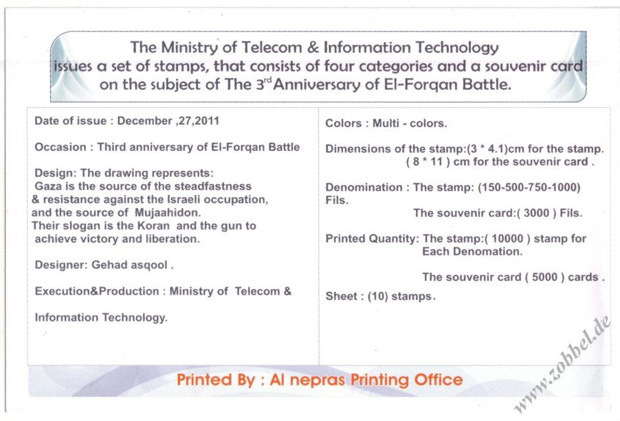 According to reports, the Hamas-controlled Ministry of Telecom & Information Technology in Gaza has issued on 24.12.2012 a series of stamps under the slogan "Palestinian Currency 1927–1947" containing six stamps at denominations of 50, 150, 250, 500, 750, and 1,000 Fils (print-run: 20,000), and a block of 3,000 Fils (print-run: 3,000).