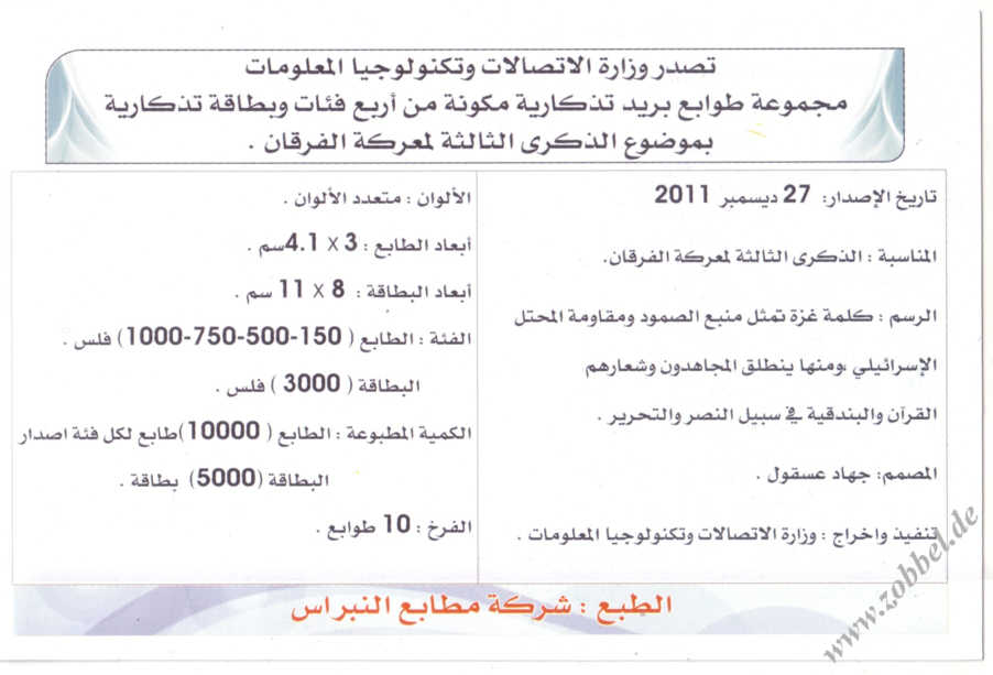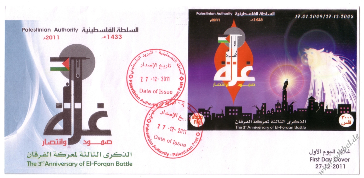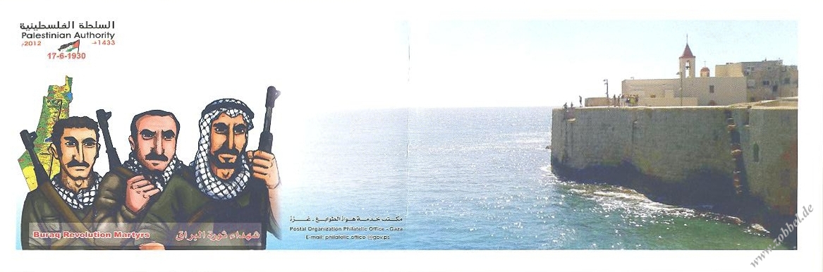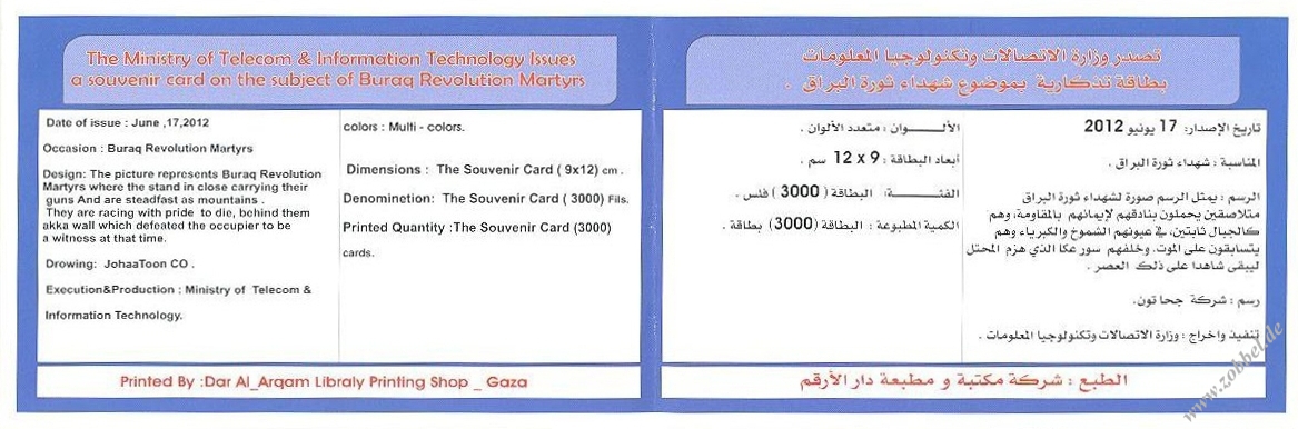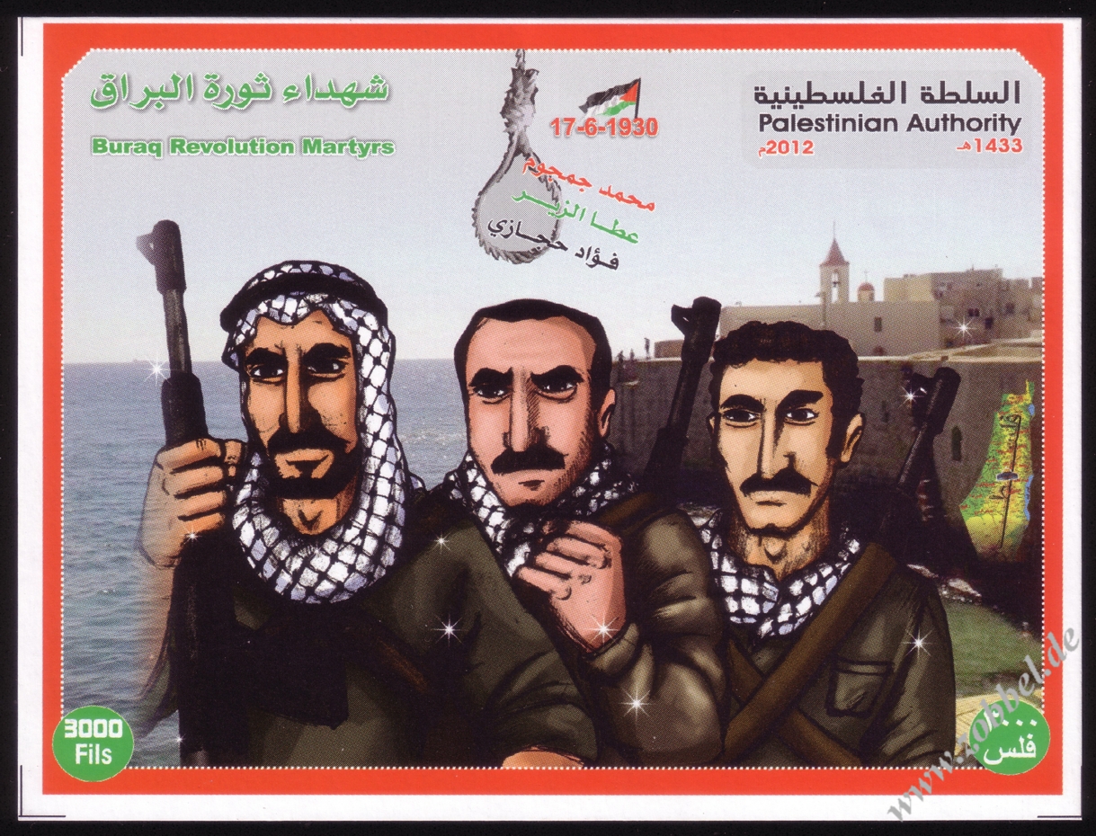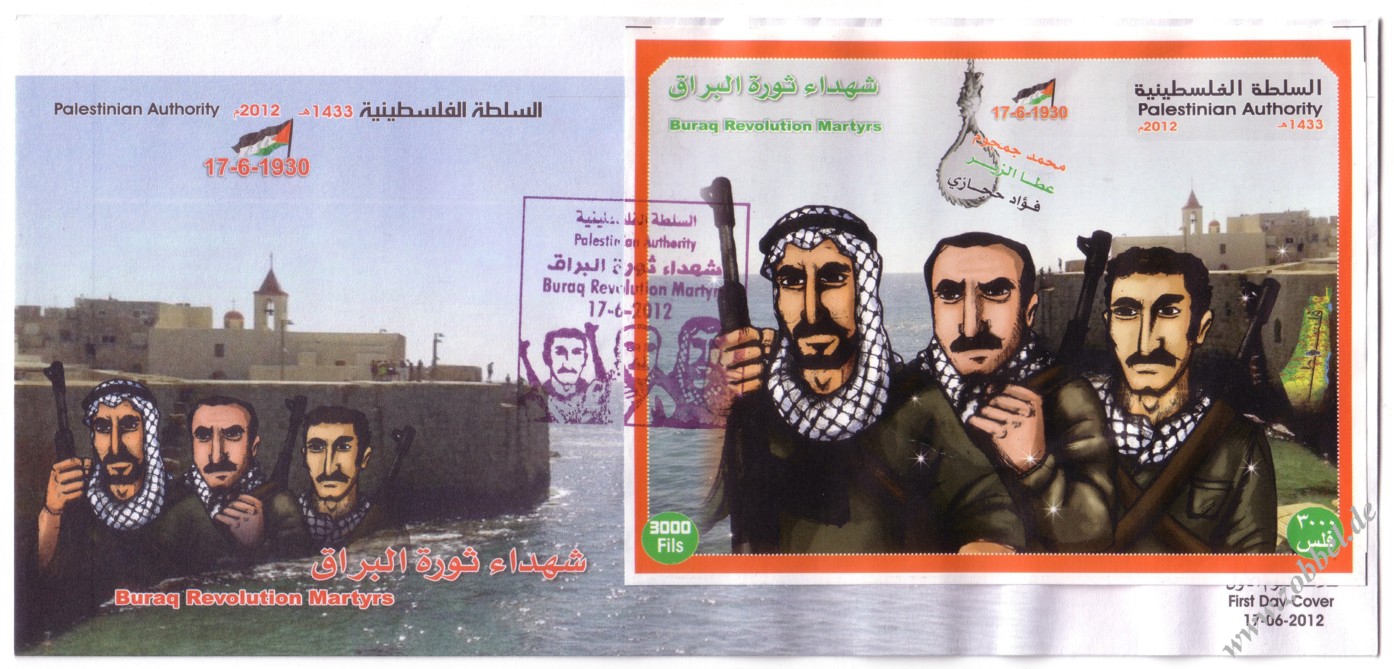 According to reports, the Hamas-controlled Ministry of Telecom & Information Technology in Gaza has issued on 24.12.2012 a stamp block under the slogan "Buraq Revolution Martyrs". The block is denominated for 3,000 Fils (print-run: 3,000).