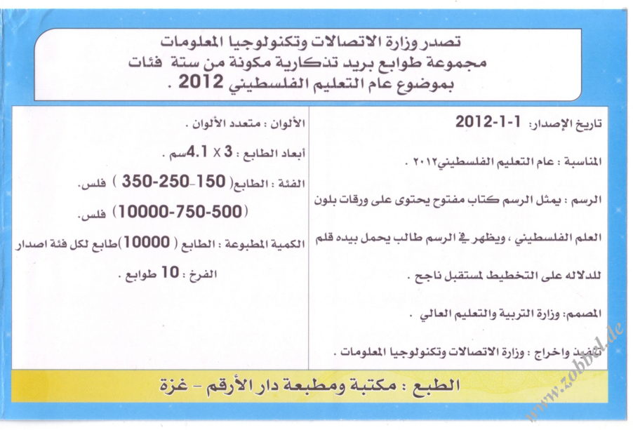 The ministry has started trading and selling these stamps in all post offices of the ministry and in the Philatelic Bureau at the Ministry Office in Gaza.
