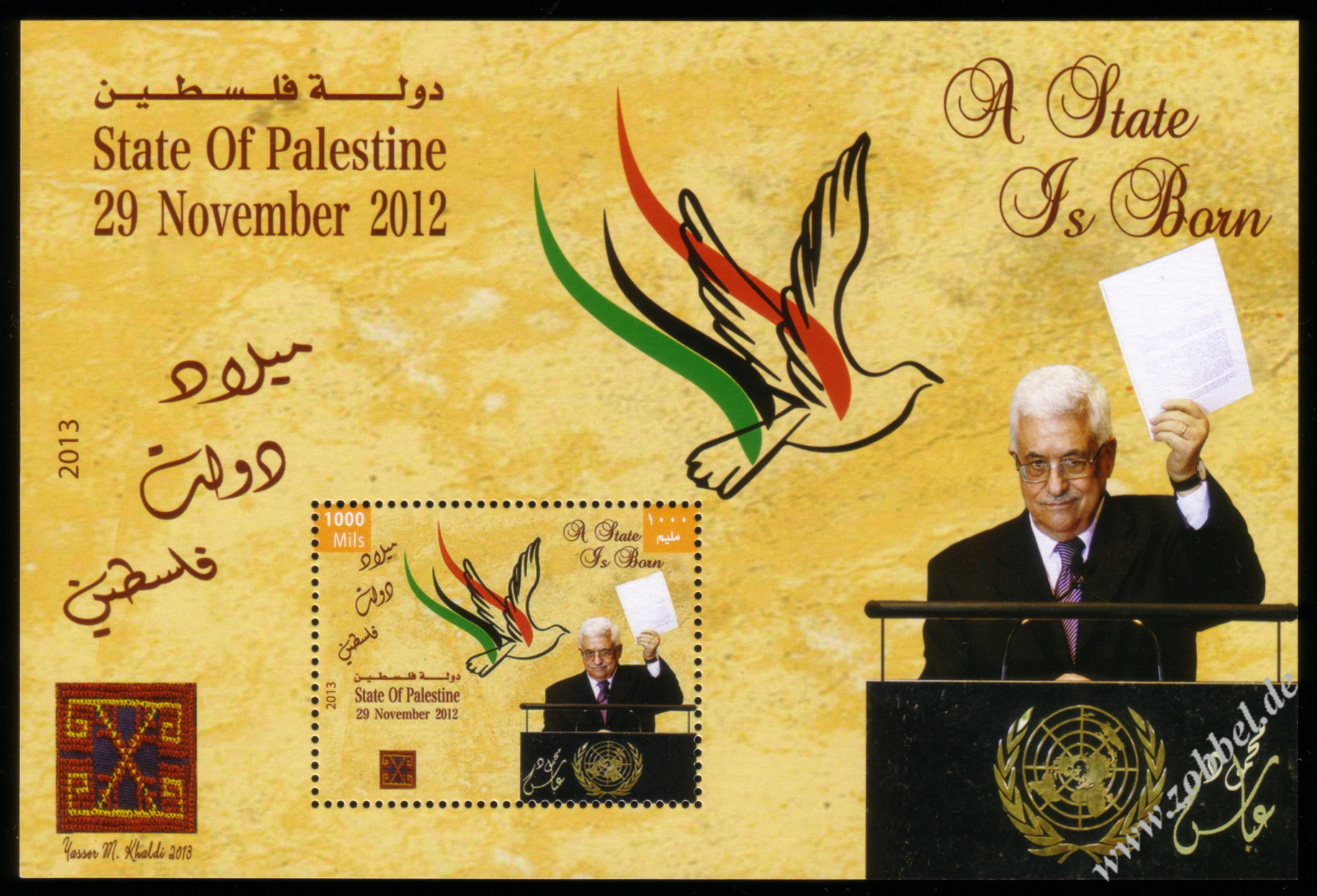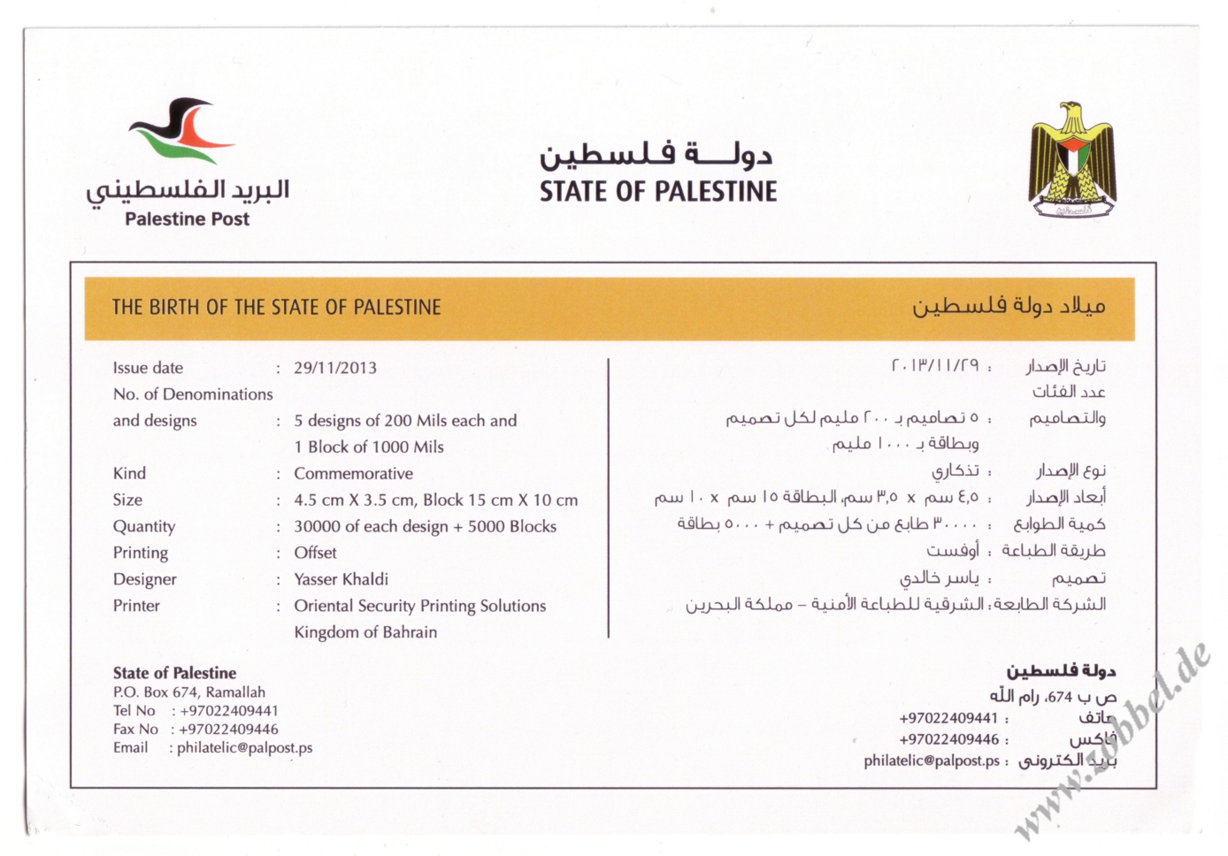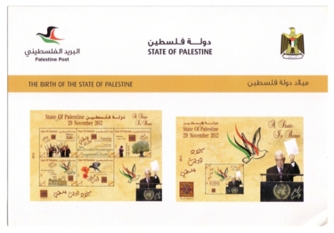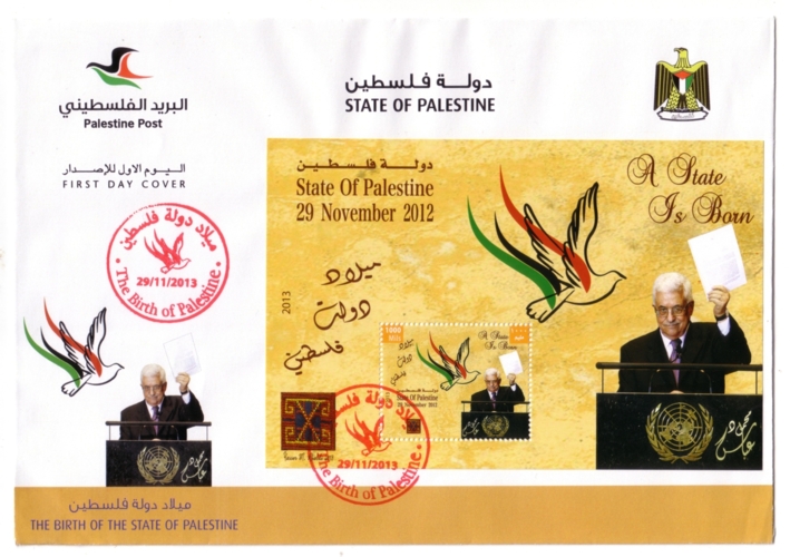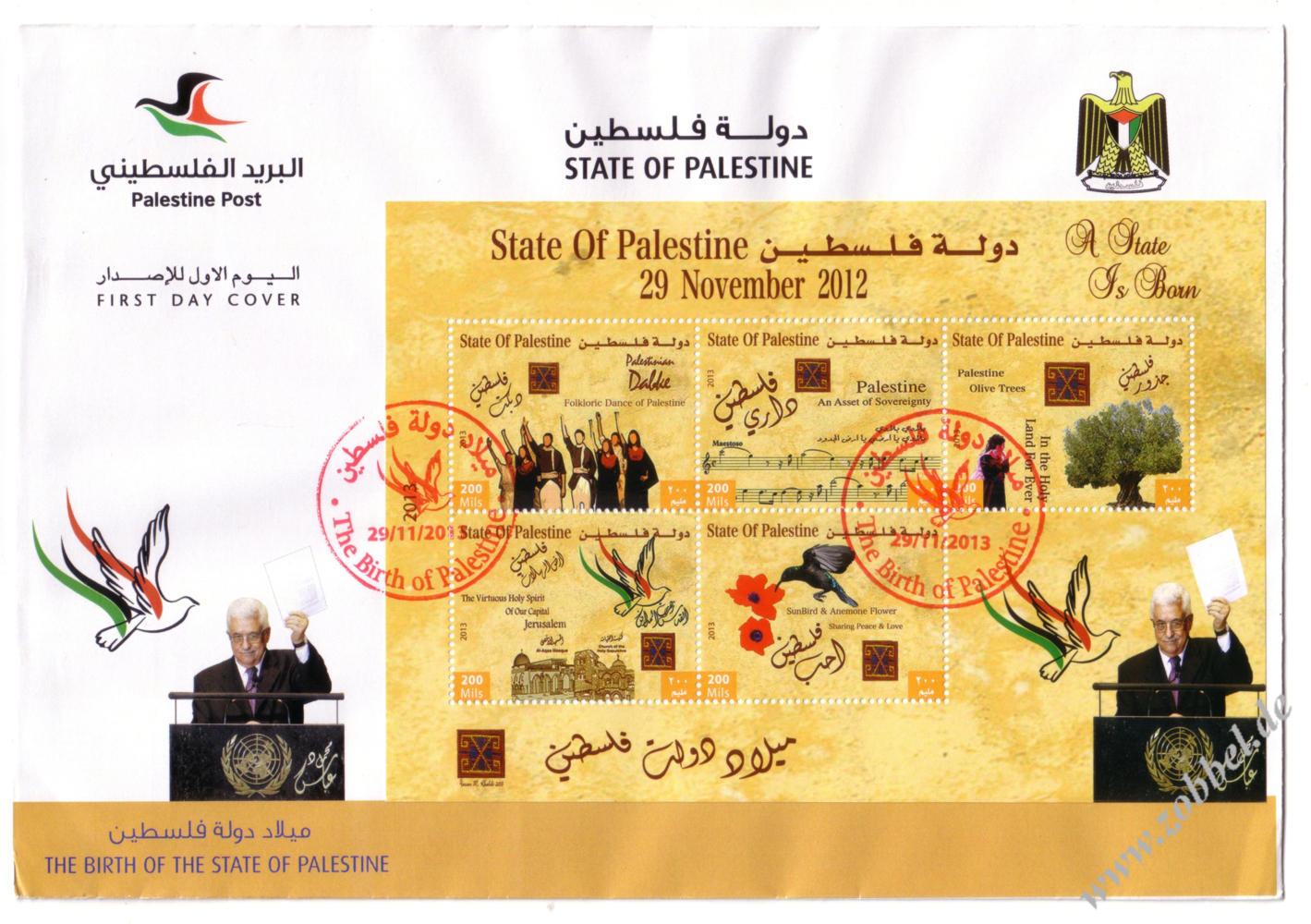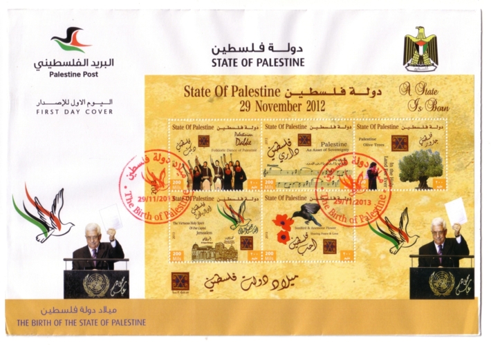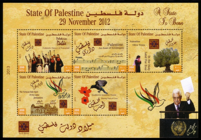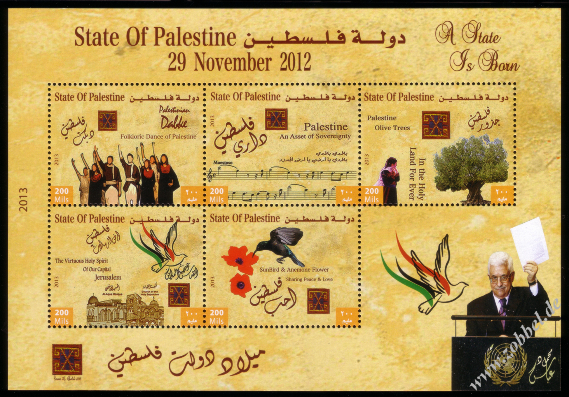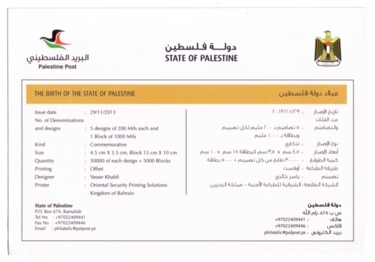 Palestine Post has issued in January 2014 the stamp series "A State is Born – The Birth of the State of Palestine" containing six stamps in two blocks. The issue was originally planned for 29.11.2013. Denominations are: 5x200 Mils (block 1), and 1,000 Mils (block 2).