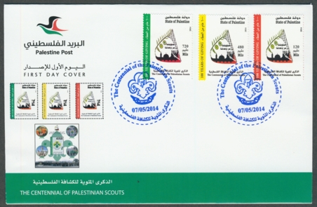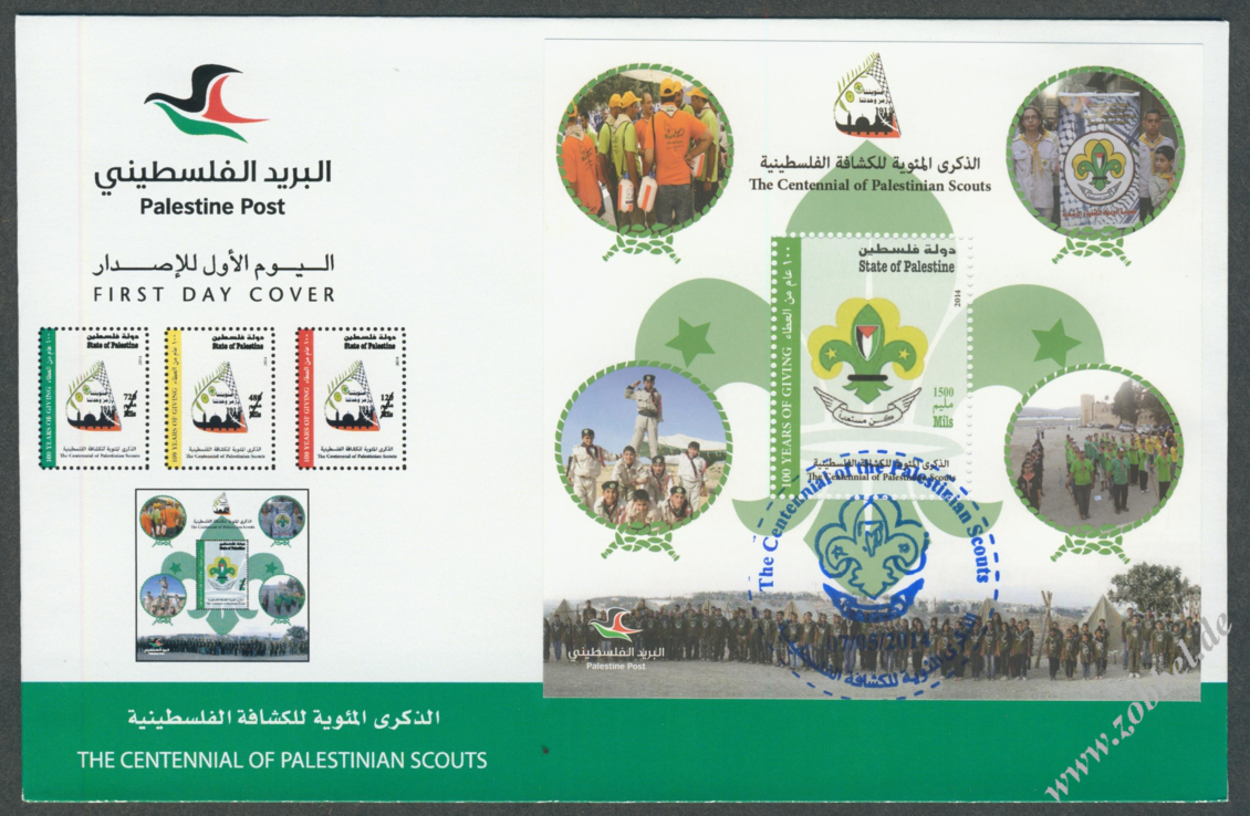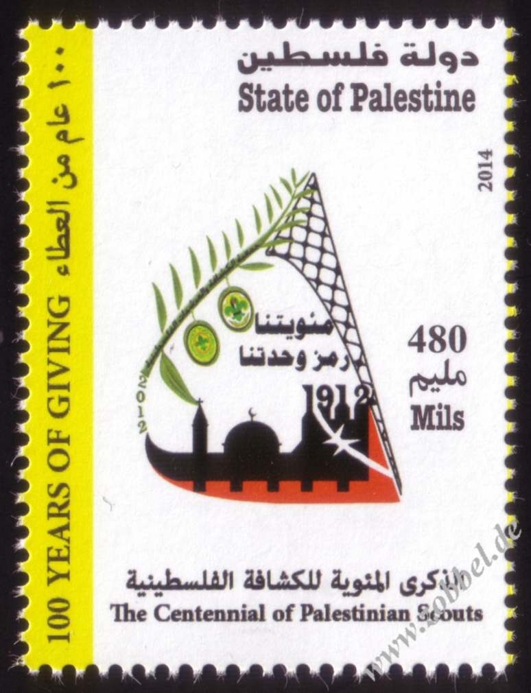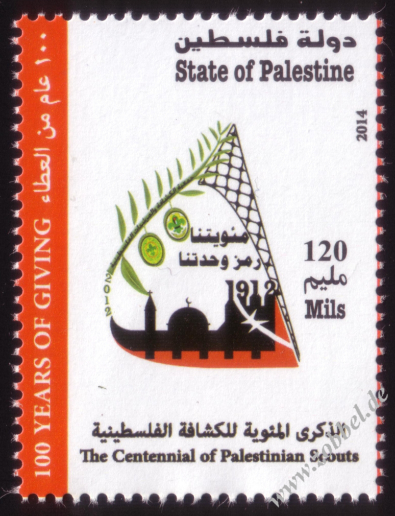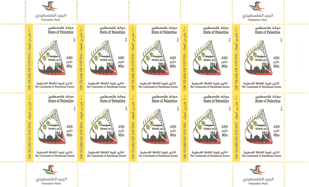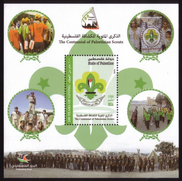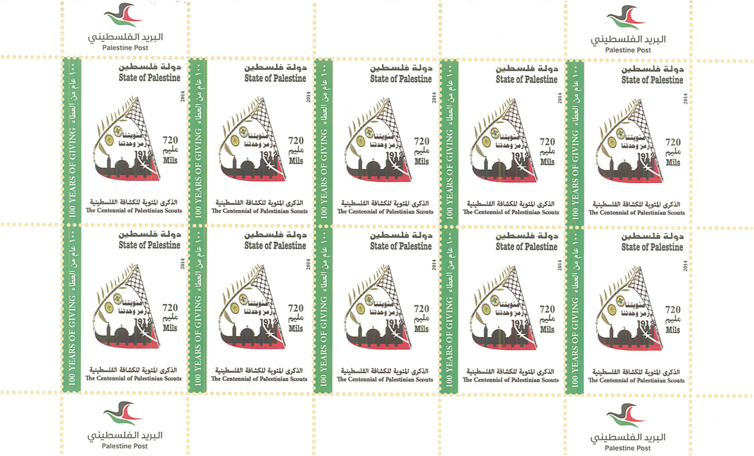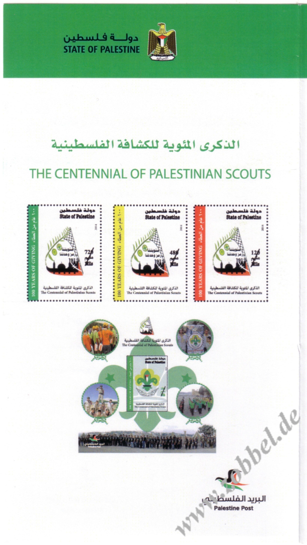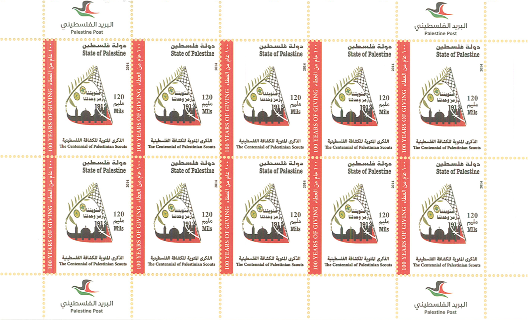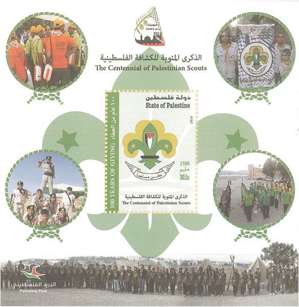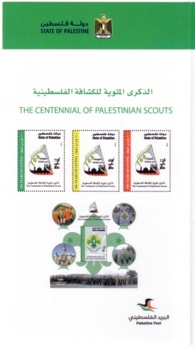 According to reports, Palestine Post has publically unveiled on 13.11.2013 the block (1,000 Fils) commemorating the "Centenery of the Palestinian Scout Movement". Details were unclear, the block remained unissued. Please see the report on the ceremony of issue on the ministry's website.