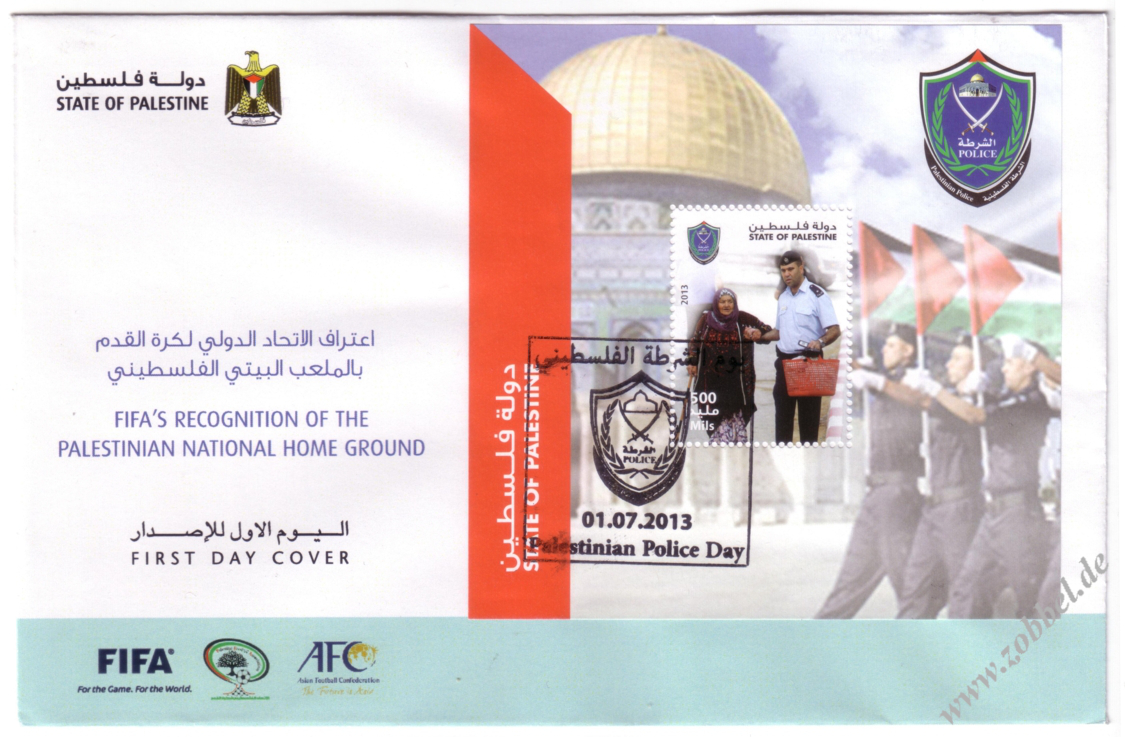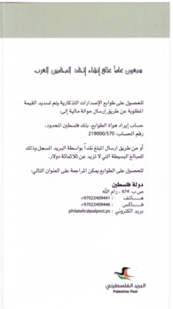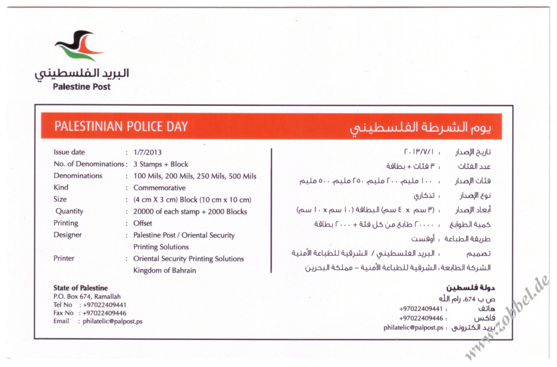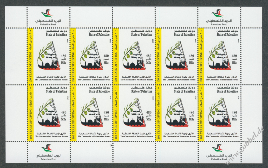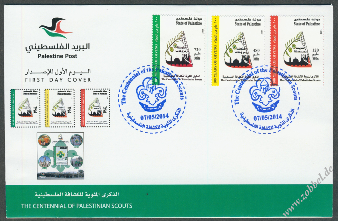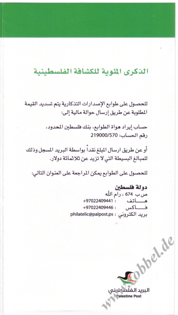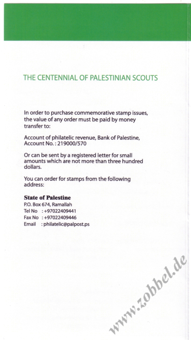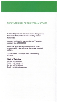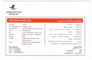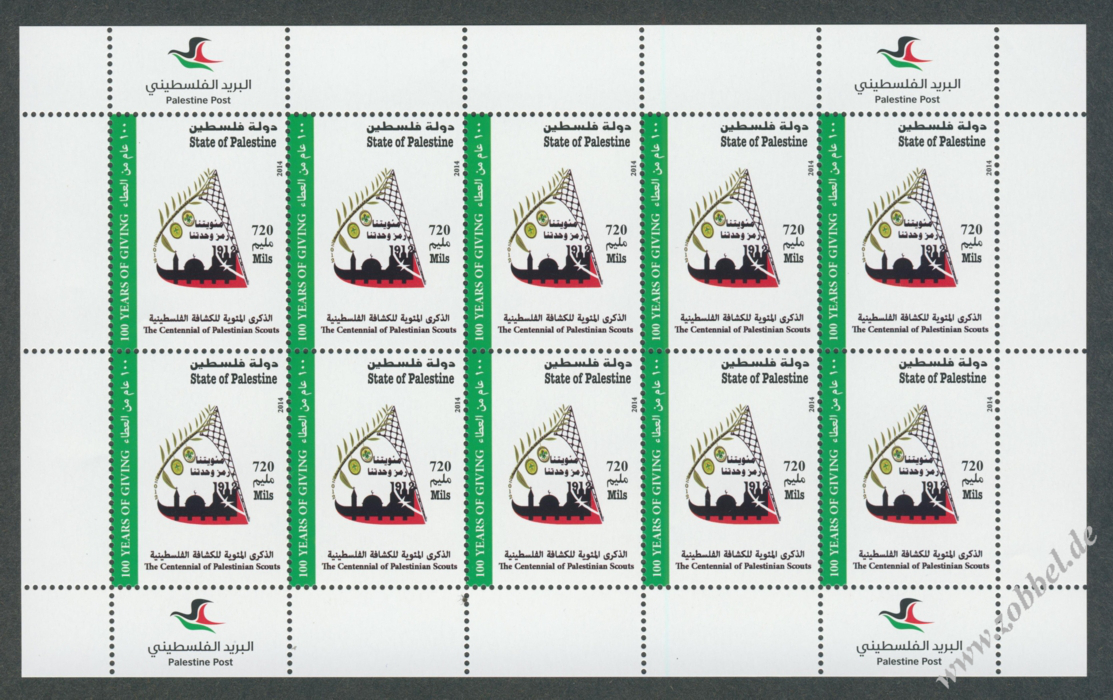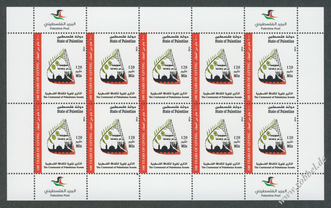 According to reports, Palestine Post has publically unveiled on 13.11.2013 the block (1,000 Fils) commemorating the "Centenery of the Palestinian Scout Movement". Details were unclear, the block remained unissued. Please see the report on the ceremony of issue on the ministry's website.