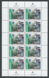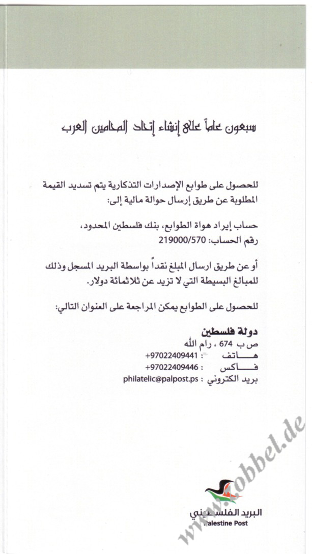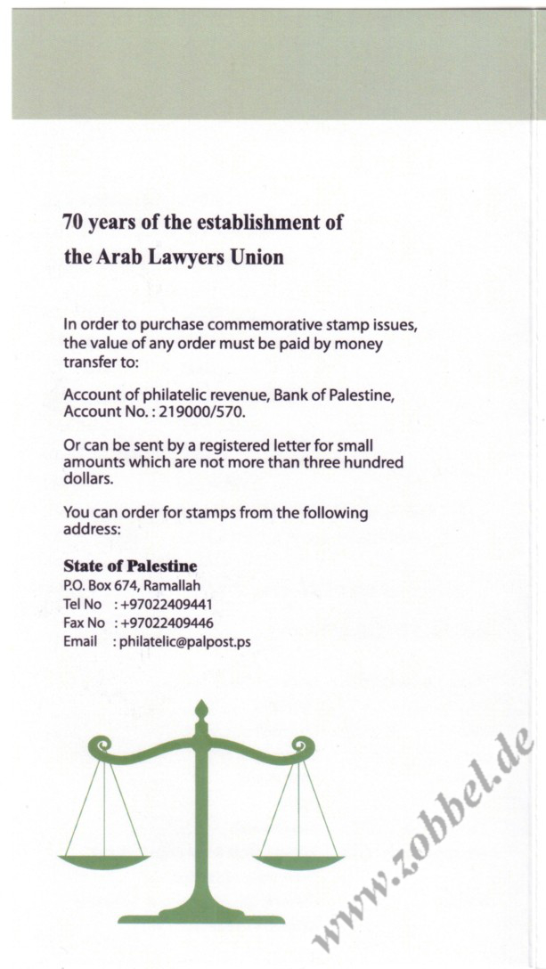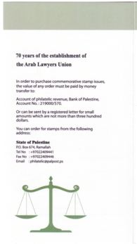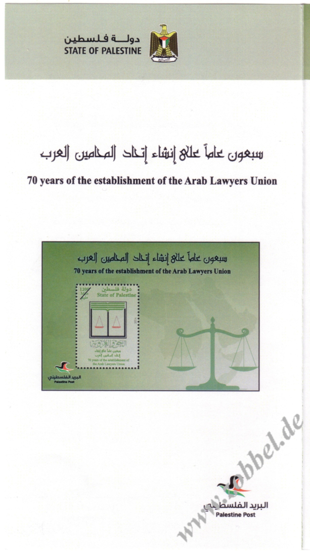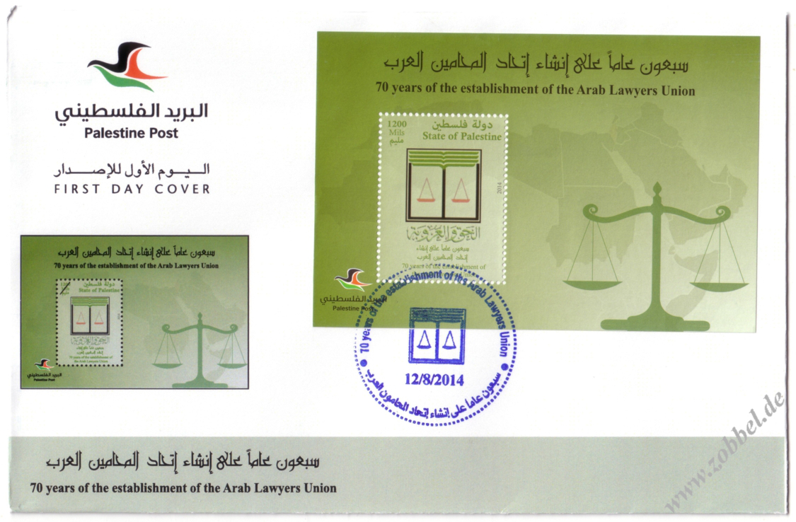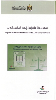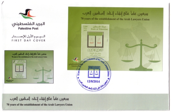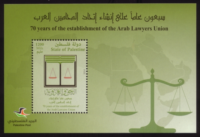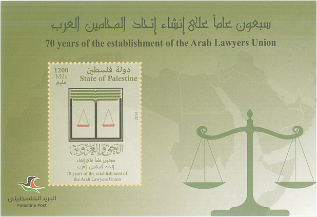 According to reports, Palestine Post has released on 1.09.2014 a stamp block commemorating "70 Years of the Establisment of the Arab Lawyers Union" containing one stamp denominated at 1,200 Mils. The block was designed by Anas Maraqa and 5,000 copies were printed by Oriental Security Printing Solution, Bahrain. The Arab Lawyers' Union (ALU) or Union des avocats arabes (UAA) is an international Arab non-governmental organization founded in 1944, made up of unions and associations of lawyers elected in the Arab world; based in Cairo, it has a consultative status with the UN, UNESCO, the African Union and other organisations.