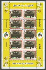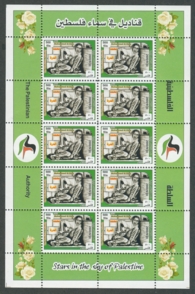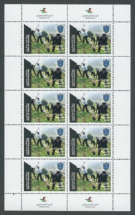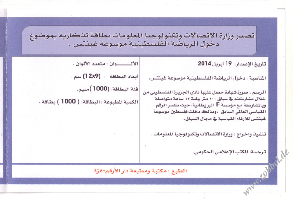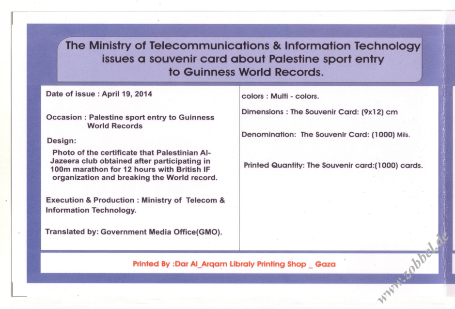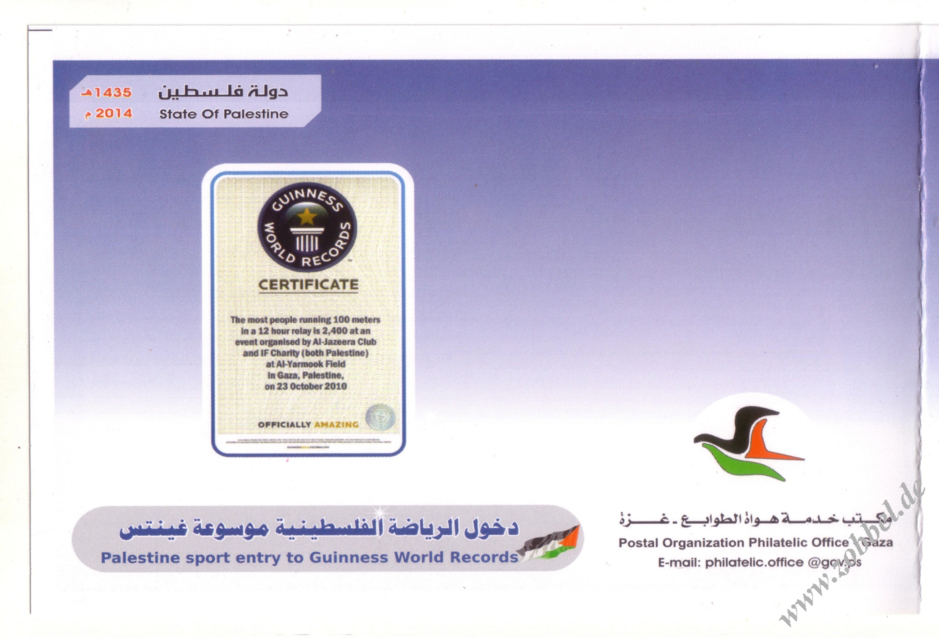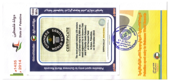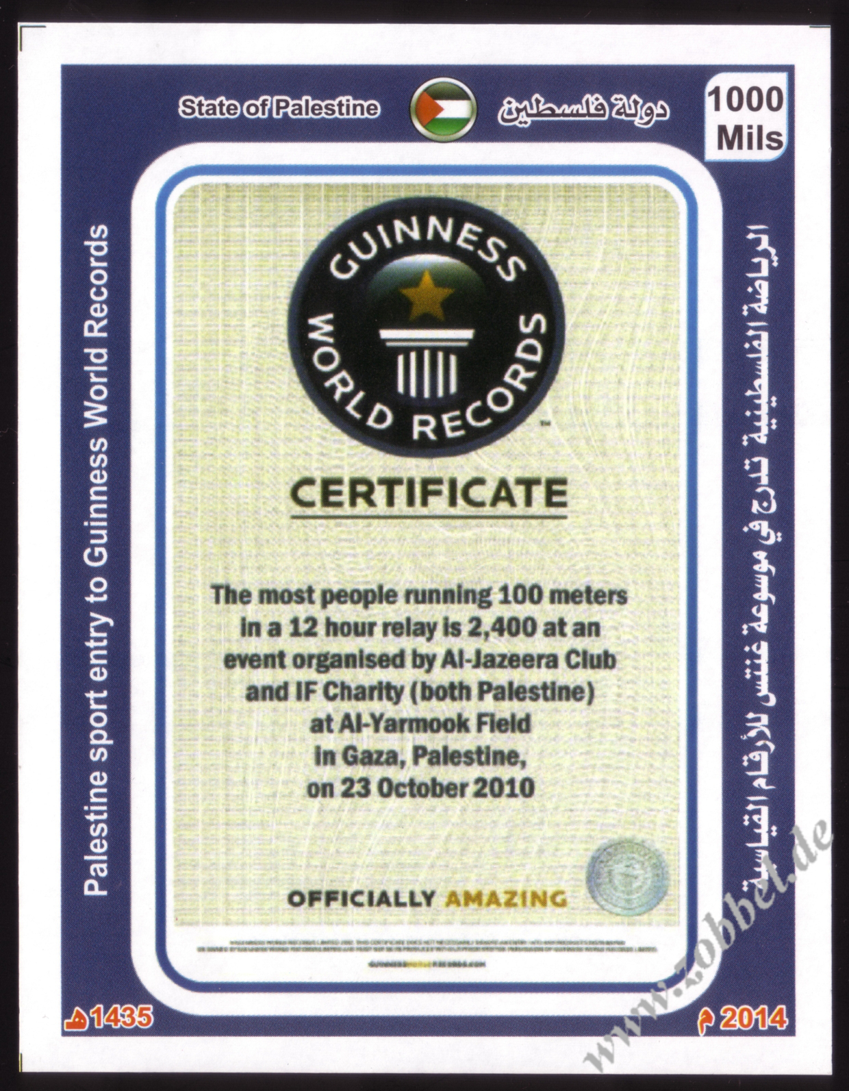 According to reports, the Ministry of Telecom & Information Technology in Gaza has issued in November 2014 a block under slogan "Palestine Sport Entry to Guinness World Records" celebrating the record for the most people (2,400) running 100-metre-relays in 12 hours at al-Yarmouk Field, Gaza on 23.10.2010. It consists of a block denominated at 1,000 Mils. The block is sized xmm (exact size can vary) and unperforated. Only 1,000 copies were printed locally by Dar al-Arqam Library Printing Shop, Remal. The nominal issue date is 19.04.2014 (postmark on FDC). The previous record was set also in Gaza (2009: 1,675 runners). The 2010 event was timed to highlight the arrival of the Lifeline aid convoy in Gaza. There were sympathy runs organized in Birmingham, Bradford, Cardiff, Glasgow. The record was overtaken by "Padova for Children" in Italy on 1.06.2013 (2,407 runners).
