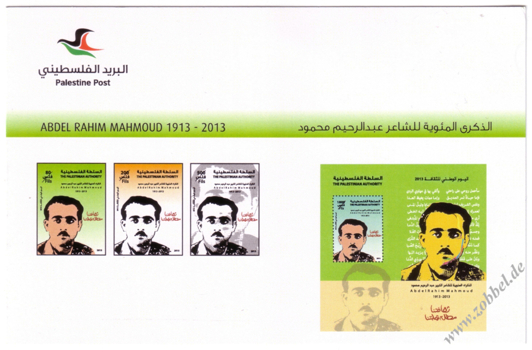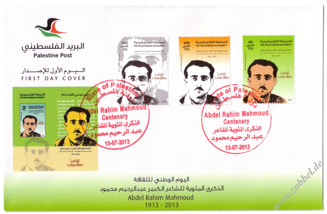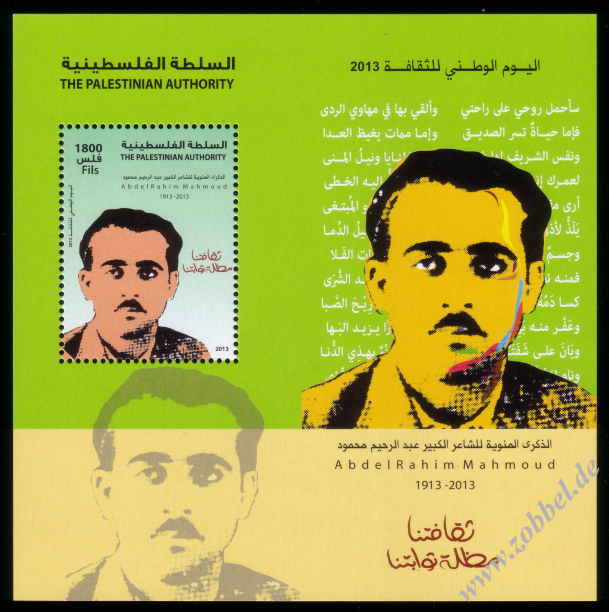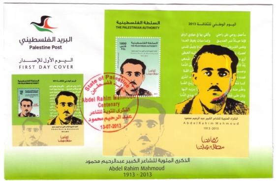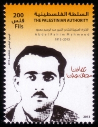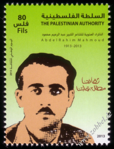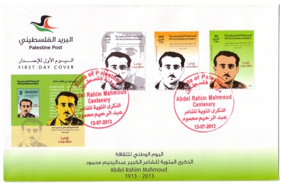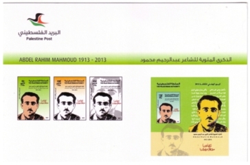 Palestine Post has issued in January 2014 a stamp series celebrating the 100th birthday of the prominent poet and martyred freedom fighter Abd el-Rahim Mahmoud (عبد الرحيم محمود, Abdel Rahim Mahmoud, born 1913 in 'Anabta, died near Nazareth, 13.04.1948) originally planned for 13.07.2013.