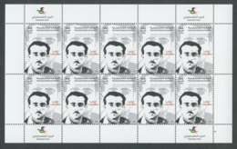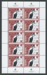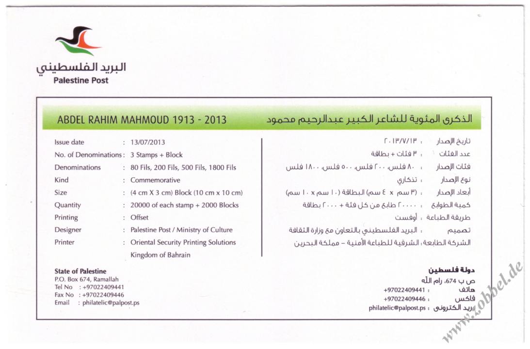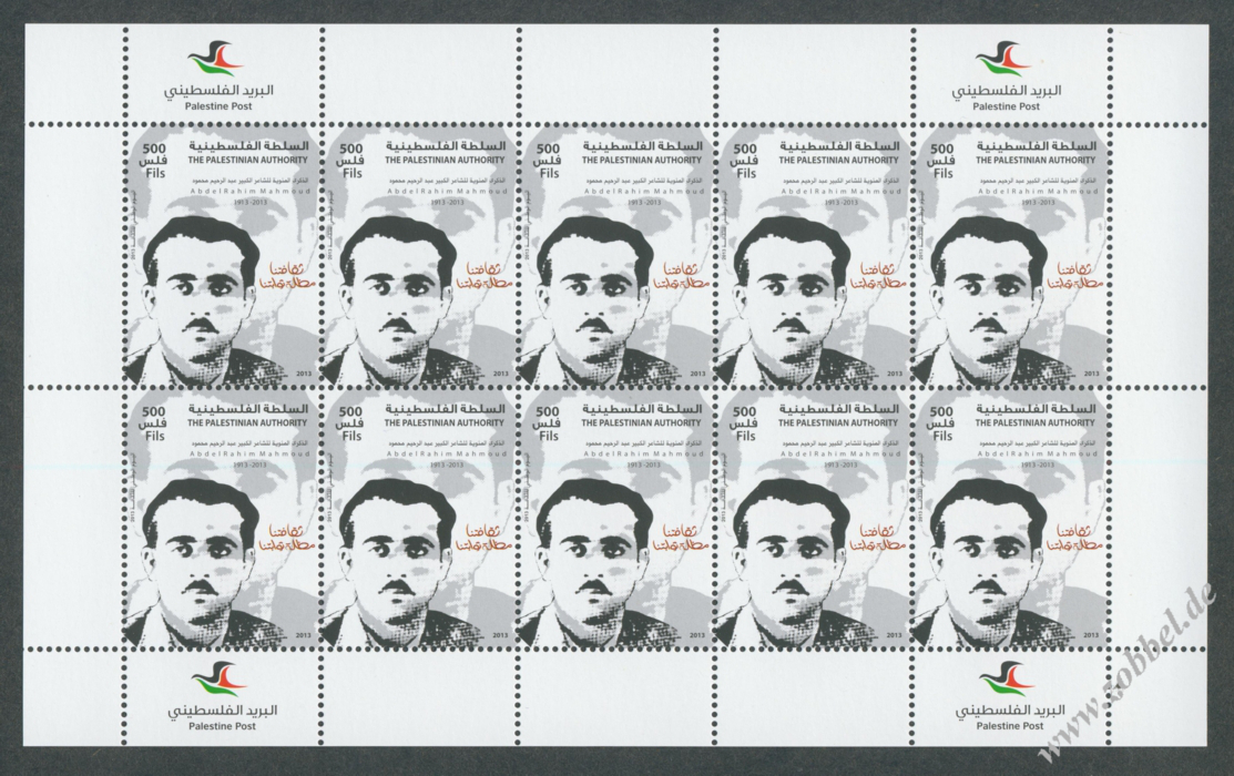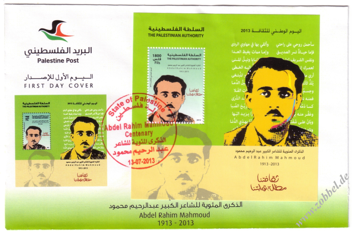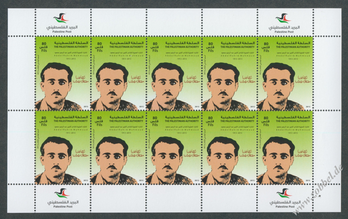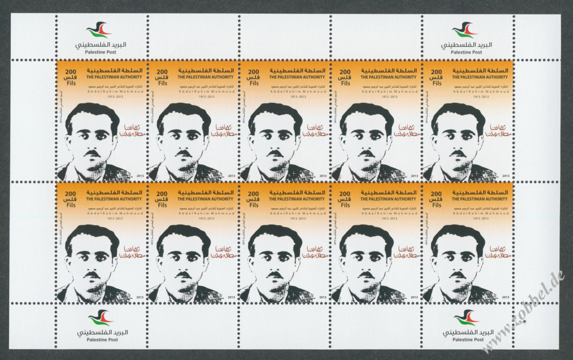 Palestine Post has issued in January 2014 a stamp series celebrating the 100th birthday of the prominent poet and martyred freedom fighter Abd el-Rahim Mahmoud (عبد الرحيم محمود, Abdel Rahim Mahmoud, born 1913 in 'Anabta, died near Nazareth, 13.04.1948) originally planned for 13.07.2013.