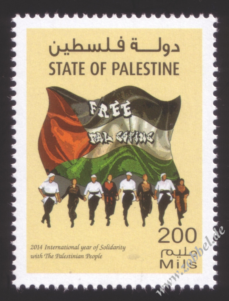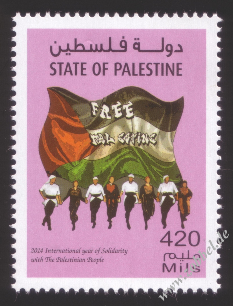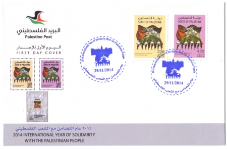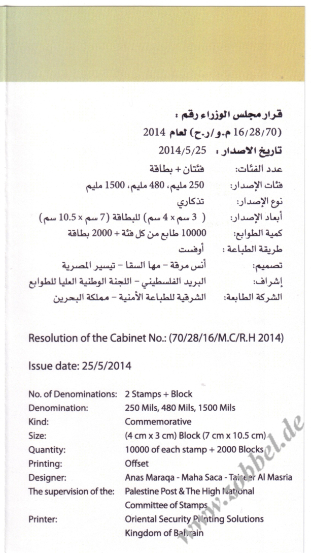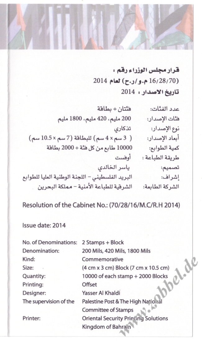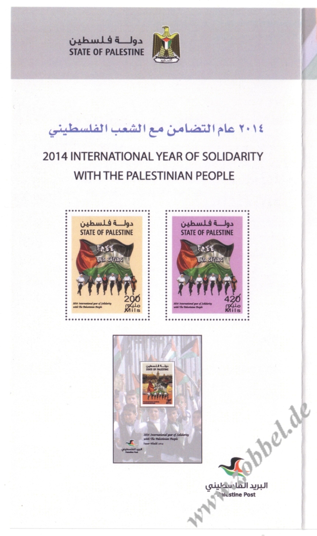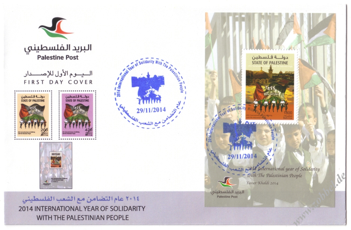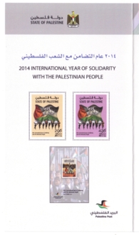 According to reports, Palestine Post has released in December 2014 a stamp series on the topic of "2014 - International Year of Solidarity with the Palestinian People" conisting of two stamps and one block. Issue day is 29.11.2014, the International Day of Solidarity with the Palestinian People. The issue was designed by Yasser Majdi Al-Khaldi (an archicture student and artist at AUC Cairo). Denominations are: 200 and 420 Mils (stamps), and 1,800 Mils (block). Printed by Oriental Security Printing Solution, Bahrain in sheets of 10 (5x2): 10,000 stamps each and 2,000 blocks.
