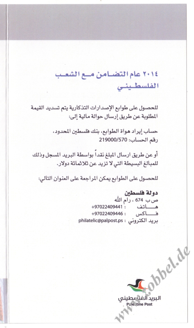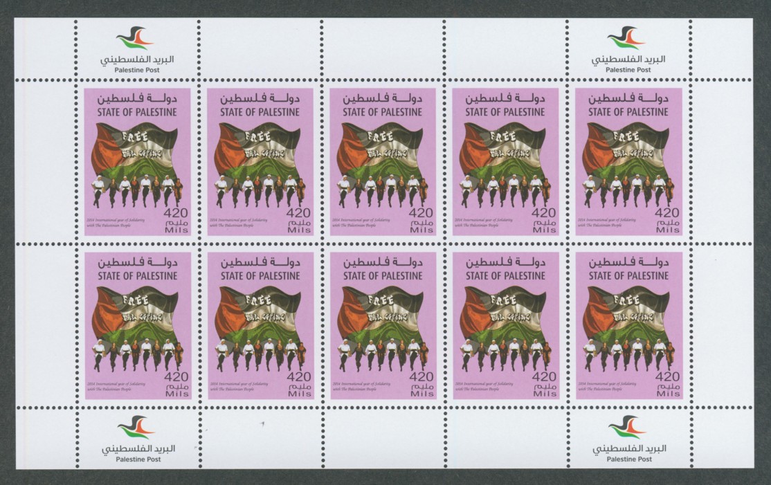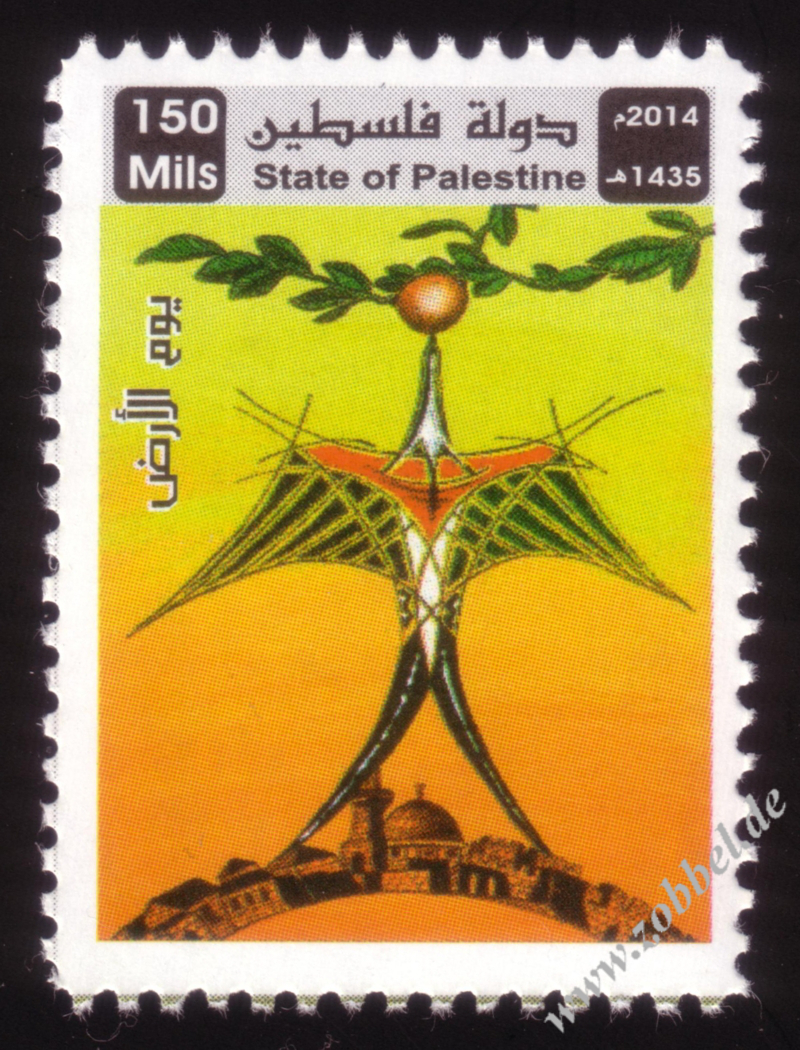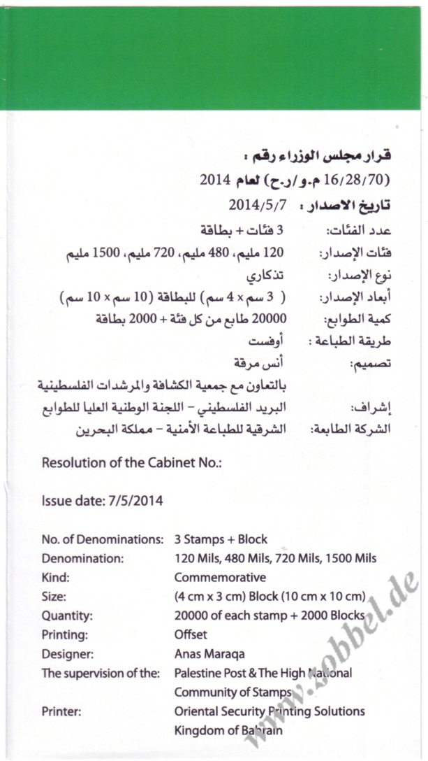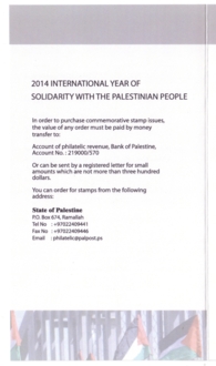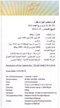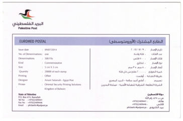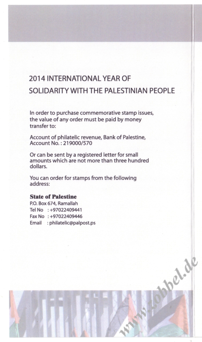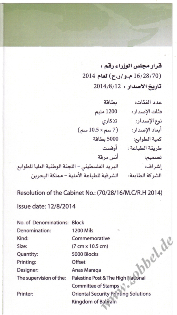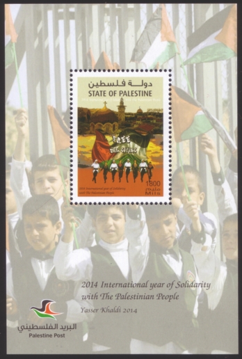 According to reports, Palestine Post has released in December 2014 a stamp series on the topic of "2014 - International Year of Solidarity with the Palestinian People" conisting of two stamps and one block. Issue day is 29.11.2014, the International Day of Solidarity with the Palestinian People. The issue was designed by Yasser Majdi Al-Khaldi (an archicture student and artist at AUC Cairo). Denominations are: 200 and 420 Mils (stamps), and 1,800 Mils (block). Printed by Oriental Security Printing Solution, Bahrain in sheets of 10 (5x2): 10,000 stamps each and 2,000 blocks.